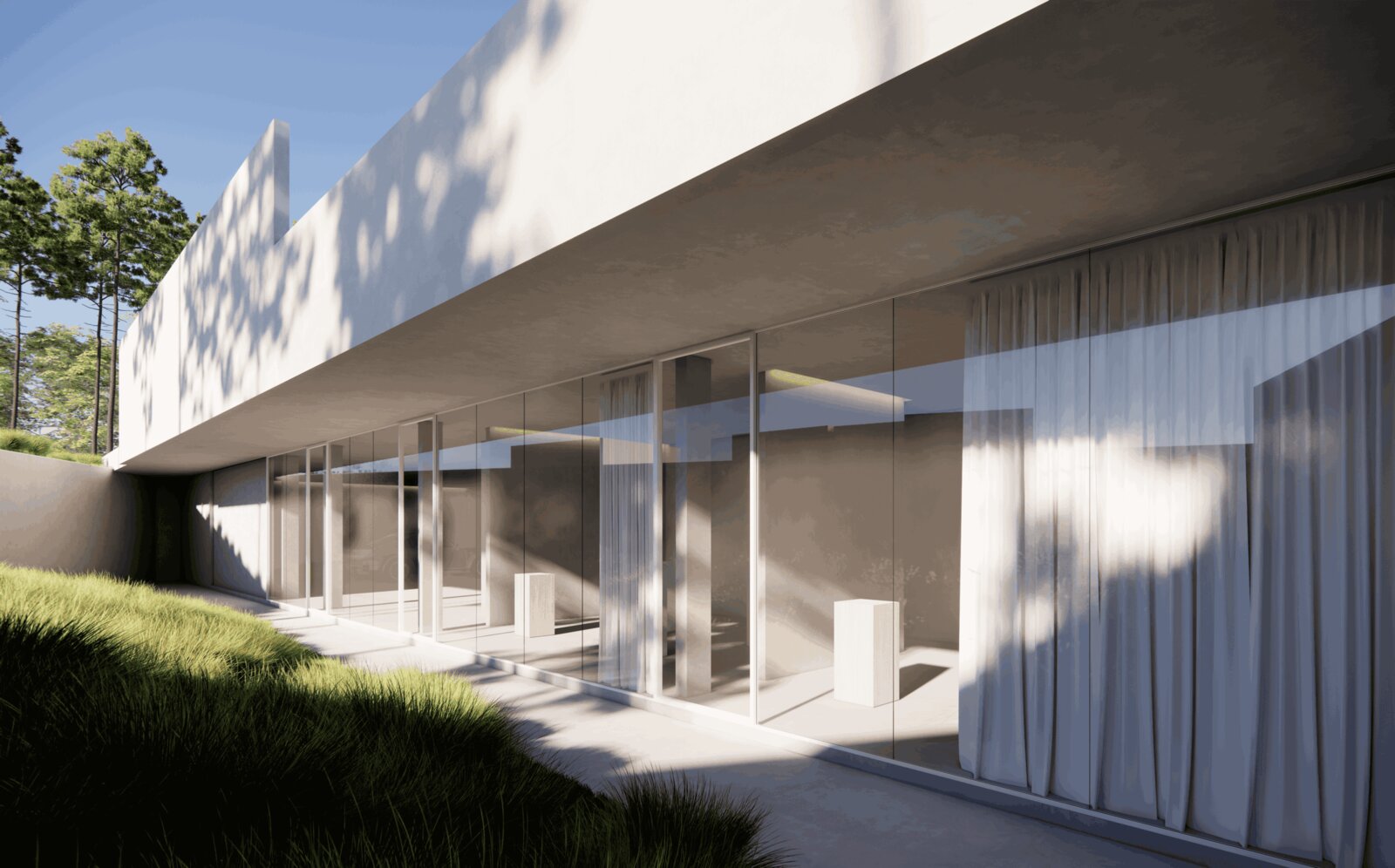 Dans ce projet, le plus grand nombre d’arbres existants est préservé. La teinte sobre gris clair contraste élégamment avec la verdure environnante, la mettant en valeur sans compromettre l’architecture impressionnante.