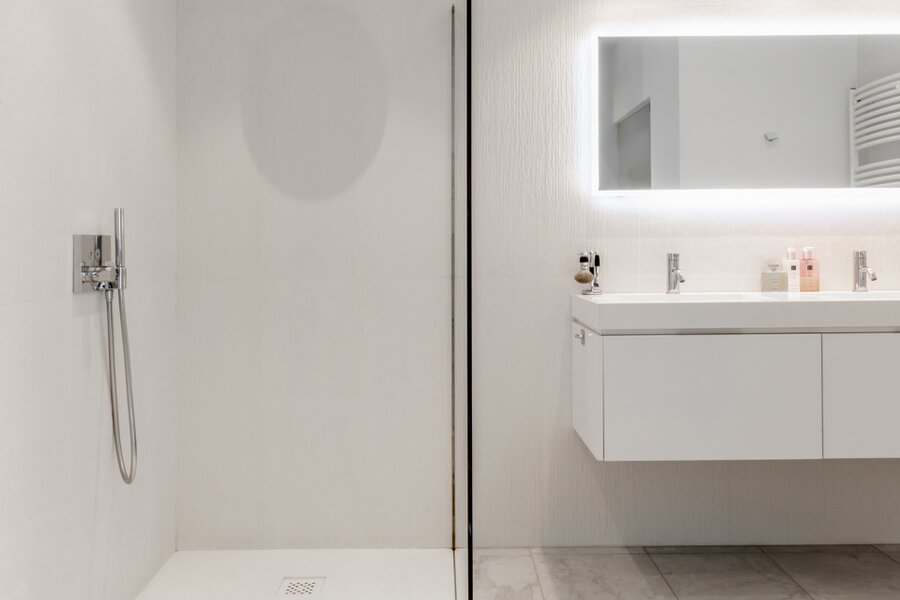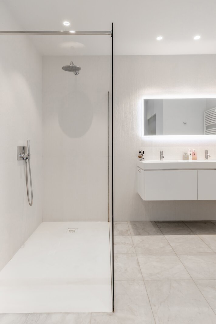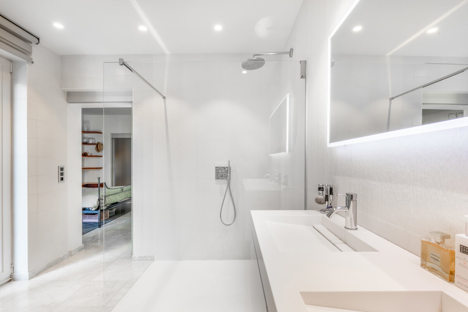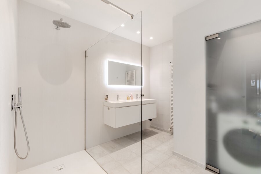 Aan de achterzijde : Slaapkamer met dressing en mooie badkamer met inloopdouche. Gastentoilet