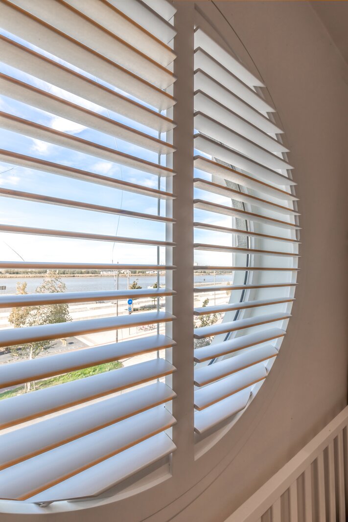 De grote ronde zithoek met een panoramisch zicht over de Schelde is voorzien van een groot LG curved Oled Tv scherm op een metalen draaibare floor mount gekoppeld aan een bose Lifestyle surround systeem.