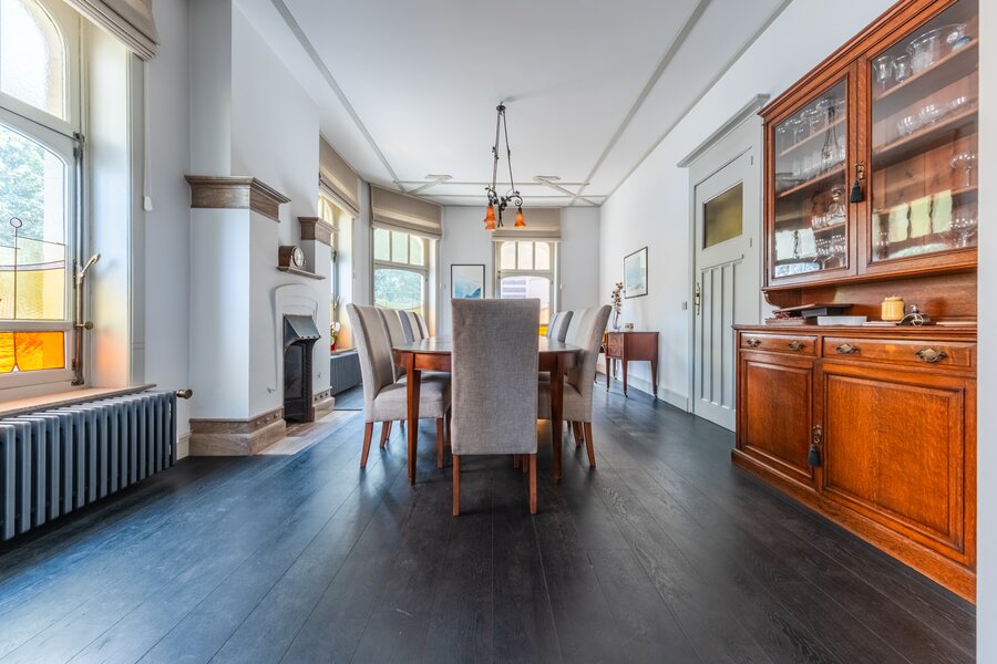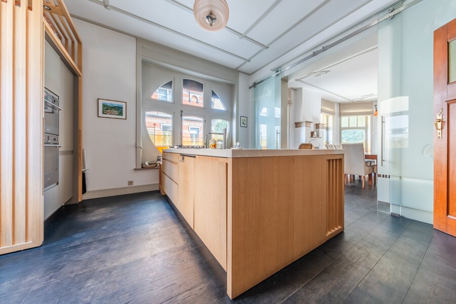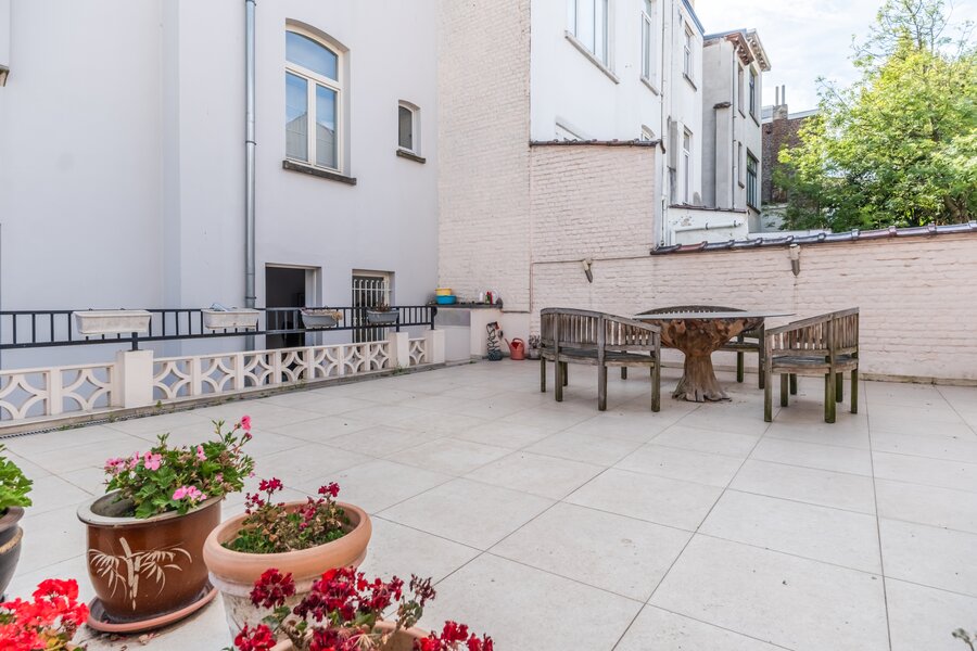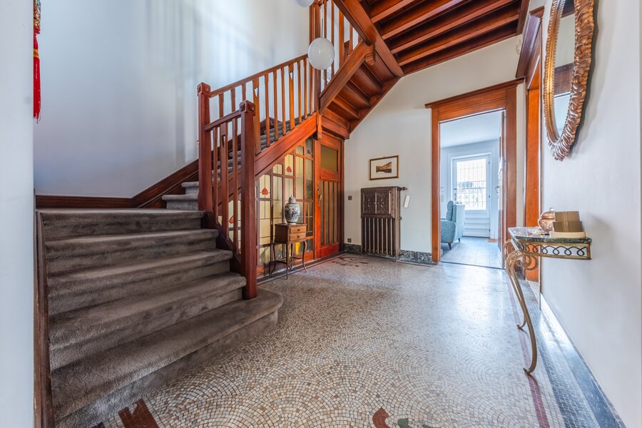 Développée sur environ 360 m² habitables, elle s’ouvre au rez-de-chaussée sur un vaste hall d’entrée orné d’une mosaïque d’époque dans l’esprit Art Nouveau, qui précède une cuisine ouverte entièrement équipée; pensée par l'architecte en charge de la rénovation de la maison afin qu'elle s'intégre au mieux. Une généreuse salle à manger de ± 50 m², agrémentée d’une cheminée décorative d'époque, mène à un espace bureau ou salle de jeux, lequel s’ouvre sur une agréable terrasse plein sud de 45 m².