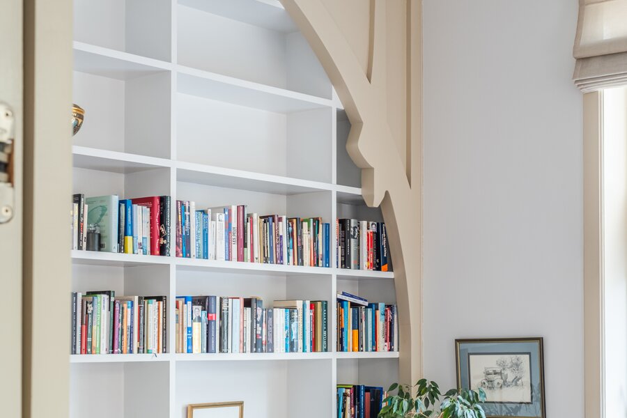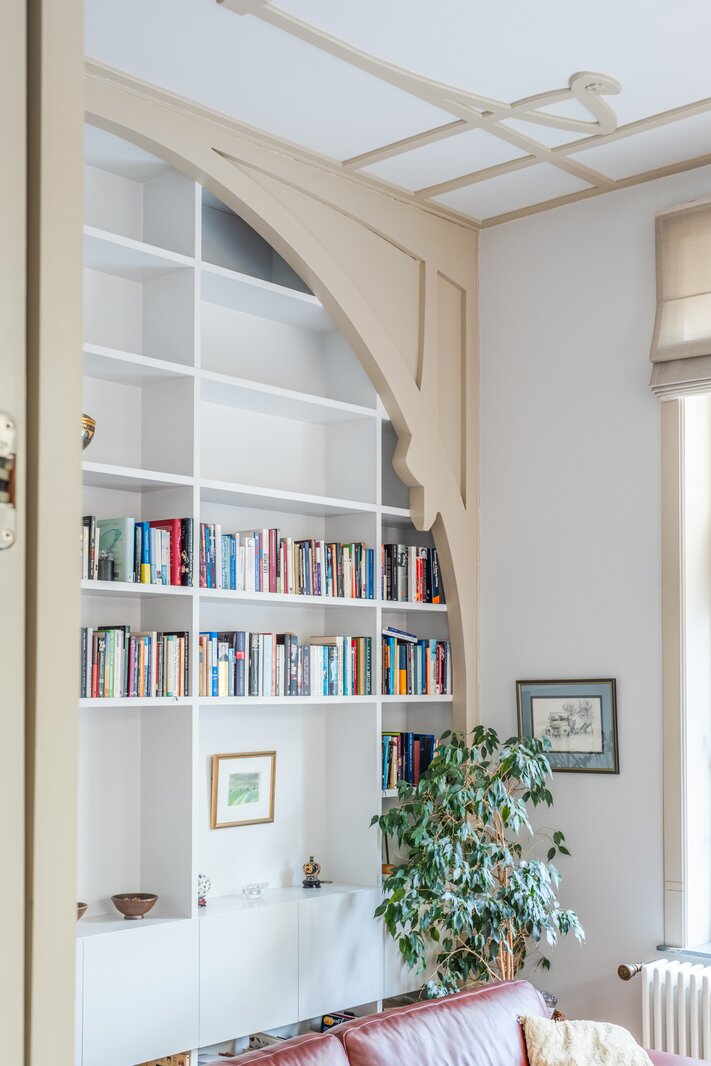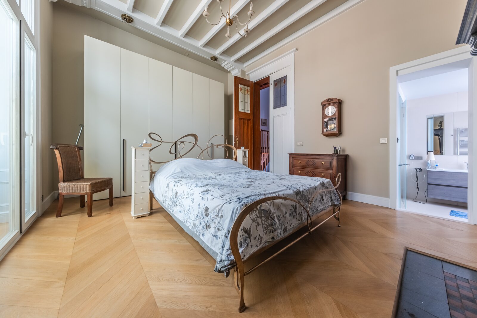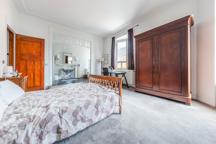 Un majestueux escalier d’époque mène aux étages. Au premier étage : une première chambre avec salle de douche privative et grands placards intégrés, ainsi qu’un espace salon très lumineux et une bibliothèque. Tout comme au rez-de-chaussée, tous les éléments spécifiques de la maison, tel que les moulures et les poingées de portes reprenant un arabesque