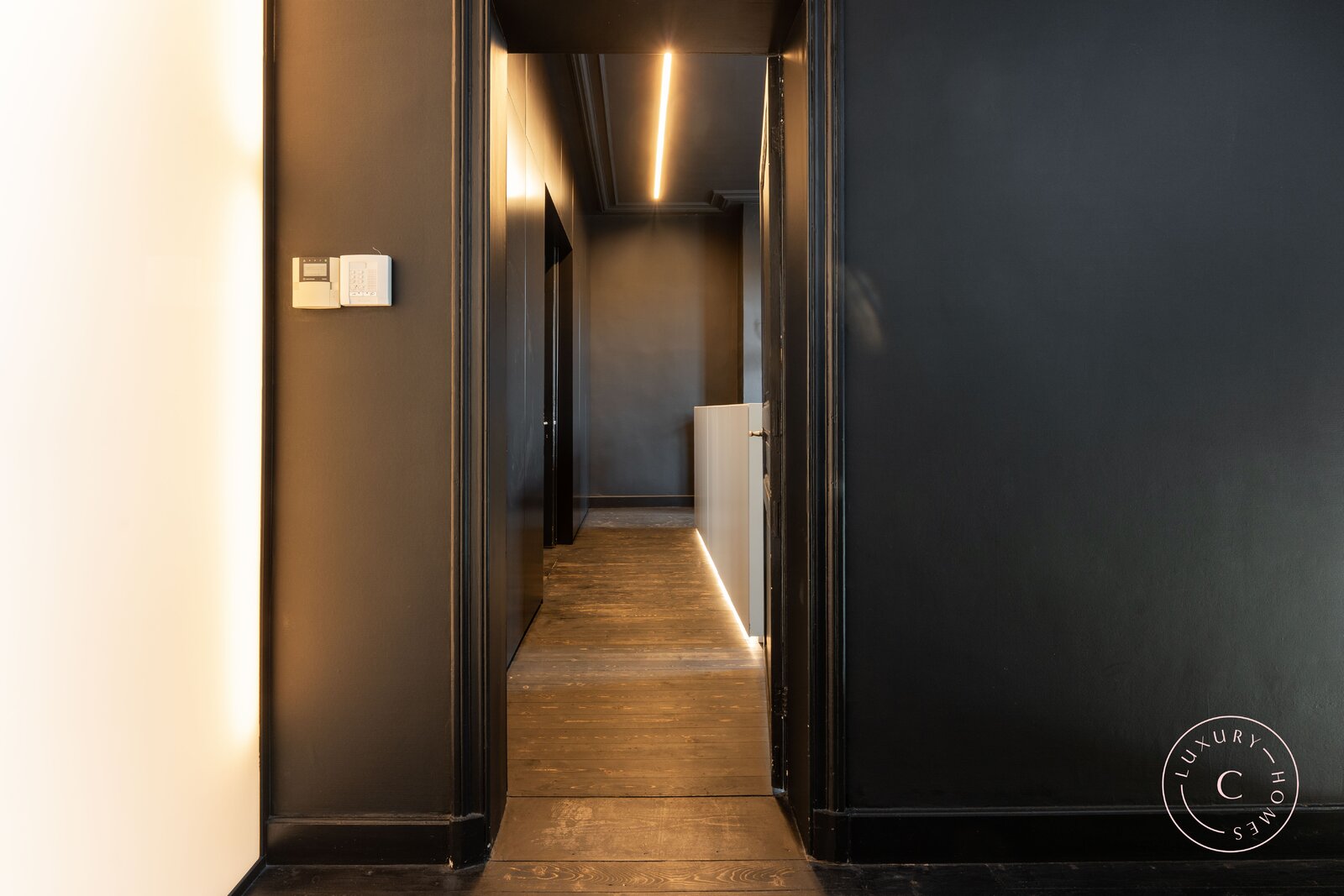 De inkomhal verwelkomt met een trap, gastentoilet en toegang tot de kelder. Het gelijkvloers biedt een royale verdeling van leefruimtes: een eerste sfeervolle living met gashaard zorgt voor een warme ambiance, terwijl een tweede leefruimte eveneens als ruim bureel of praktijkruimte kan fungeren. De volledig uitgeruste leefkeuken met keukeneiland wordt aangevuld met een lichtrijke eetplaats die polyvalent in te delen is. Vanuit deze ruimte heeft men via grote raampartijen rechtstreeks toegang tot het terras en de stadstuin, waar het verwarmde buitenzwembad van 12 x 2,5 meter en het poolhouse met sauna uitnodigen tot ontspanning.