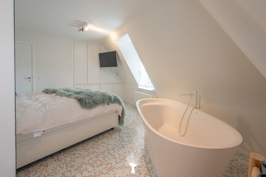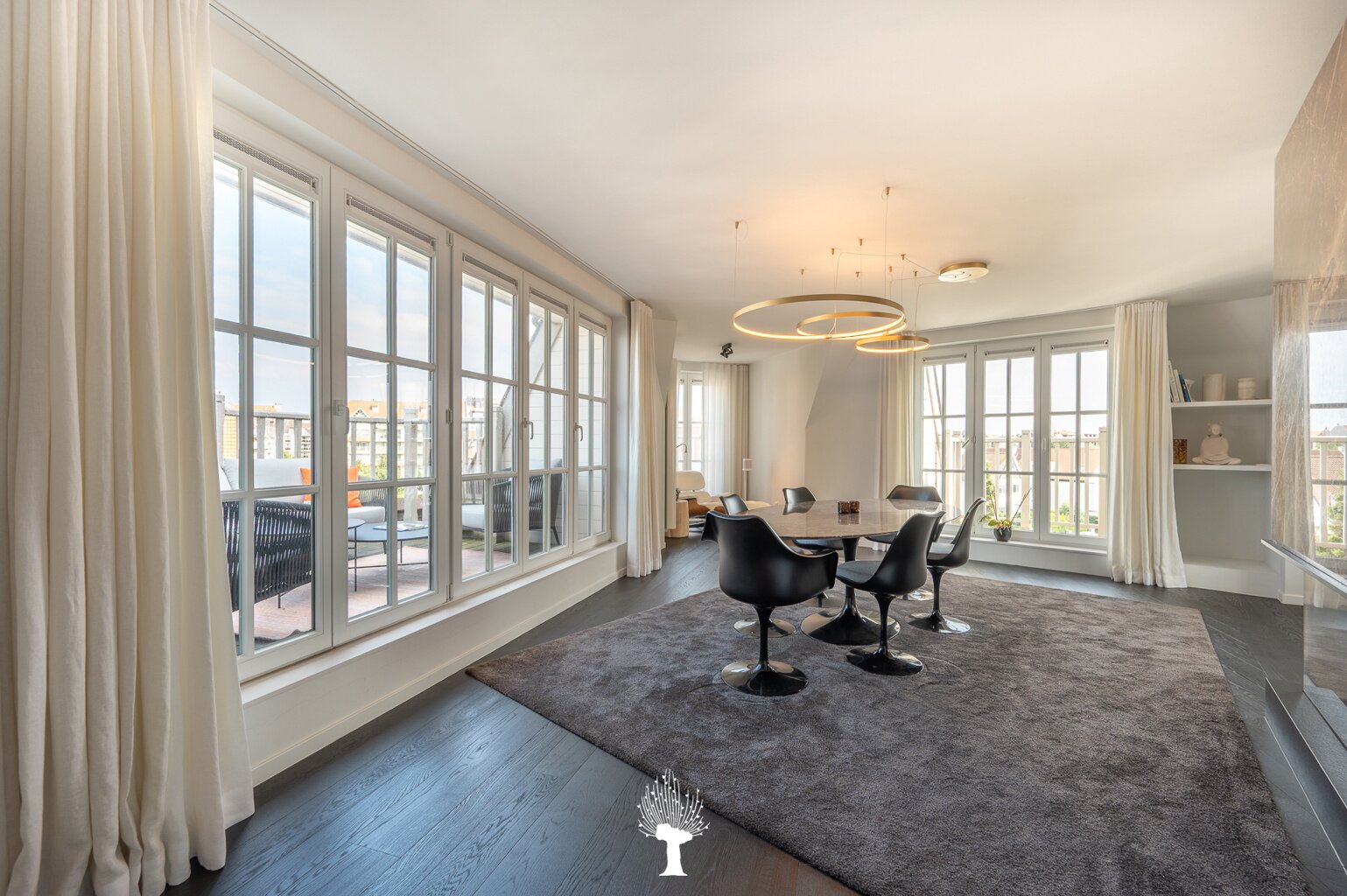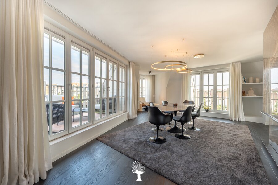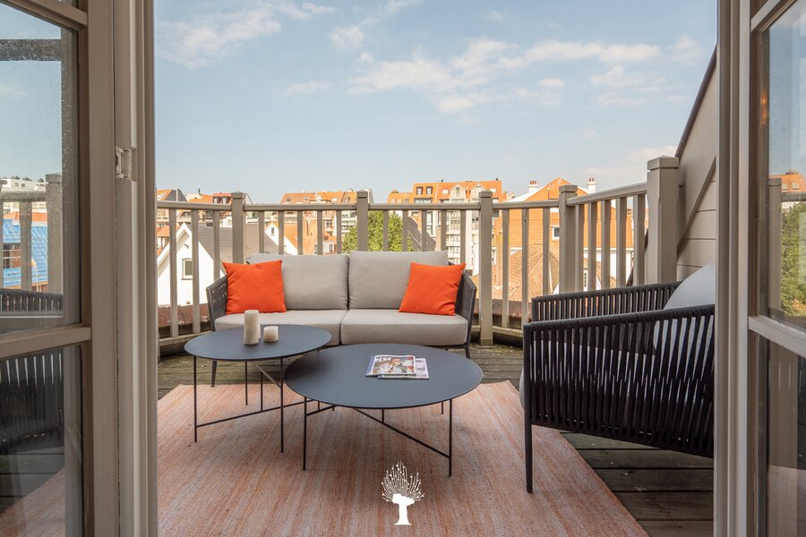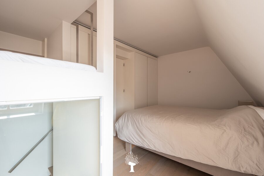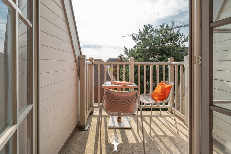 Magnifique appartement en duplex entièrement rénové avec spacieuses terrasses ensoleillées, situé dans une petite résidence-villa au cœur de l'Albertstrand. La plage à seulement 100 m. Composition : hall d'entrée avec grand vestiaire et WC séparé. Spacieux séjour avec coin télévision, salle à manger avec cheminée au gaz, donnant accès aux terrasses ensoleillées avec belle vue sur les villas environnantes et la mer. Cuisine équipée avec vue sur mer. Buanderie avec raccordement pour machine à laver et sèche-linge. Bar. Deuxième espace de rangement.