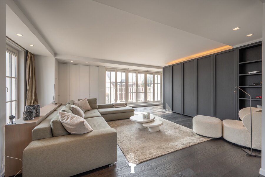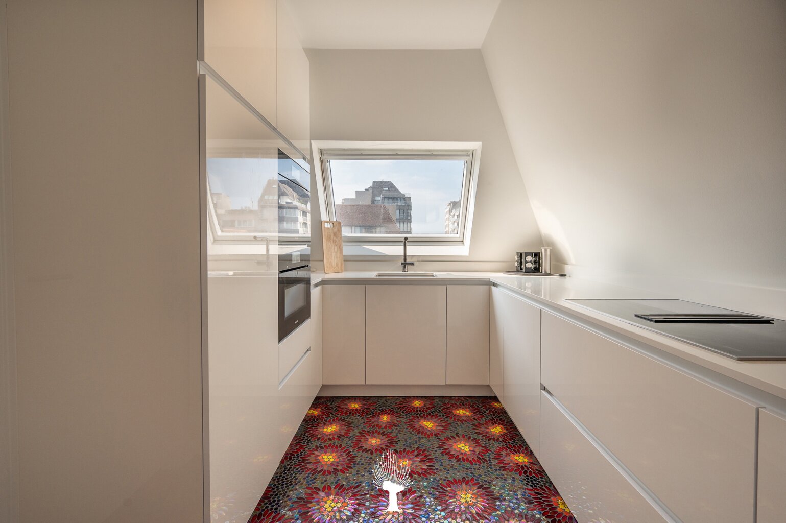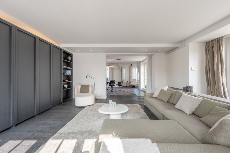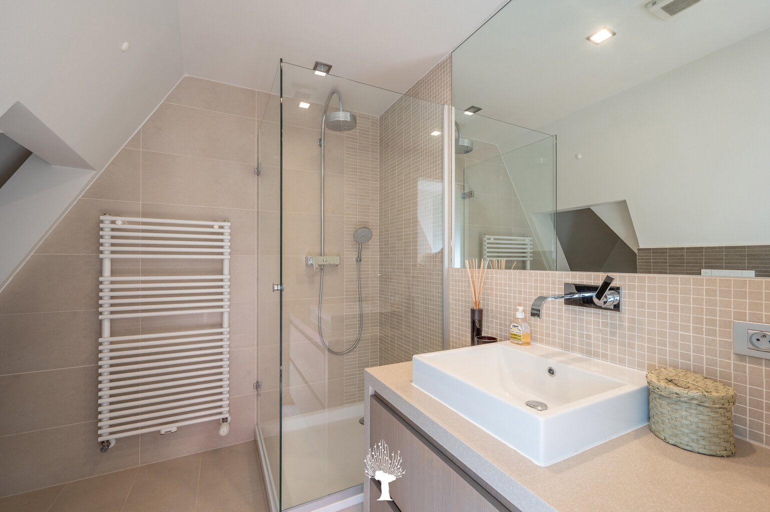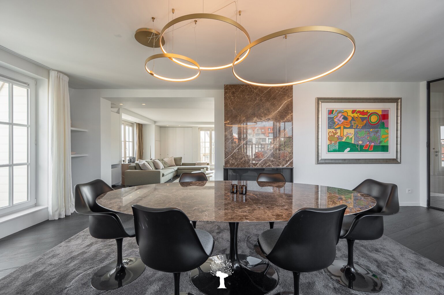 Magnifique appartement en duplex entièrement rénové avec spacieuses terrasses ensoleillées, situé dans une petite résidence-villa au cœur de l'Albertstrand. La plage à seulement 100 m. Composition : hall d'entrée avec grand vestiaire et WC séparé. Spacieux séjour avec coin télévision, salle à manger avec cheminée au gaz, donnant accès aux terrasses ensoleillées avec belle vue sur les villas environnantes et la mer. Cuisine équipée avec vue sur mer. Buanderie avec raccordement pour machine à laver et sèche-linge. Bar. Deuxième espace de rangement.