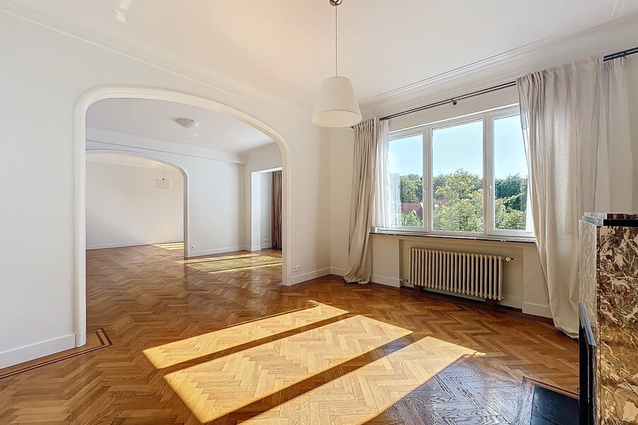 Face au Bois de la Cambre sur l'avenue Franklin Roosevelt, magnifique appartement d'une superficie totale de ± 228 m² dans un magnifique immeuble moderniste teinté d'Art Déco. Il se compose d'un vaste hall d'entrée avec un vestiaire, d'un lumineux séjour (± 60 m²) de type 3 pièces en enfilade, d'une salle à manger (± 12 m²), d'une cuisine super équipée avec de nombreux rangements, d'un hall de nuit avec un dressing et d'un espace buanderie, de 3 belles chambres (± 20 m², ± 16 m² et ± 9 m²), d'une salle de bains et de 2 salles de douche. Balcon accessible par une des chambres. Deux caves incluses et un box de garage en supplément obligatoire (150 €/mois). Charges : 150 €/mois (Provision pour l'entretien des parties communes). PEB D-. A découvrir au plus vite chez Vaneau Lecobel !!