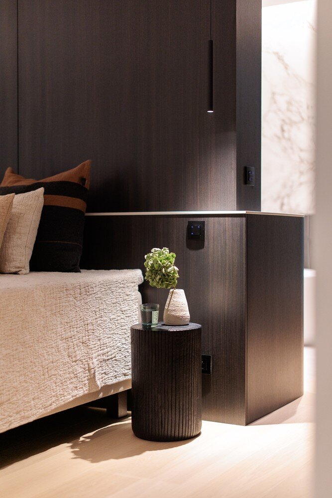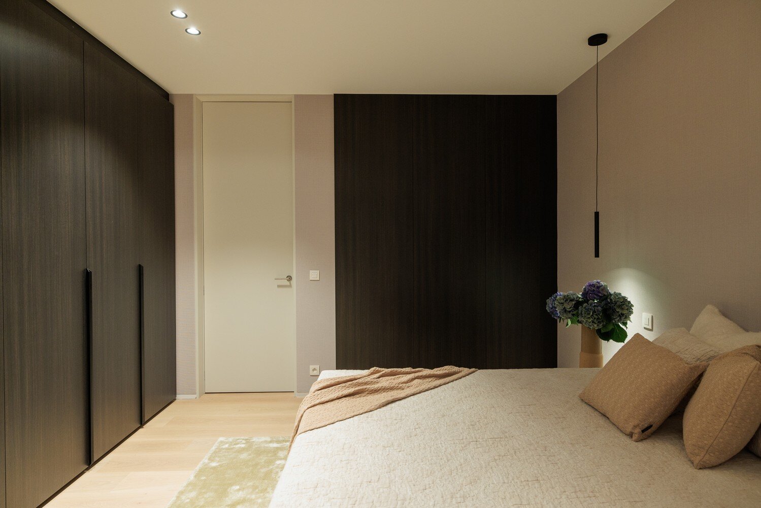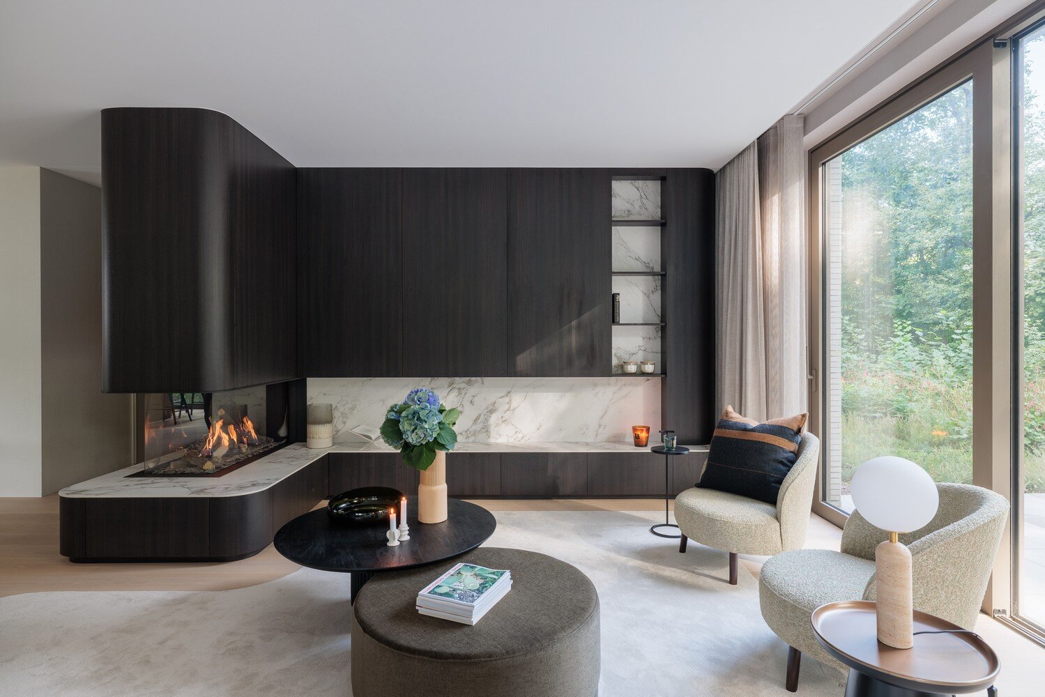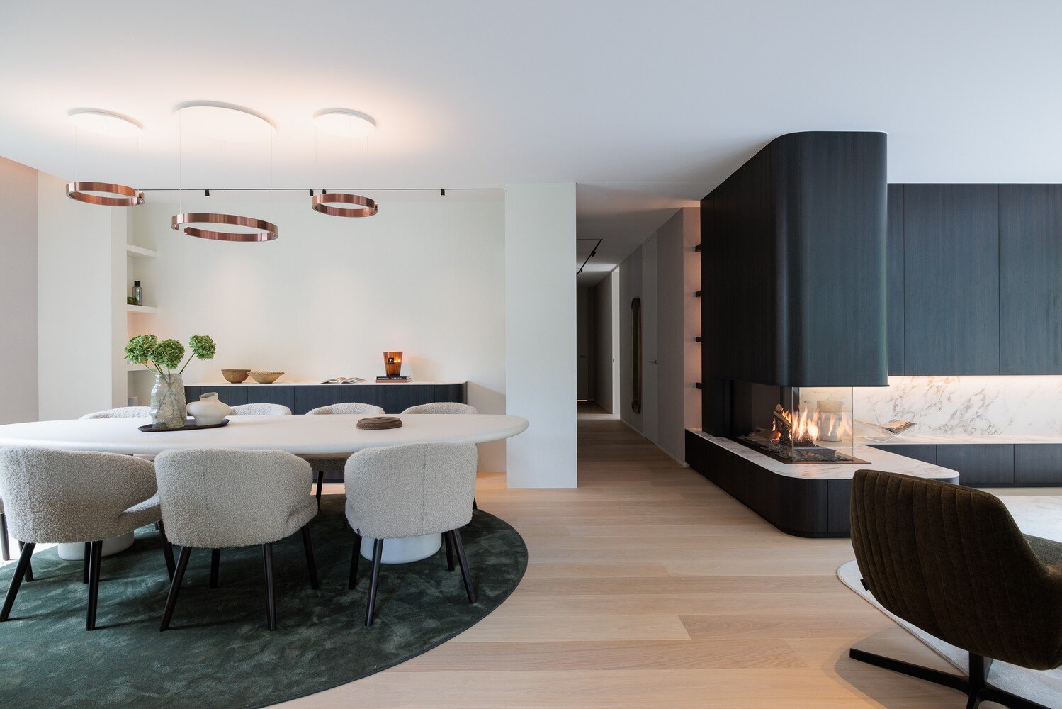 L’appartement est livré clés en main : peint, tapissé, avec luminaires, rideaux, cheminée à gaz, et du mobilier intégré sur mesure qui crée une ambiance luxueuse et apaisante.