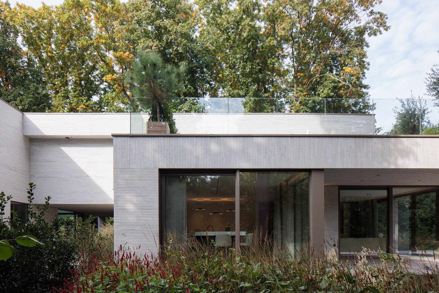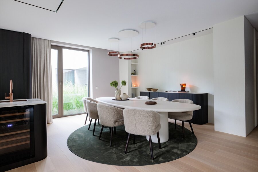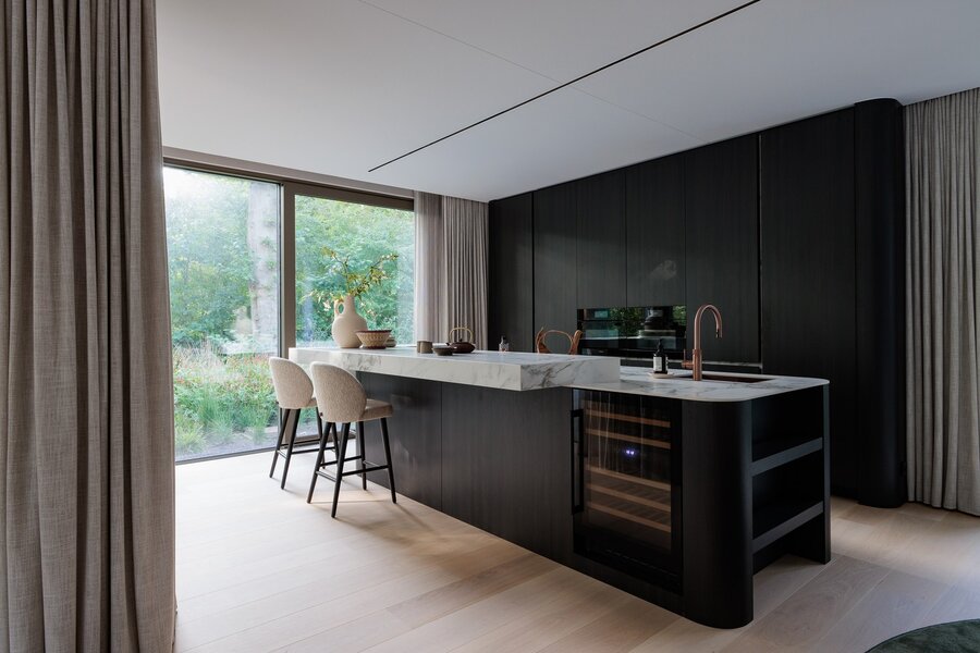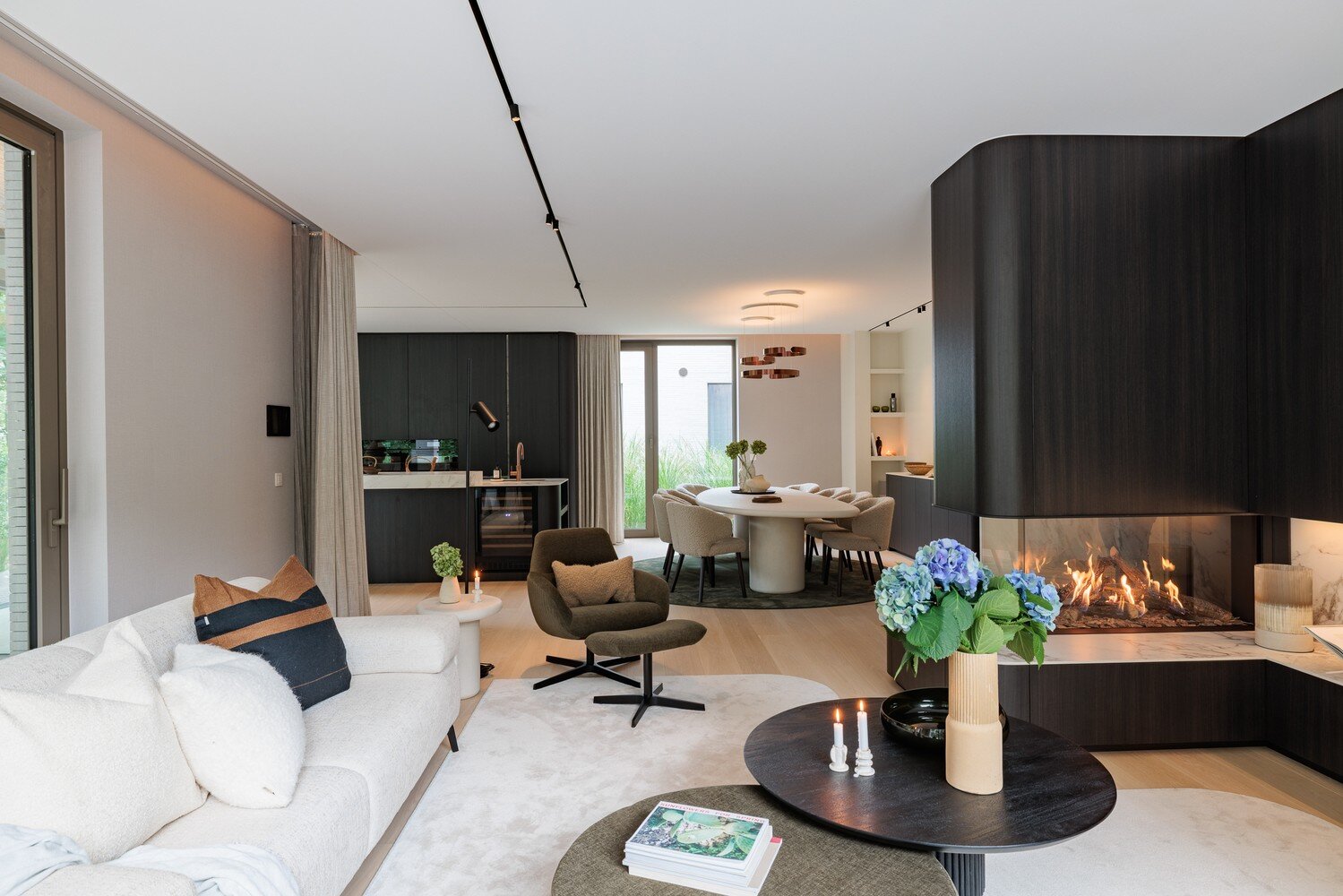 Le séjour orienté plein sud avec cuisine ouverte s’ouvre sur une immense terrasse partiellement couverte de 60 m². Un espace idéal pour profiter du calme, de la verdure et de l’intimité. La cuisine est entièrement équipée avec des appareils Miele, Bora et un robinet Quooker, et elle donne accès à une arrière-cuisine/buanderie pratique.