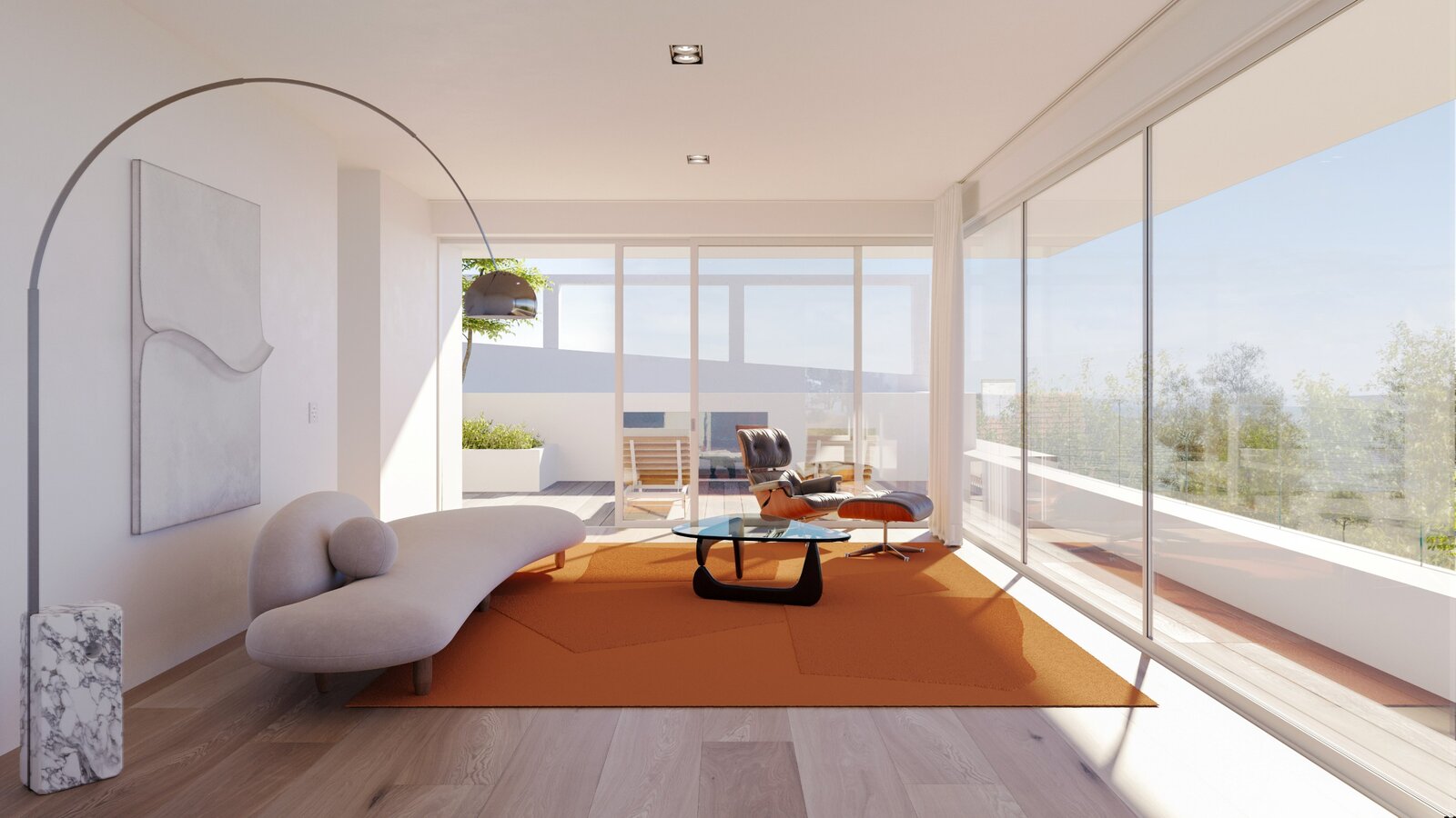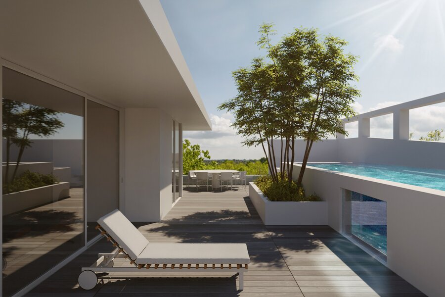Op het terras is op de beelden een zwembad voorzien — dit is niet inbegrepen in de verkoopprijs, maar reeds vergund. Elke verdieping is toegankelijk via een privétrap en lift, wat garant staat voor discretie, comfort en exclusiviteit.