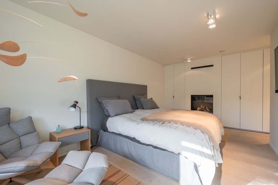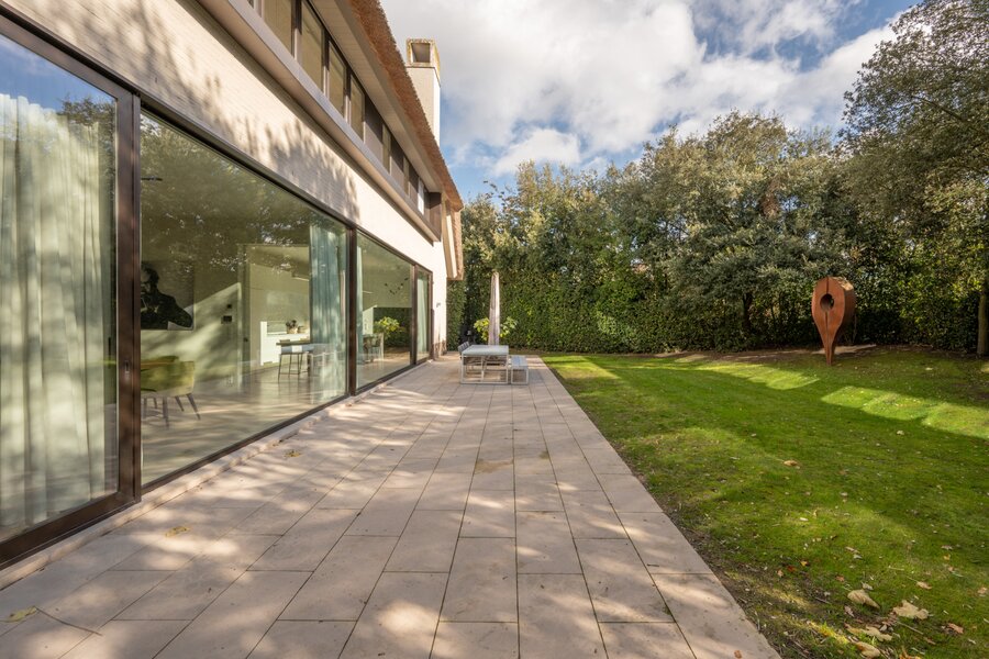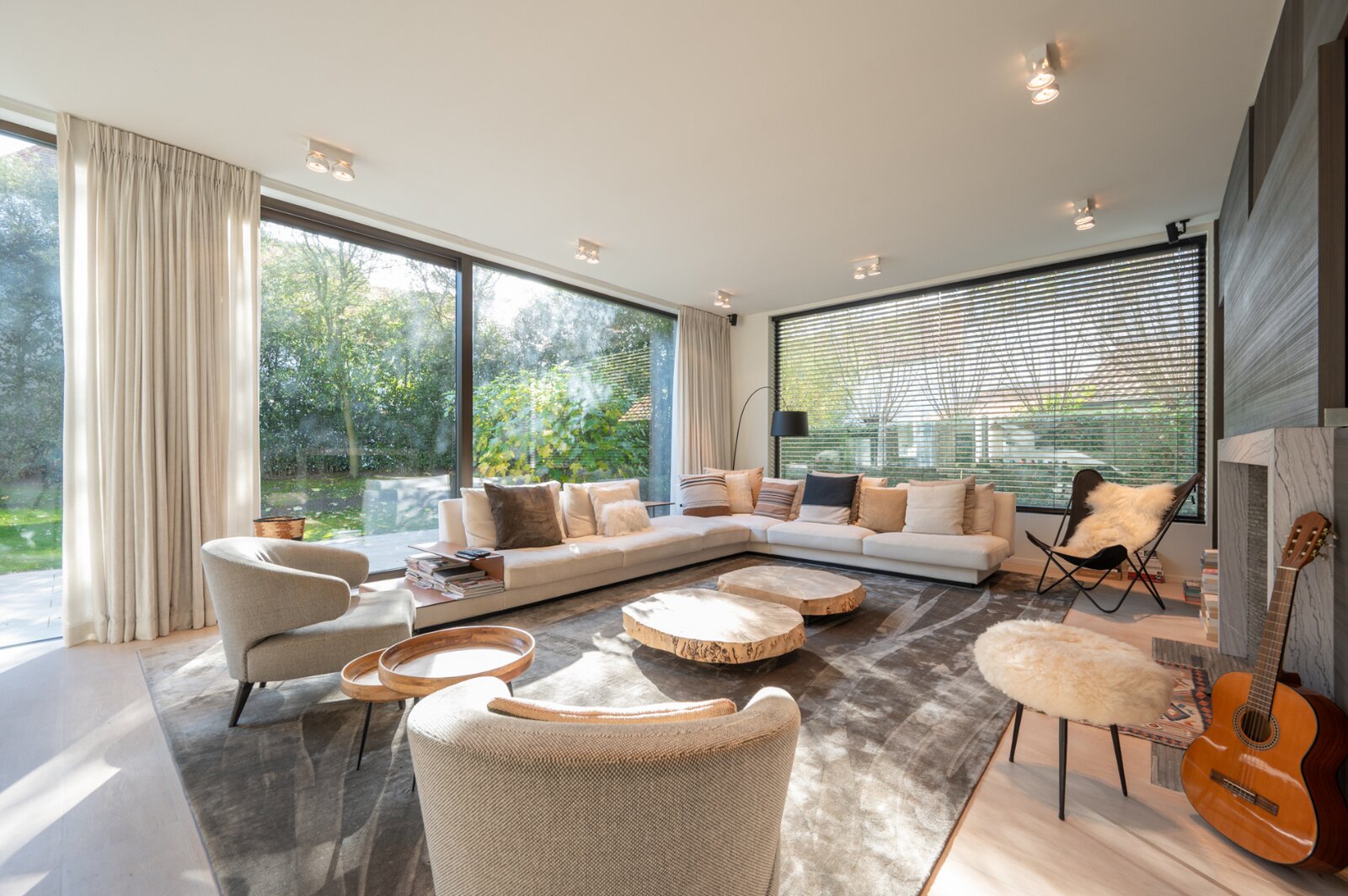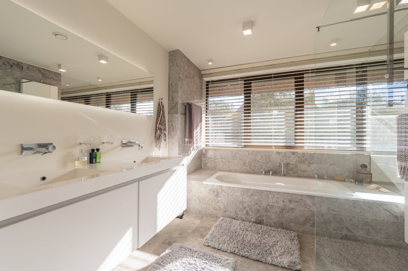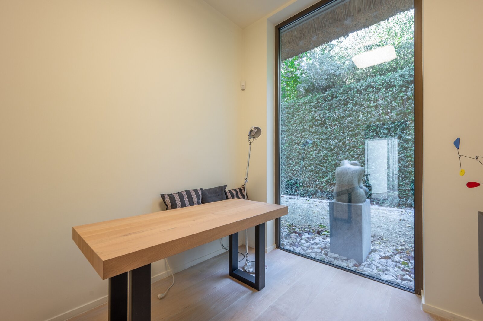 Spacieux hall d’entrée avec vestiaire et toilette invités. Bureau. Séjour lumineux et vaste comprenant un salon avec feu ouvert, une salle à manger et une cuisine entièrement équipée avec coin repas signée Obumex. L’ensemble s’ouvre sur une grande terrasse extérieure avec vue sur le jardin. Buanderie. Garage double avec espace de rangement supplémentaire.