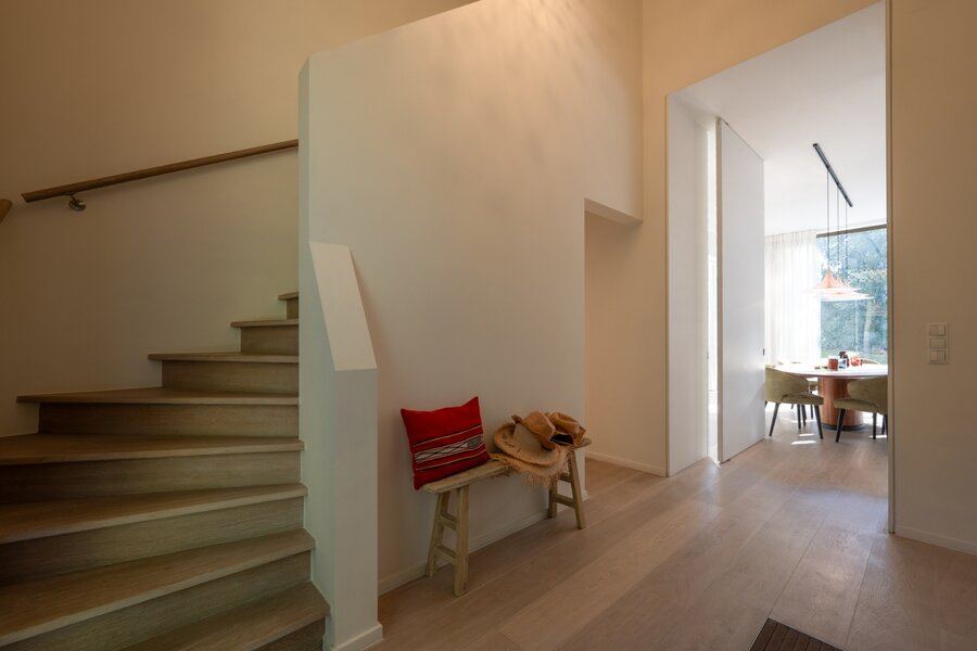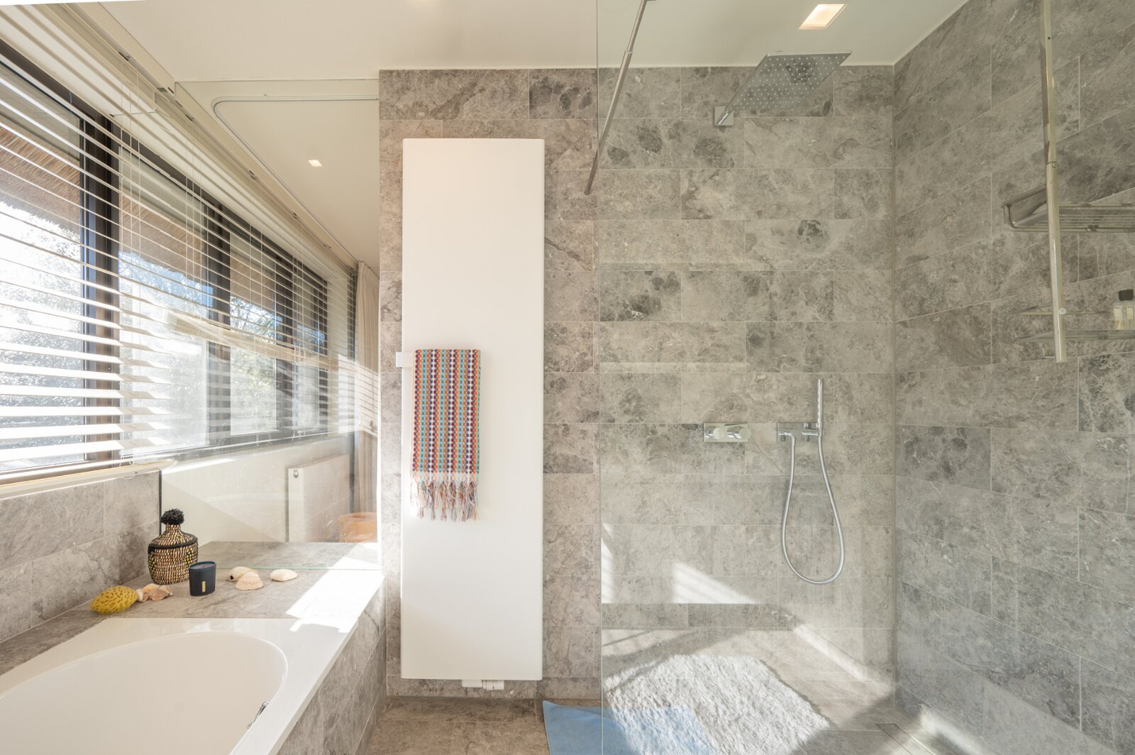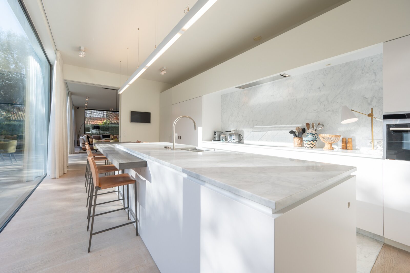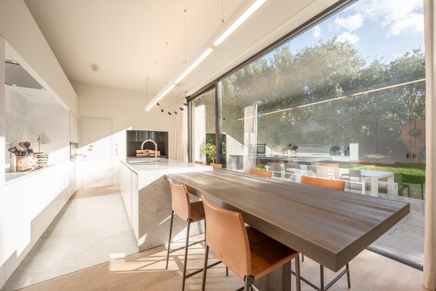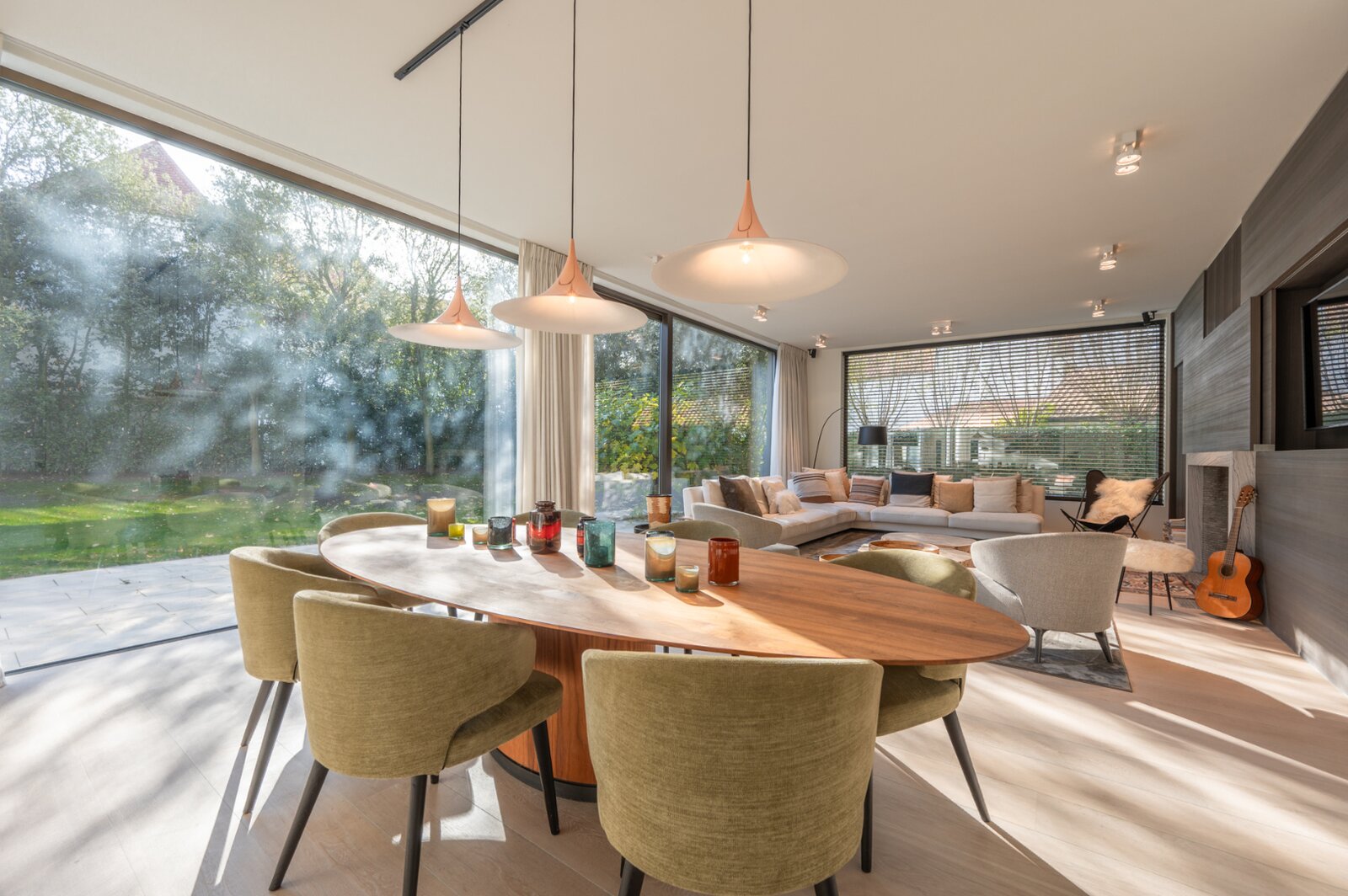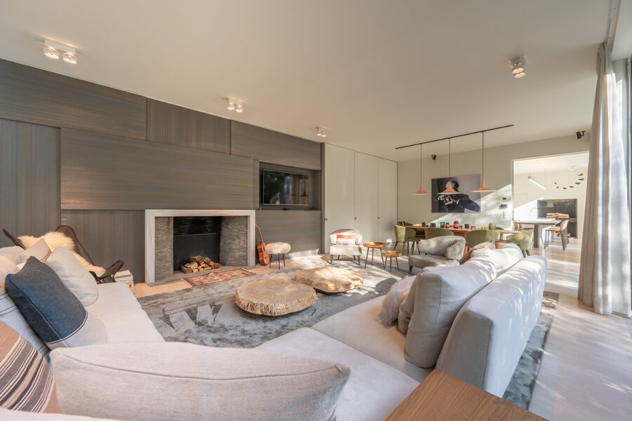 Spacieux hall d’entrée avec vestiaire et toilette invités. Bureau. Séjour lumineux et vaste comprenant un salon avec feu ouvert, une salle à manger et une cuisine entièrement équipée avec coin repas signée Obumex. L’ensemble s’ouvre sur une grande terrasse extérieure avec vue sur le jardin. Buanderie. Garage double avec espace de rangement supplémentaire.