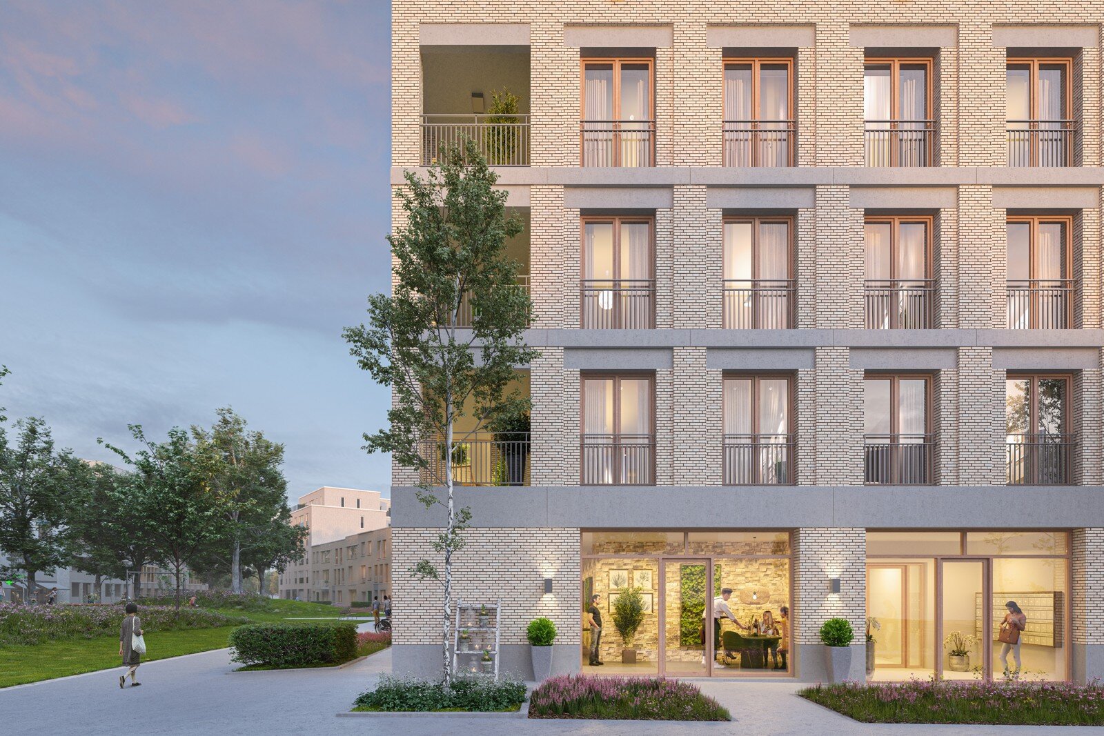 Au rez-de-chaussée, la Résidence ROMAIN accueille un espace de restauration animé avec un accès invitant depuis la place Koen Blieck et un espace polyvalent pour les professions libérales/bureau avec une entrée couverte frappante du côté est, adjacent au luxuriant parc.