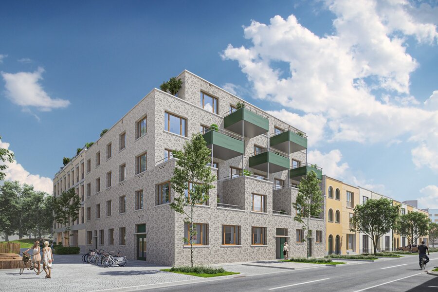 La façade, avec sa pierre de parement élégante de couleur brun jaunâtre au format waal, respire une classe pure. Le rythme des colonnes et des poutres en béton, encadré par des briques artisanales rugueuses et des joints gris clair, crée une grille harmonieuse qui embrasse délicatement les façades des terrasses et la façade de la rue. Des surfaces de brique en retrait et des encadrements de fenêtres en bois brun foncé ajoutent des nuances subtiles, tandis que des garde-corps en acier galvanisé servent d'élégants accents, complétant le tableau.