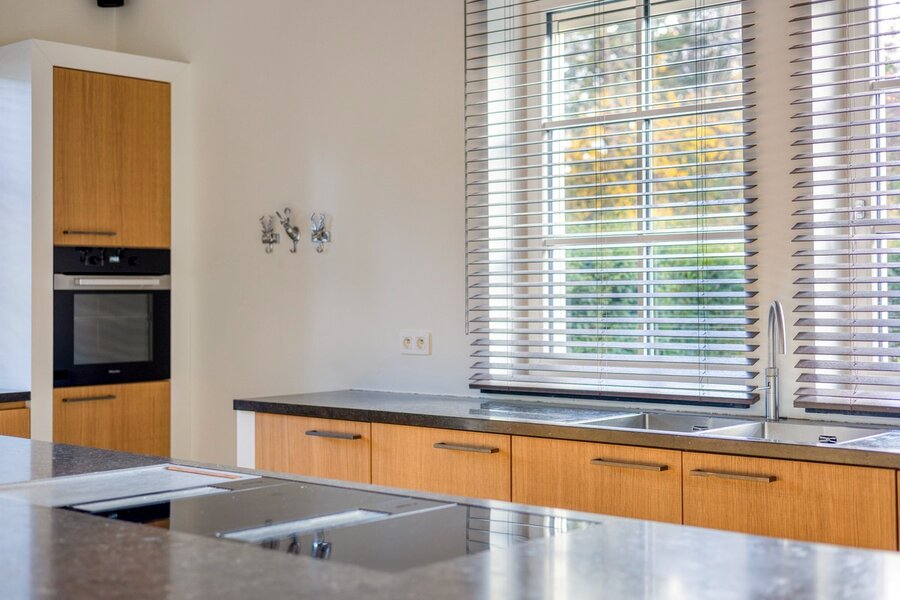 Via de inkomhal, met gastentoilet en ingebouwde vestiaireruimte, kom je zowel in de woonkamer als in de leefkeuken. De woonkamer geniet dankzij de grote ramen van veel natuurlijke lichtinval en heeft een mooi zicht op de groene tuin. De leefkeuken bestaat uit een kwalitatieve aanbouwkeuken die voorzien is van alle comfort, met granieten werkbladen, een Amerikaanse koelkast, diepvries, heteluchtoven, microgolfoven, stoomoven, inductiekookplaat met teppanyakiplaat en geïntegreerde afzuigkap, een vaatwasser (allen Miele) en veel kastruimte. De eethoek grenst aan het overdekte terras. Doordat de keuken tot in de nok is opengetrokken, geniet je hier van een aangenaam ruimtegevoel. De authentieke eiken balken zorgen voor karakter en gezelligheid. In de woning is tevens een Sonos-installatie geïntegreerd, wat zorgt voor een warme sfeer en een heel aangename beleving in het dagelijkse wooncomfort.