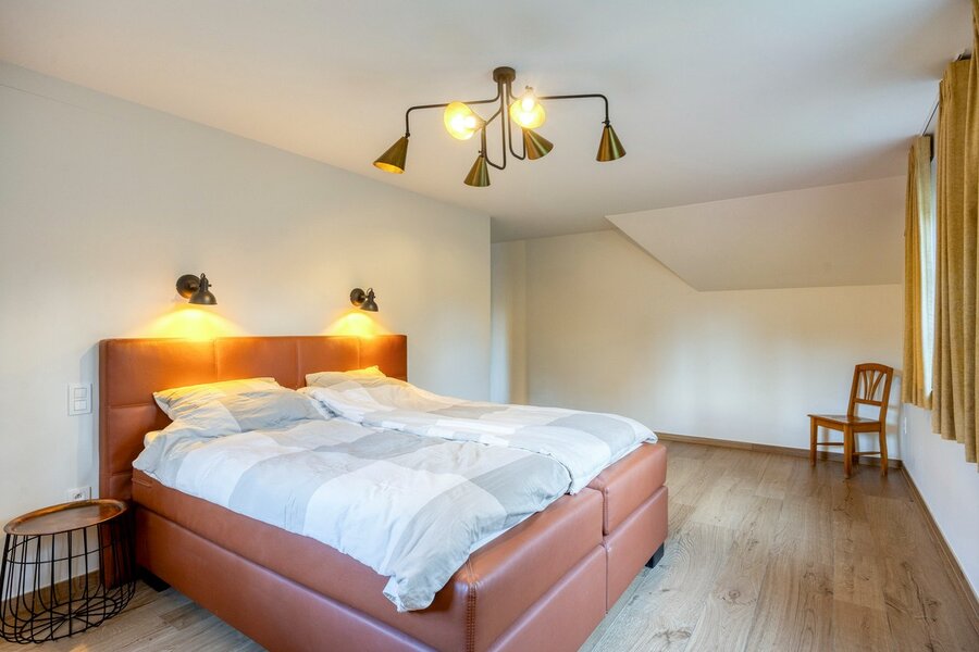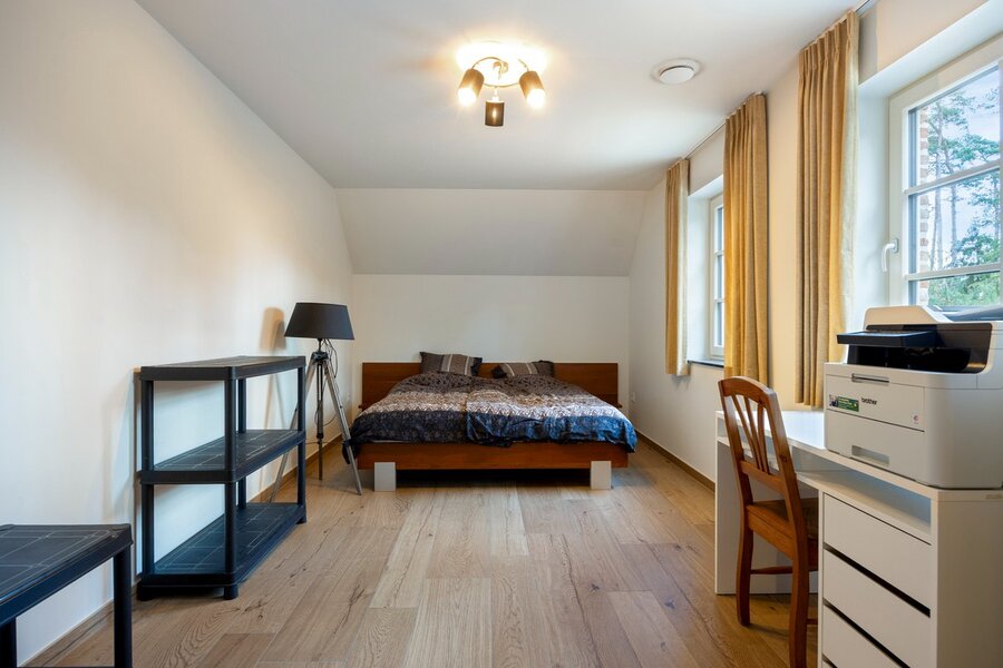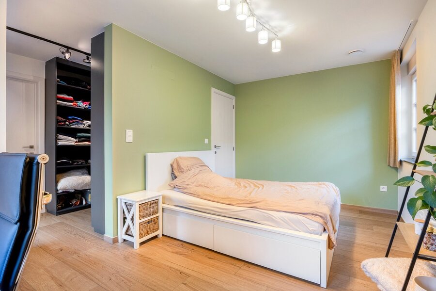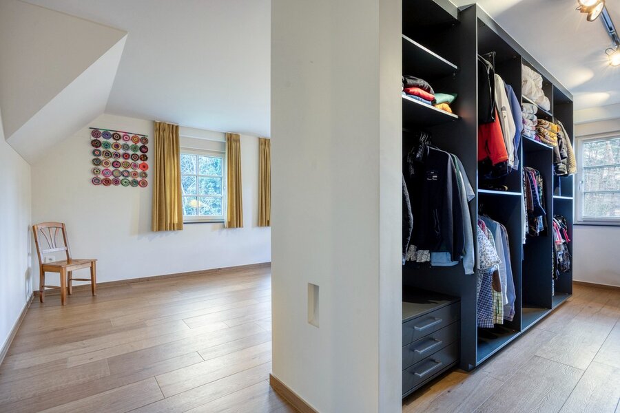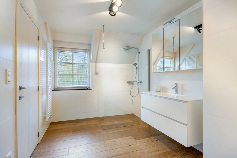 Op de verdieping zijn er drie ruime slaapkamers, waarvan er twee beschikken over een eigen dressing en een aansluitende badkamer. De badkamer van de masterbedroom is uitgerust met een ligbad, douche, dubbele wastafel en toilet. De andere badkamer omvat een douche, enkelvoudige wastafel en toilet. Op deze verdieping bevindt zich ook de linnenkamer, voorzien van inbouwkasten en een handige uitgietbak. Een luik met uitschuiftrap geeft toegang tot de zolderverdieping, die perfect dienstdoet als extra stockageruimte en waar je, indien gewenst, nog een extra (slaap)kamer kan creëren.