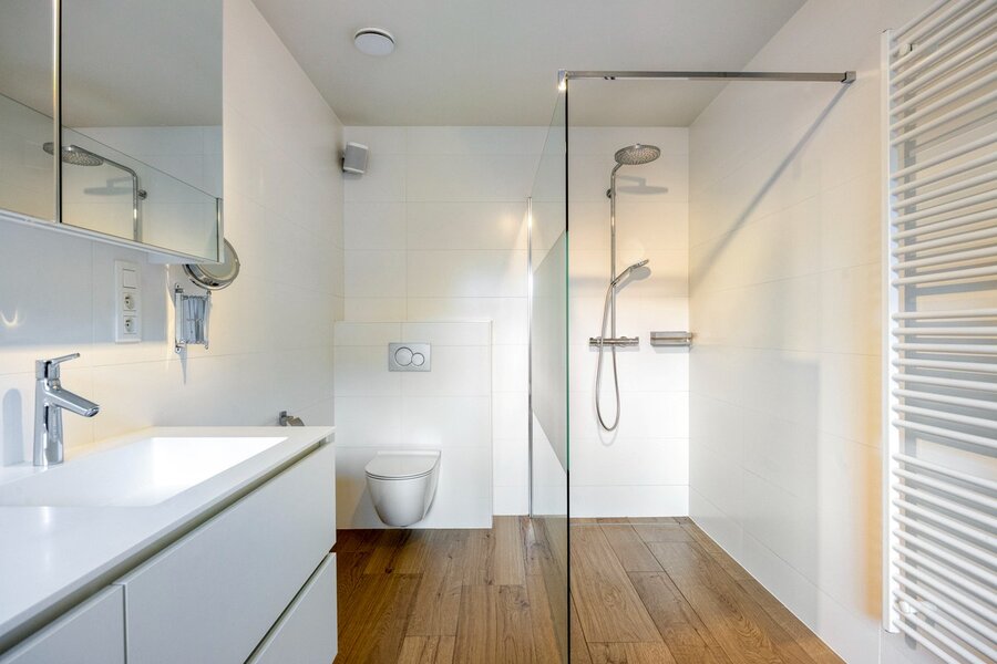 De woning is volledig voorzien van vloerverwarming en vloerkoeling via een warmtepomp met diepteboring. De voorzieningen voor airco zijn voorbereid en weggewerkt, maar bleken voor de huidige eigenaars niet nodig. Een balansventilatiesysteem type D met bypass zorgt voortdurend voor verse, gefilterde lucht.