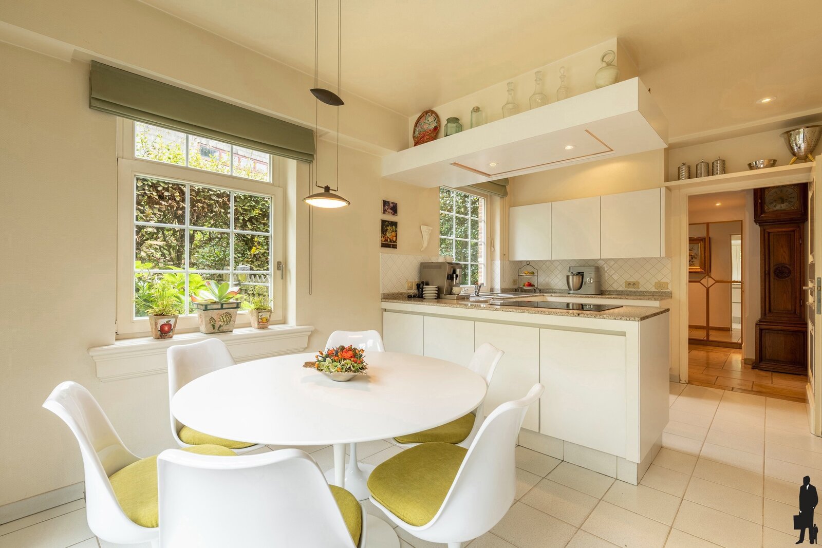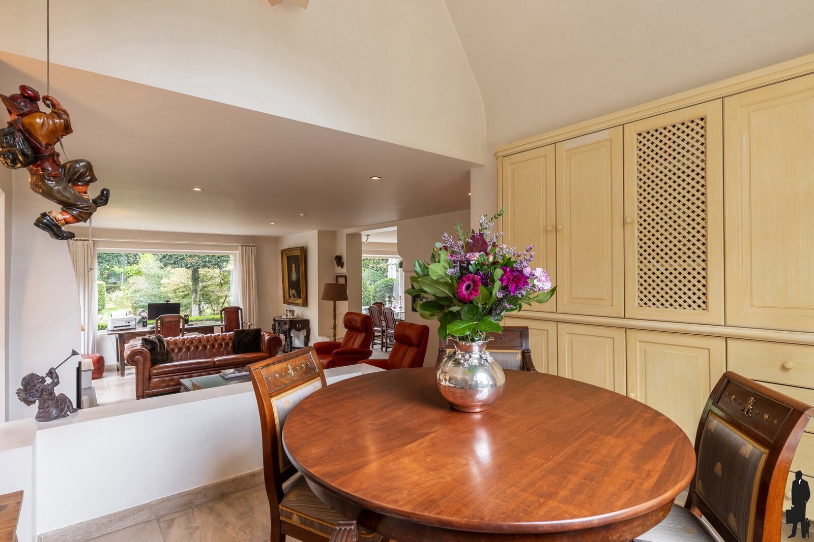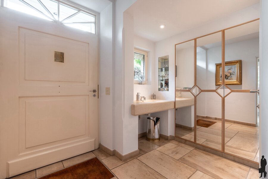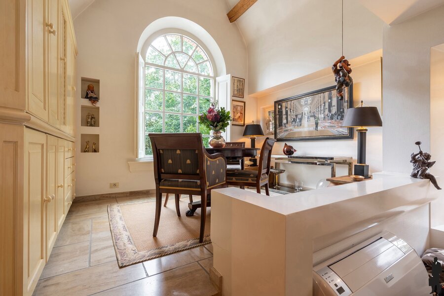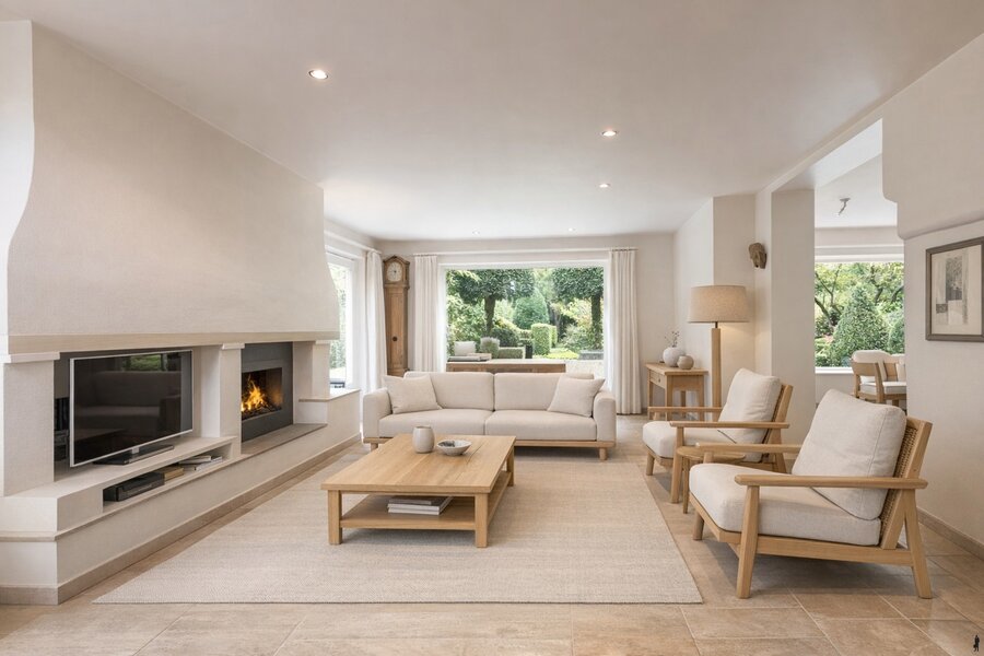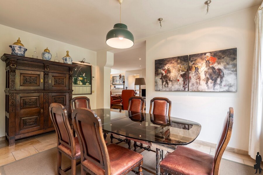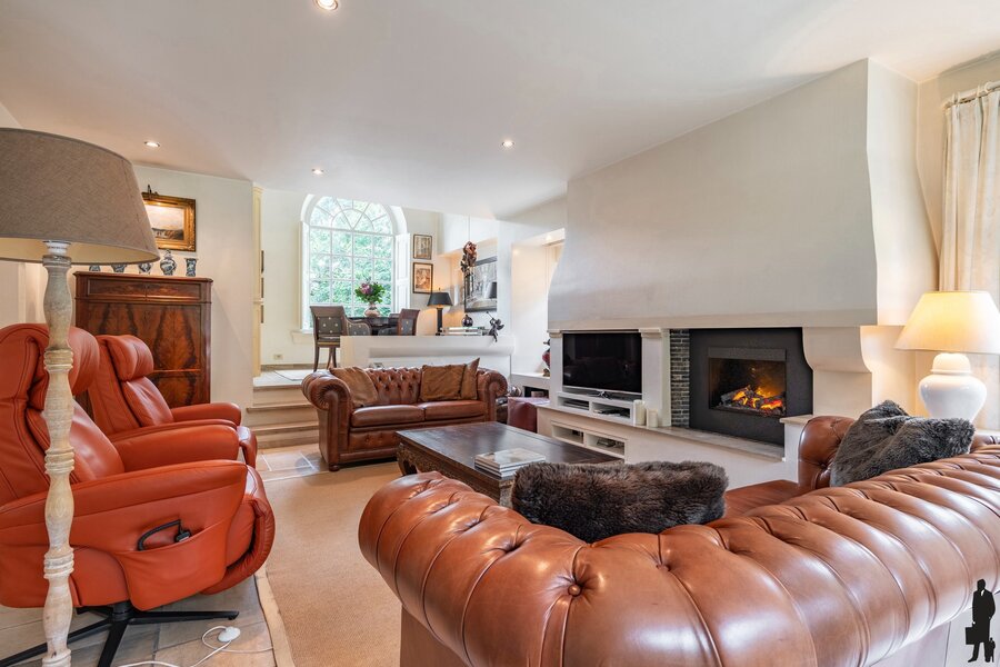 Een ruime, lichtrijke inkomhal met vestiaire en gastentoilet biedt toegang tot het woongedeelte, het trappenhuis en de keuken. Vanaf het eerste moment valt de villa op door haar uitstekende staat van onderhoud en de keuze voor bijzonder mooie en duurzame materialen. In de woonkamer is het heerlijk vertoeven. Vanuit elke hoek behoudt u het contact met de prachtig aangelegde tuin. De zithoek is centraal gesitueerd bij de open haard en televisie, terwijl de bibliotheek uitkijkt over de oprit en de eetkamer een prachtig zicht heeft op de achtertuin. De ruimte is speels ingedeeld en uitgerust met stijlvolle maatwerkkasten en airconditioning. De keuken vormt het hart van de woning. Hier kunt u gezellig tafelen met uitzicht op de tuin. Bij mooi weer openen de tuindeuren rechtstreeks naar het terras. De keuken is volledig uitgevoerd in maatwerk met hoogwaardige toestellen en heeft een rechtstreekse verbinding met de inkomhal. Verder nog een dubbele inpandige garage met automatische poorten, wat in- en uitrijden bijzonder comfortabel maakt. Boodschappen brengt u handig naar de kelder of rechtstreeks naar de keuken. Een ruime wasplaats is eveneens voorzien van ingebouwde kasten.
