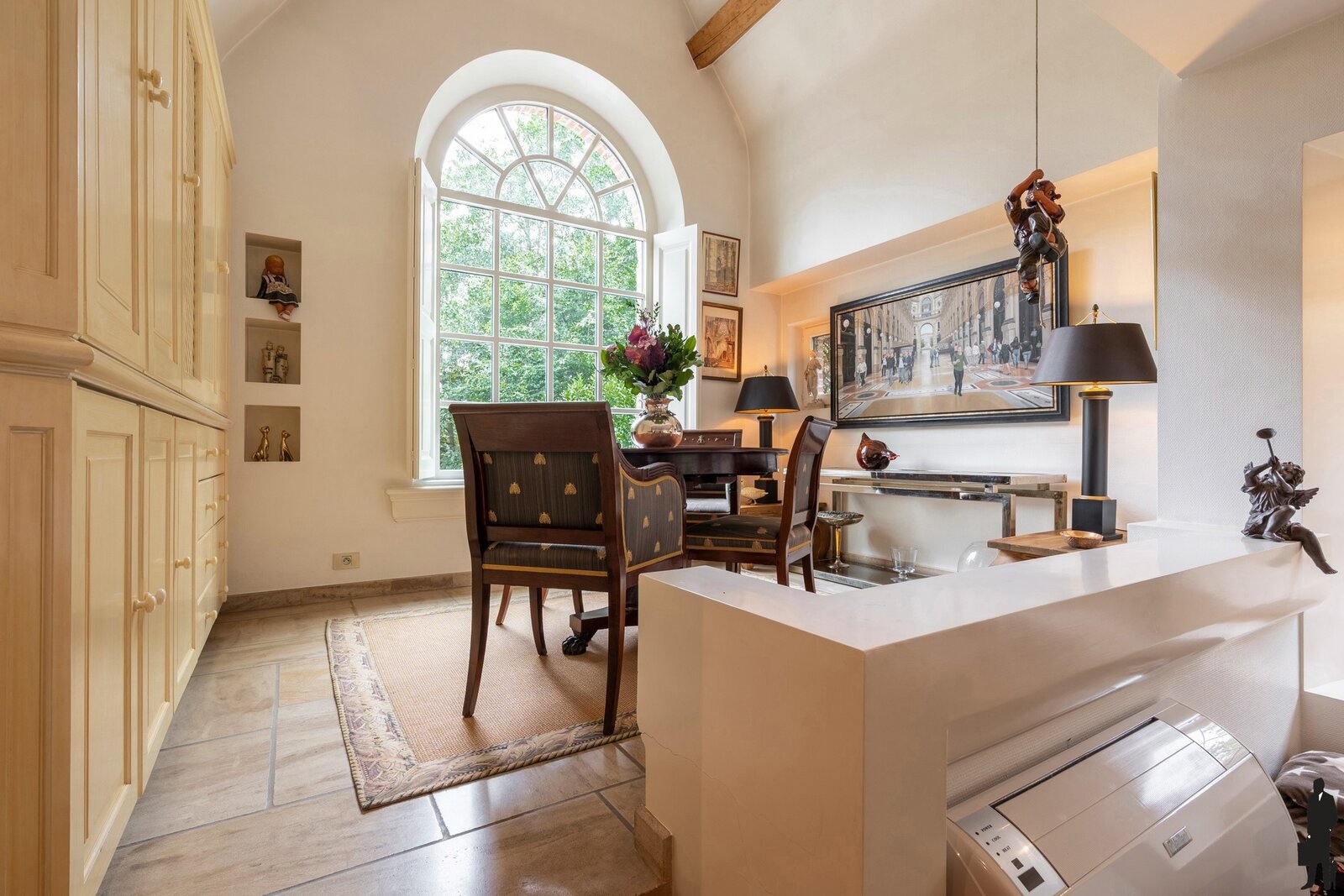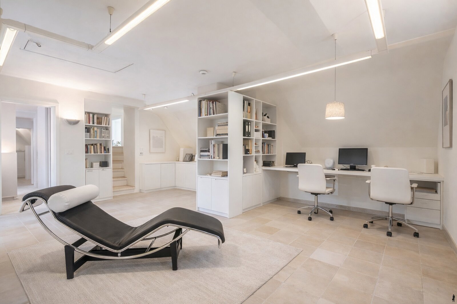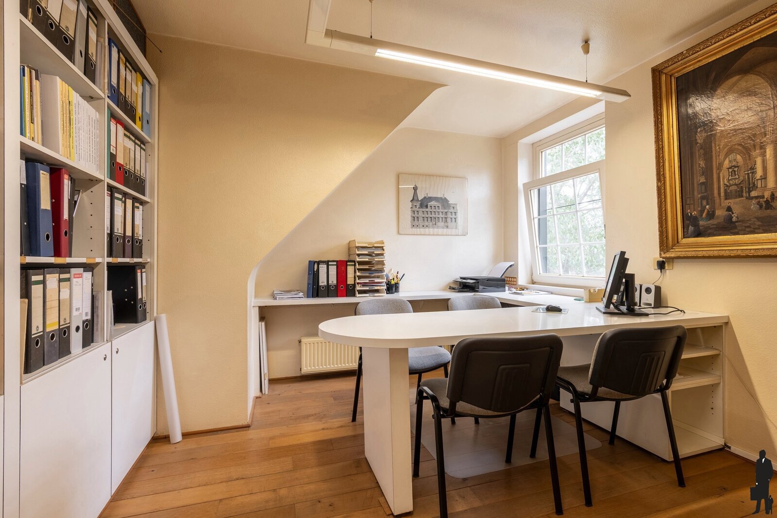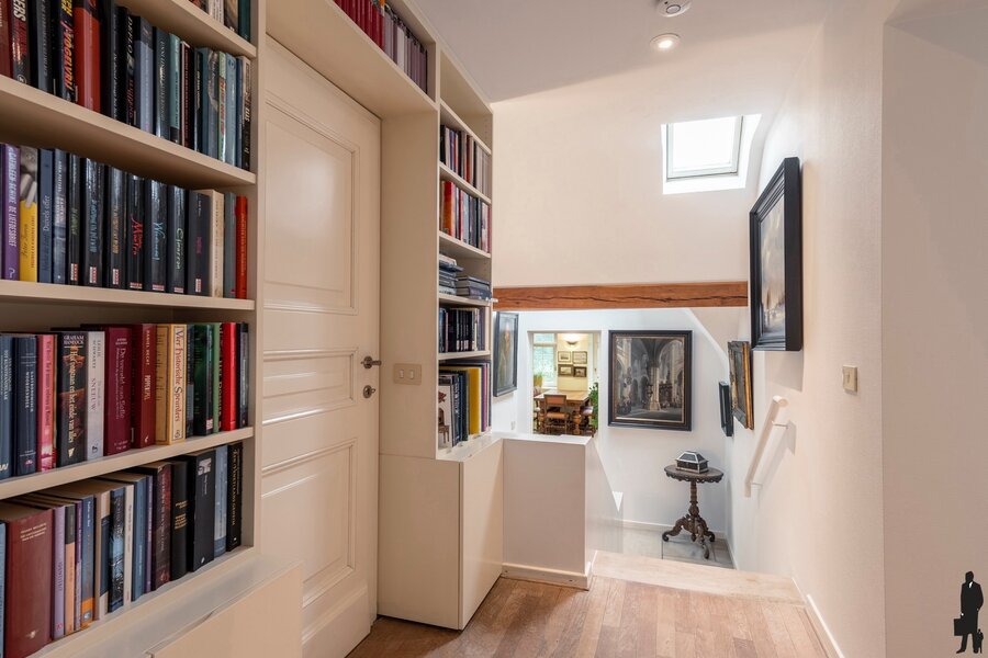 Via de brede trap bereikt u de tussenverdieping, waar een bijzonder lichtrijke kantoor is ingericht (41 m²). Deze kan perfect dienstdoen als werkplek, maar ook eenvoudig worden omgevormd tot een kleine studio of speelkamer met opbergruimte onder het dak en aangrenzend nog een gezellig opkamertje, thans ingericht als bureau.