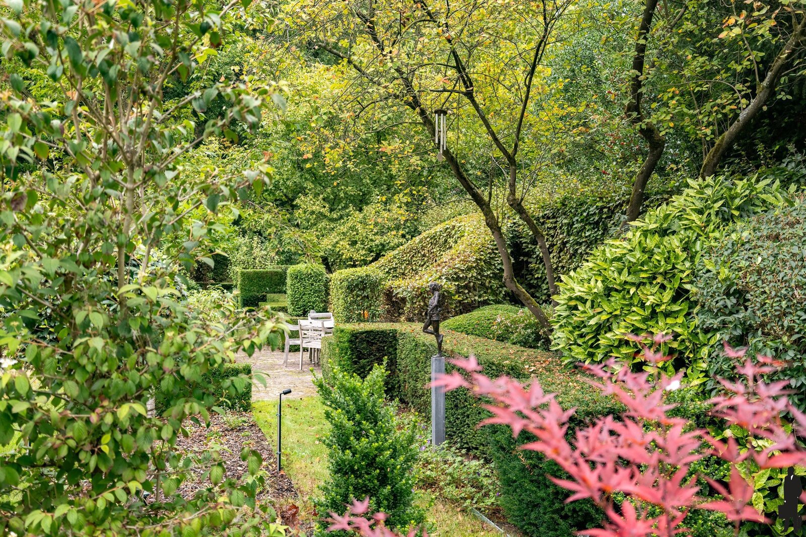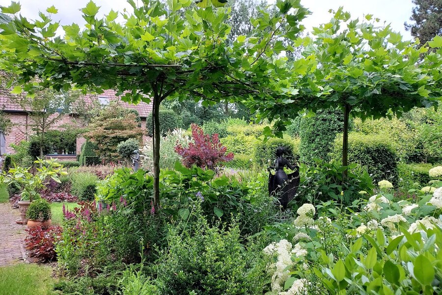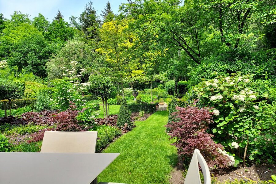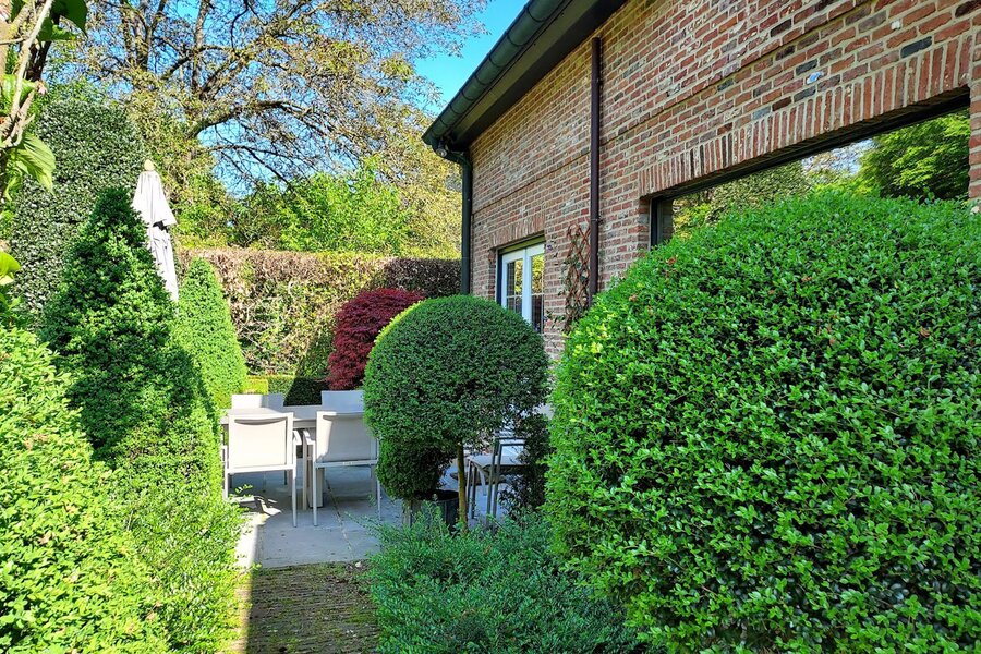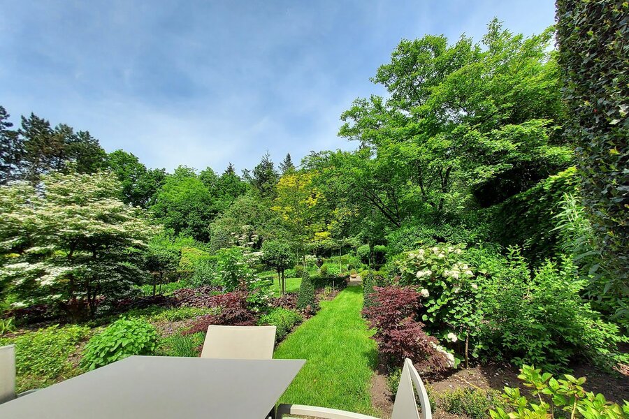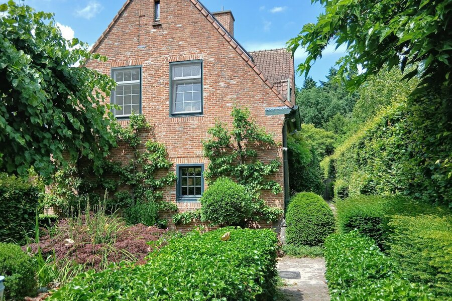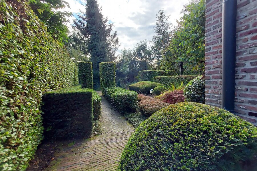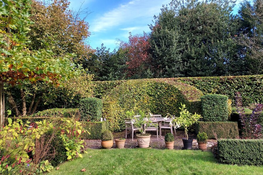 Omringd door natuur en bos is deze tuin is aangelegd onder architectuur en biedt elk seizoen een boeiend geheel dankzij de volgroeide hagen, doordachte rustpunten en een verfijnde plantenkeuze. De tuin is volledig afgesloten, zuidwest georiënteerd en voorzien van verlichting en drie gezellige terrassen, waardoor het in alle seizoenen een heerlijke plek is om te genieten.