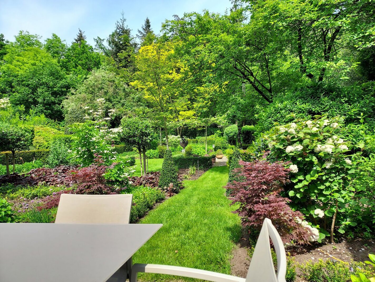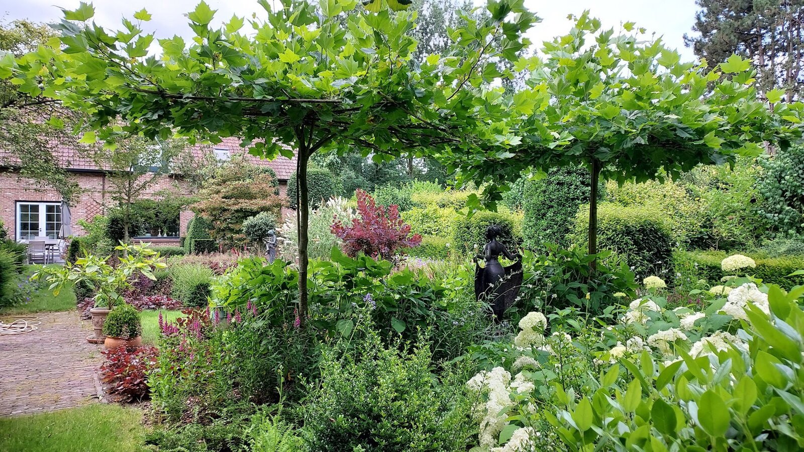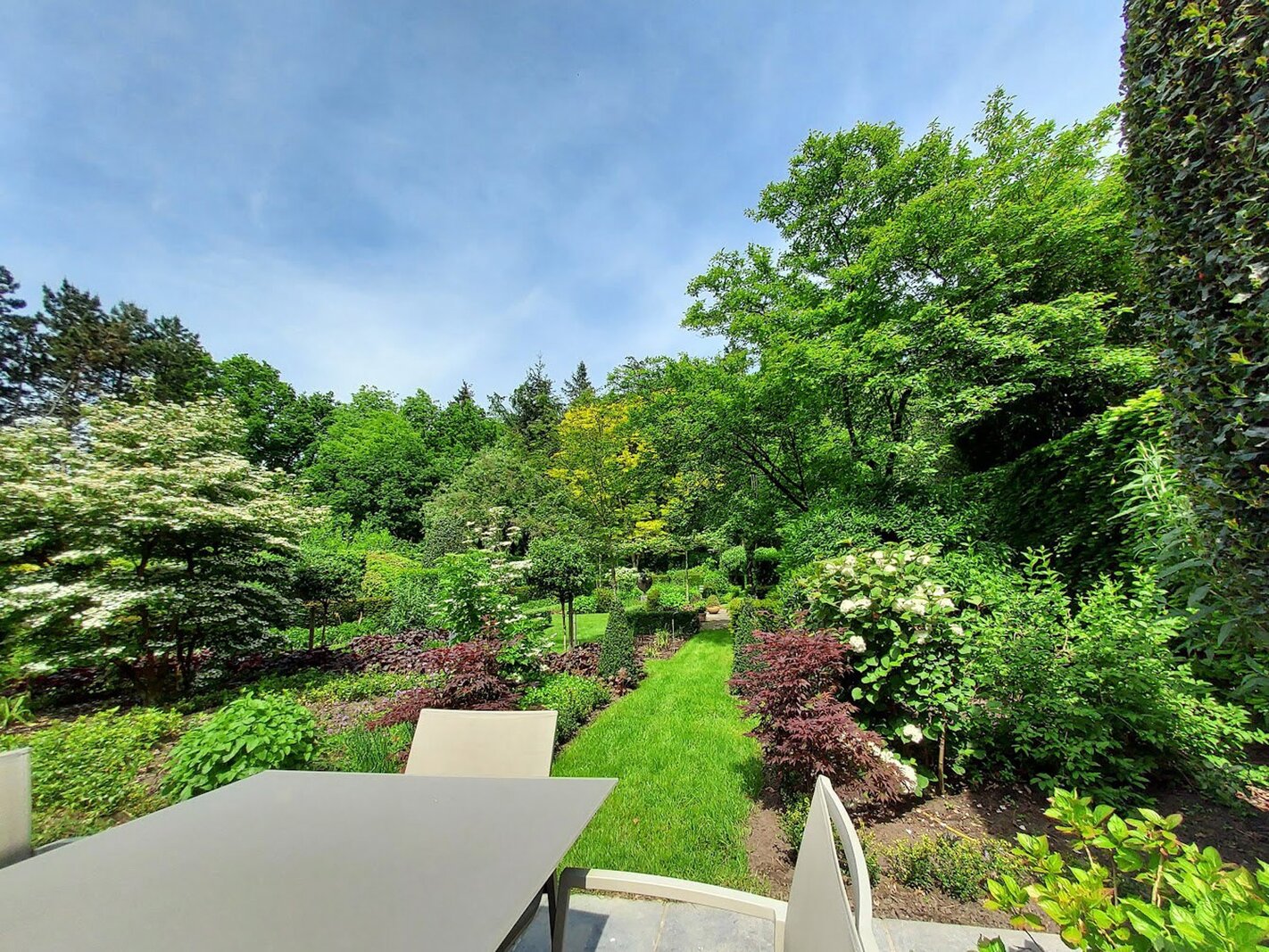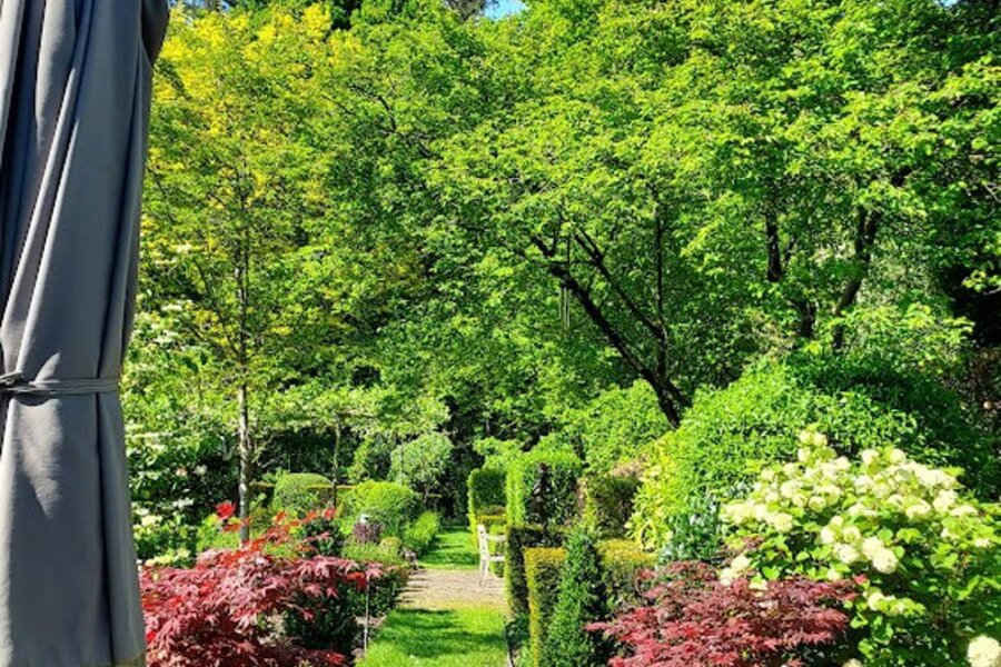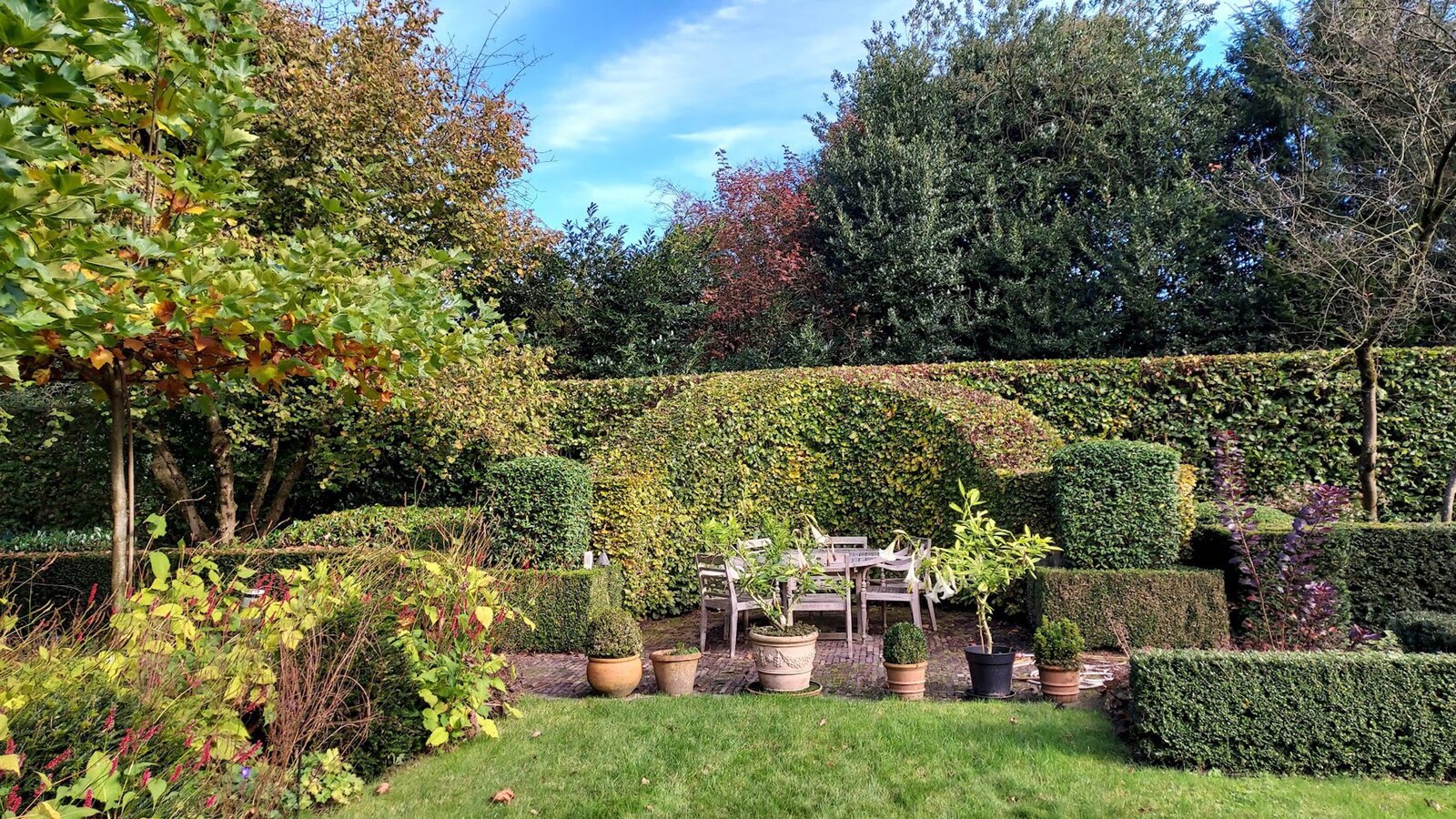 Omringd door natuur en bos is deze tuin is aangelegd onder architectuur en biedt elk seizoen een boeiend geheel dankzij de volgroeide hagen, doordachte rustpunten en een verfijnde plantenkeuze. De tuin is volledig afgesloten, zuidwest georiënteerd en voorzien van verlichting en drie gezellige terrassen, waardoor het in alle seizoenen een heerlijke plek is om te genieten.