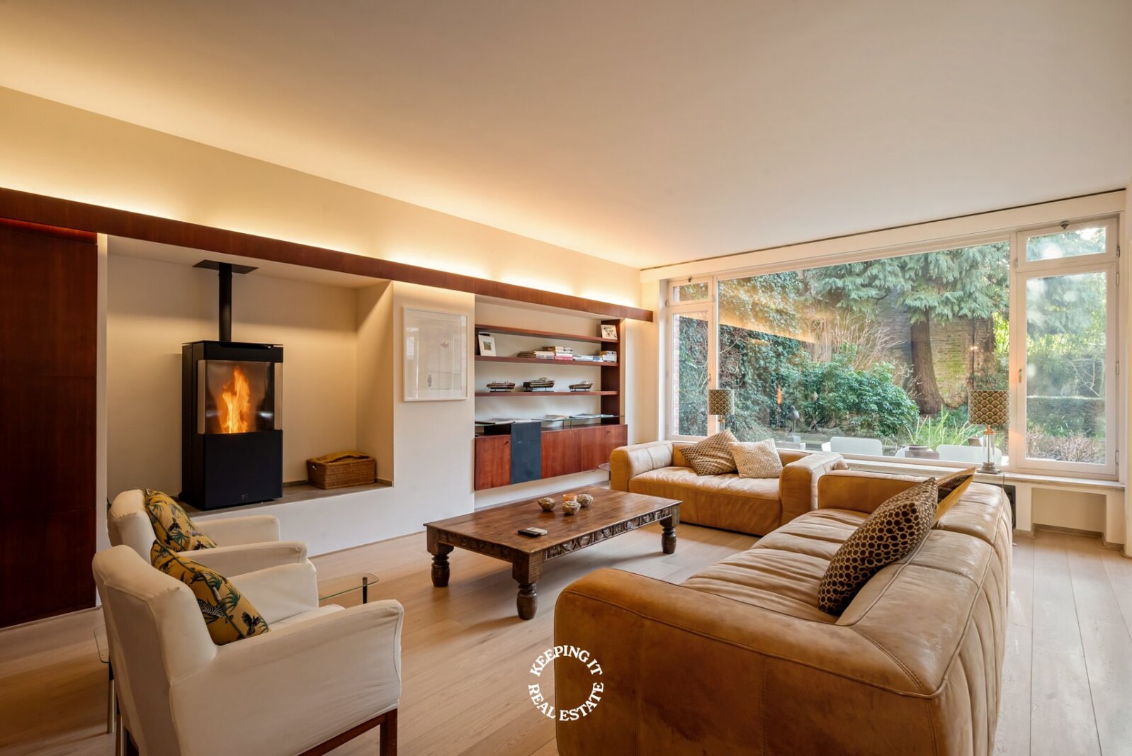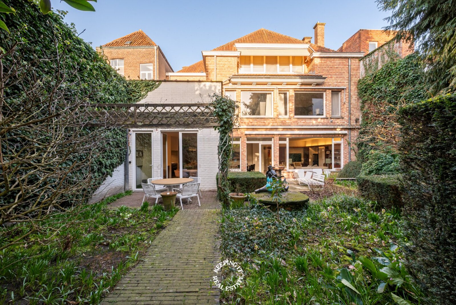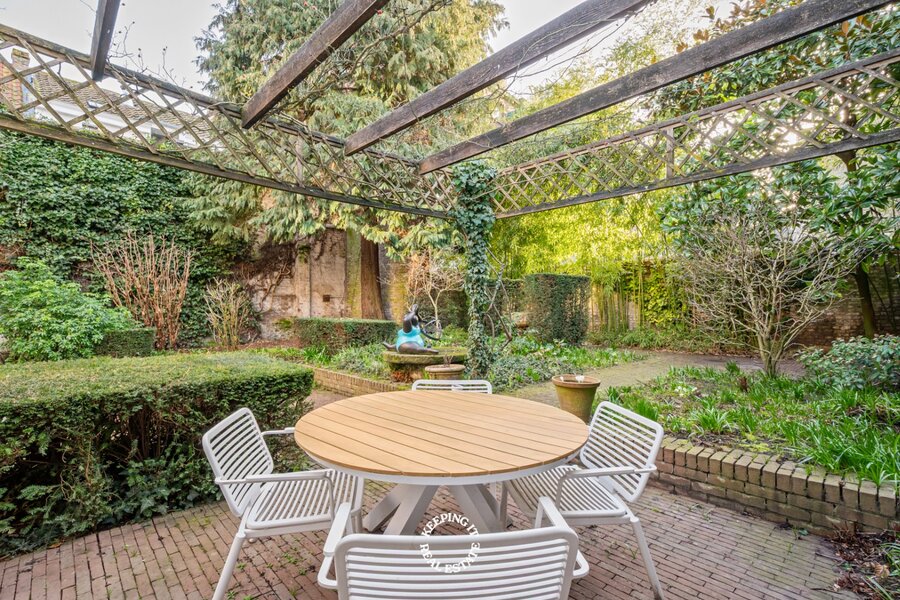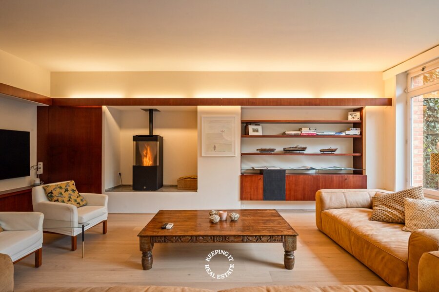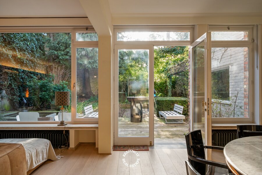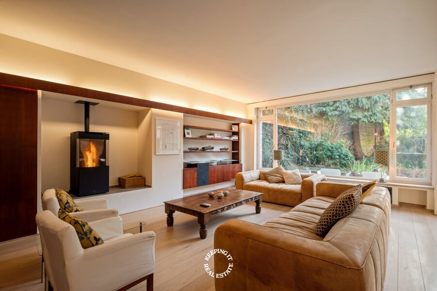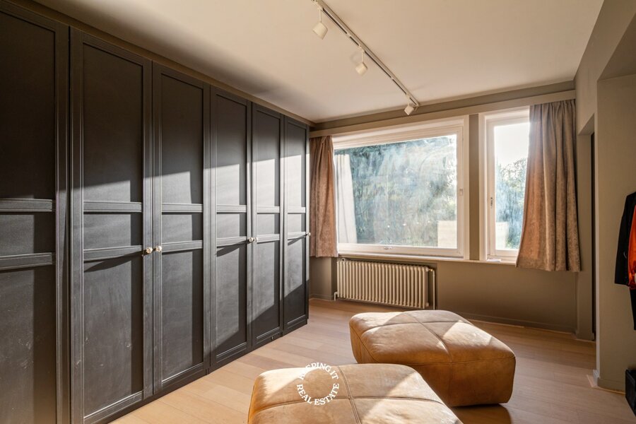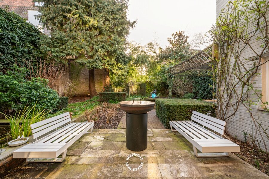 Achter de statige gevel ontvouwt zich een verzorgd en klassevol burgershuis met indrukwekkende volumes. De riante inkom- en traphal zet meteen de toon en leidt naar een bureau, vestiaire met gastentoilet en inpandige garage. De bijzonder ruime en lichtrijke leef- en eetruimte vormen het hart van de woning en geven uit op een prachtige, zonnige zuidwestgerichte tuin. Een groene oase die geniet van opmerkelijke rust en privacy, en bovendien beschikt over een achteruitgang via de garage van het bijhuis in de Waalsestraat.