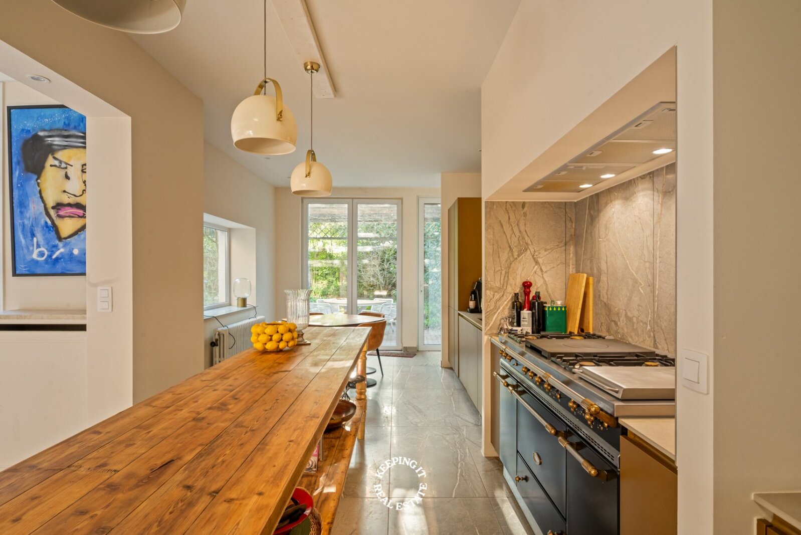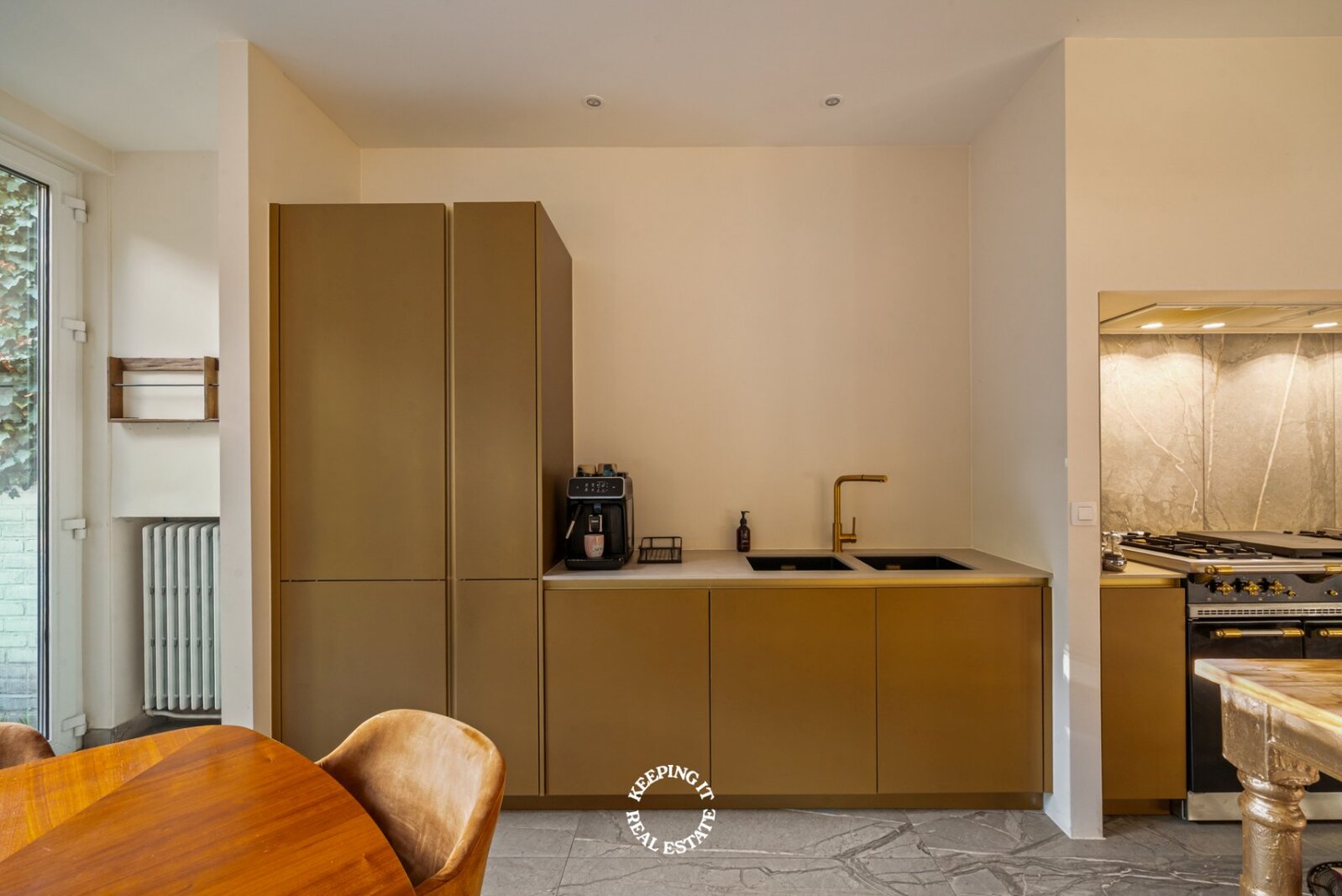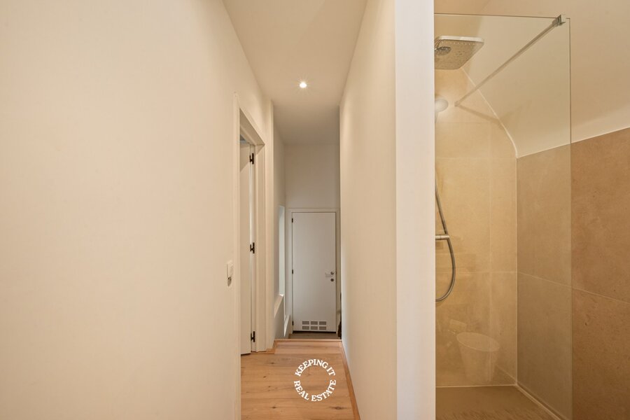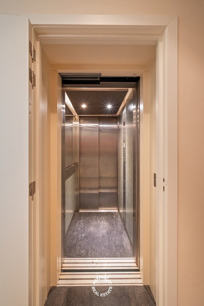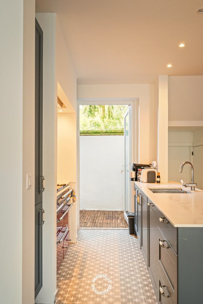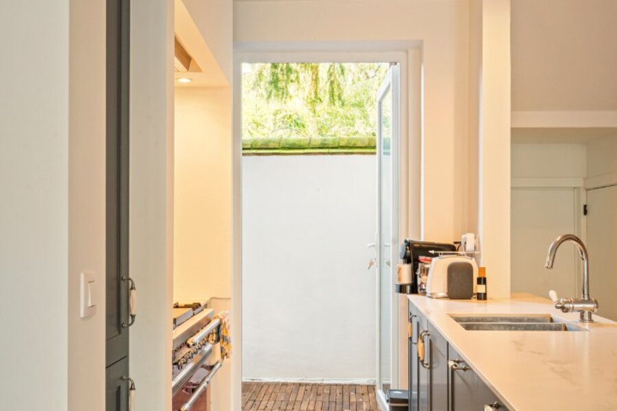 De open keuken met ontbijthoek werd recentelijk volledig vernieuwd, uitgebreid en voorzien van een Lacanche fornuis. Aansluitend aan de keuken treft men nog een praktische berging alsook doorgang naar zowel de centrale traphal als de kelder. De woning is grotendeels onderkelderd en voorzien van een wijnkelder. Ook beschikt deze woning over een lift wat extra comfort en bereikbaarheid biedt.