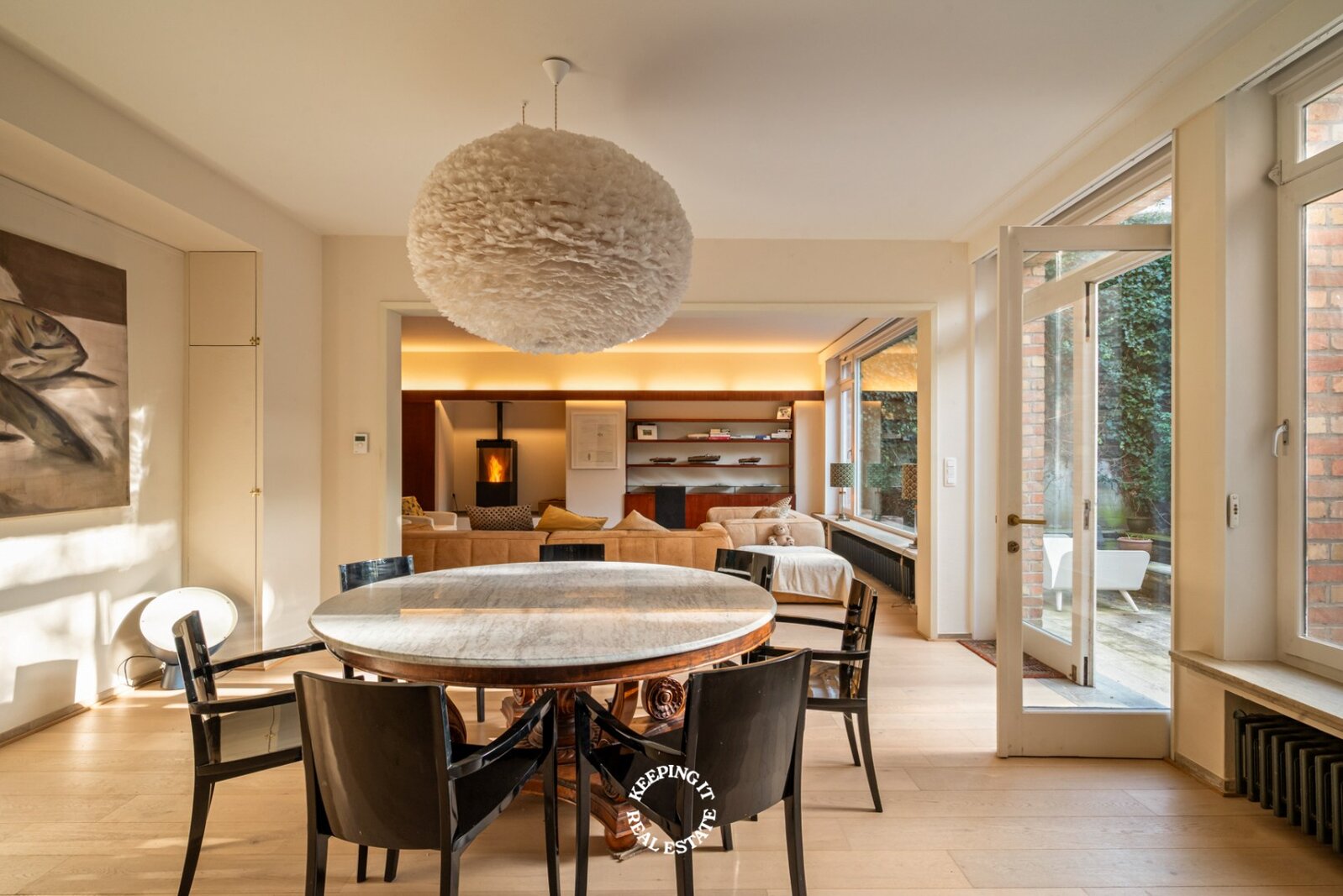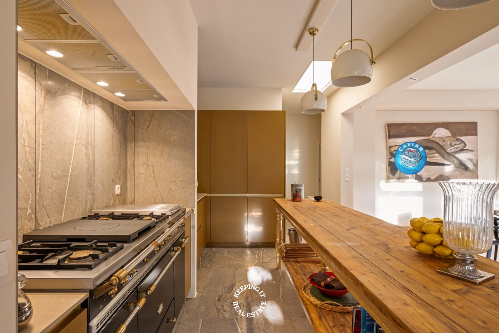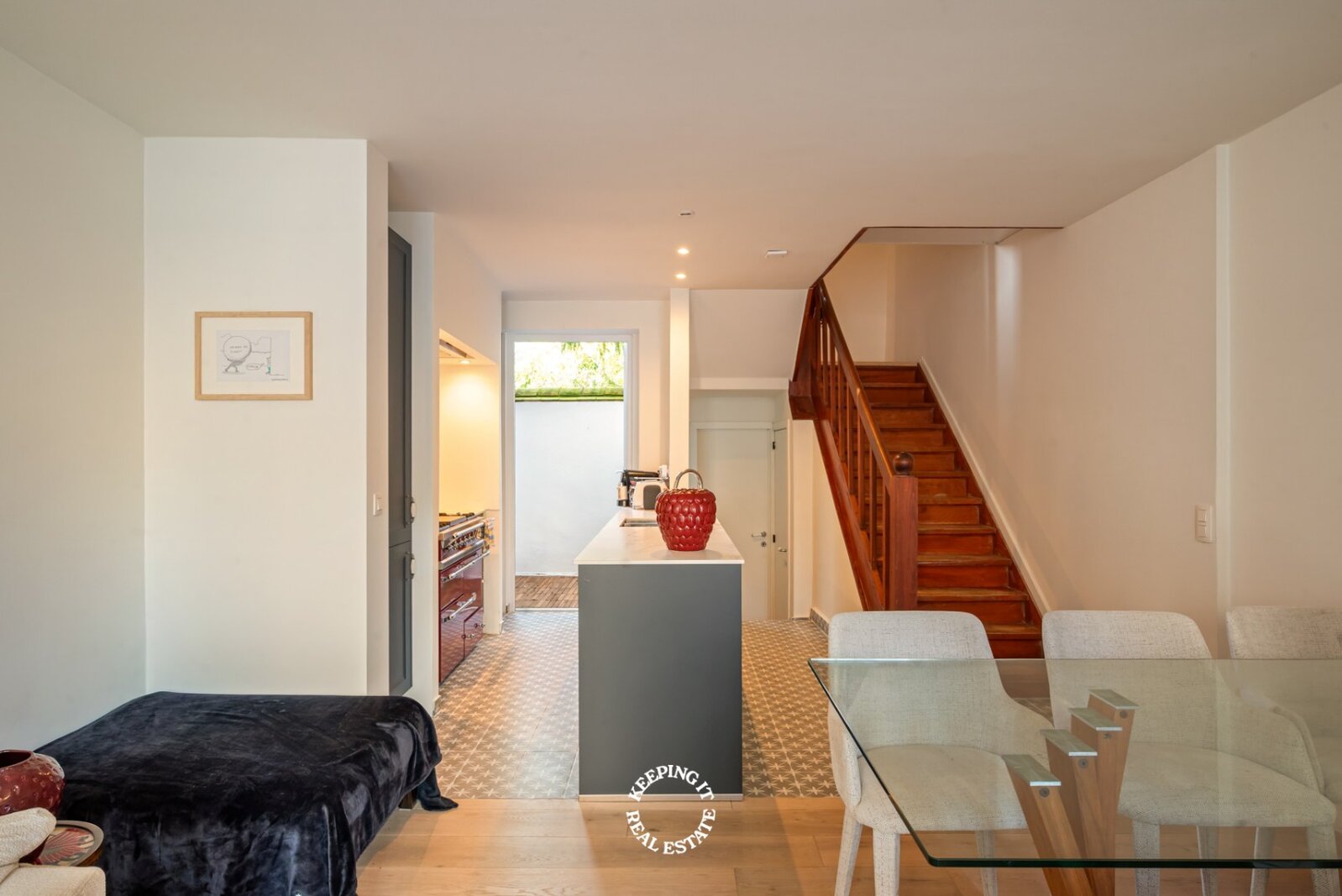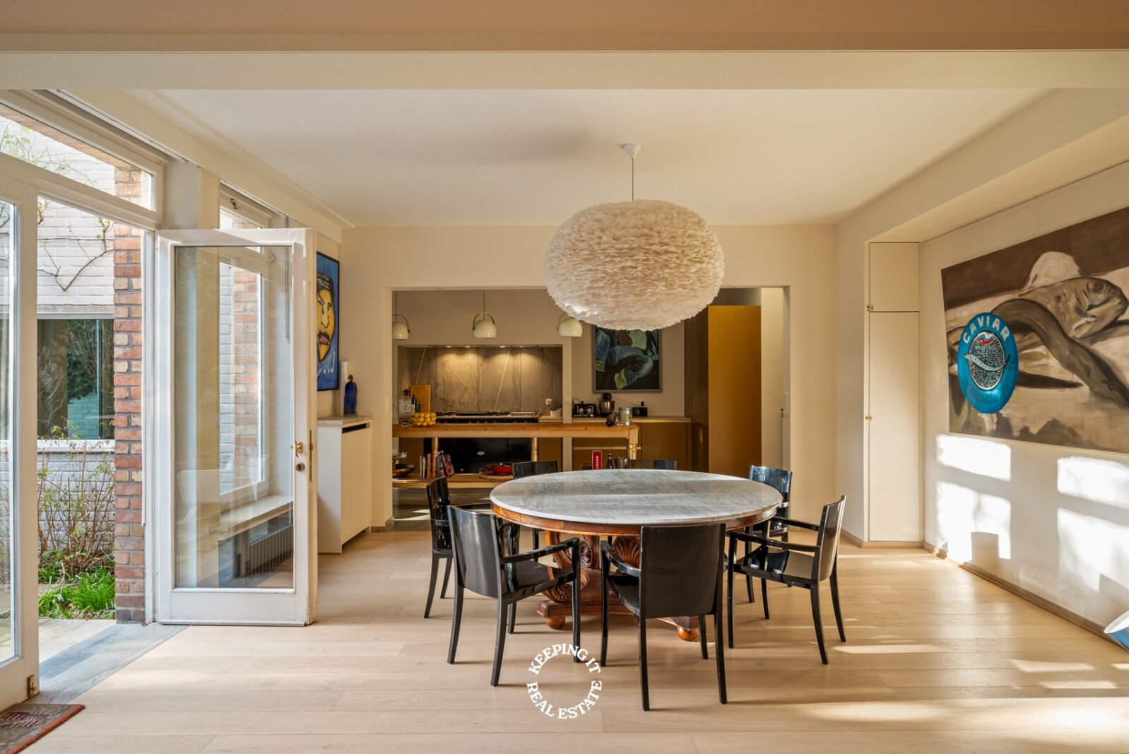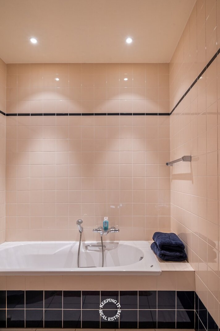 De open keuken met ontbijthoek werd recentelijk volledig vernieuwd, uitgebreid en voorzien van een Lacanche fornuis. Aansluitend aan de keuken treft men nog een praktische berging alsook doorgang naar zowel de centrale traphal als de kelder. De woning is grotendeels onderkelderd en voorzien van een wijnkelder. Ook beschikt deze woning over een lift wat extra comfort en bereikbaarheid biedt.