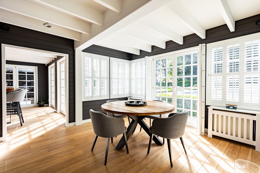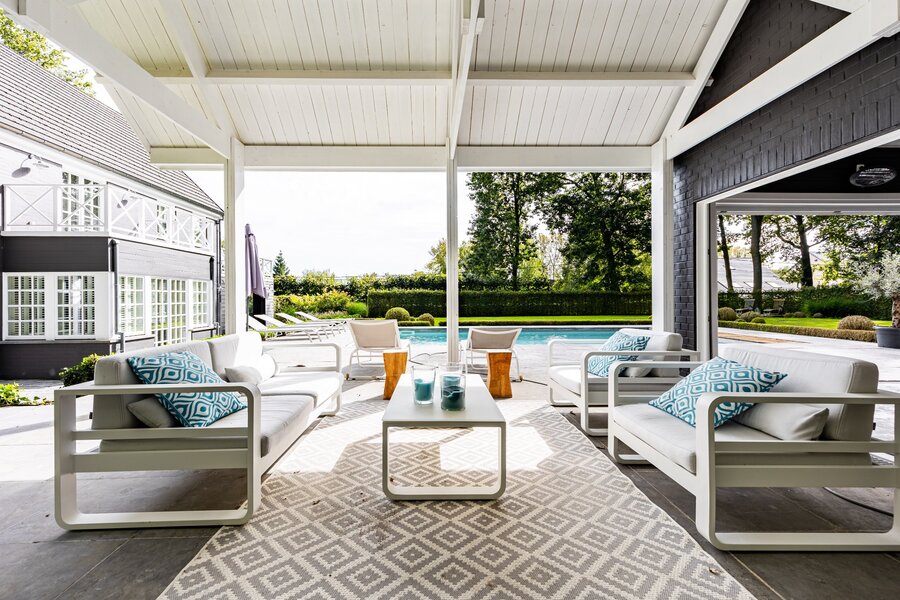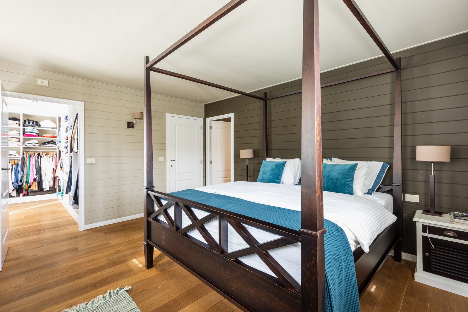 Le rez-de-chaussée comprend un hall d'entrée avec vestiaire et toilettes invités, un salon avec cheminée, un espace en bow-window, une cuisine ouverte entièrement équipée avec salle à manger et accès direct à un jardin d'hiver chauffé (baie vitrée coulissante), ainsi qu'une arrière-cuisine avec buanderie. À l'étage, une suite parentale avec dressing et salle de bains complète donnant accès à une terrasse privative, deux chambres et une salle de douche indépendante. Le second niveau accueille deux chambres (actuellement utilisées comme bureaux) avec possibilité de créer une salle d'eau supplémentaire. Le jardin paysager s'organise autour de larges terrasses, d'une piscine chauffée, d'un poolhouse d'environ 75 m² (séjour, cuisine ouverte, chambre, salle de douche, espace sport) et d'une piste de pétanque.