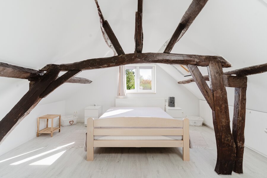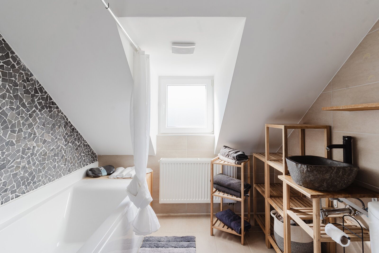 Au rez-de-chaussée, vous trouverez également une première chambre, une salle de bains et des toilettes pour invités – idéal pour vivre au rez-de-chaussée ou pour accueillir des invités.