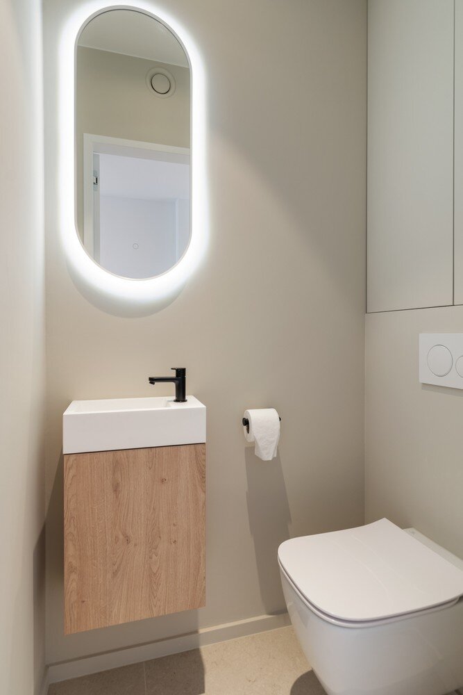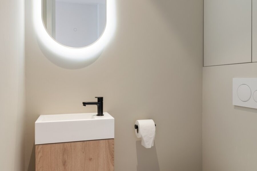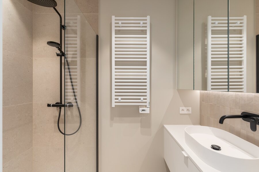 Verfijnd afgewerkte douchekamer met lavabo. Daarnaast is er een praktische berging met aansluiting voor wasmachine.