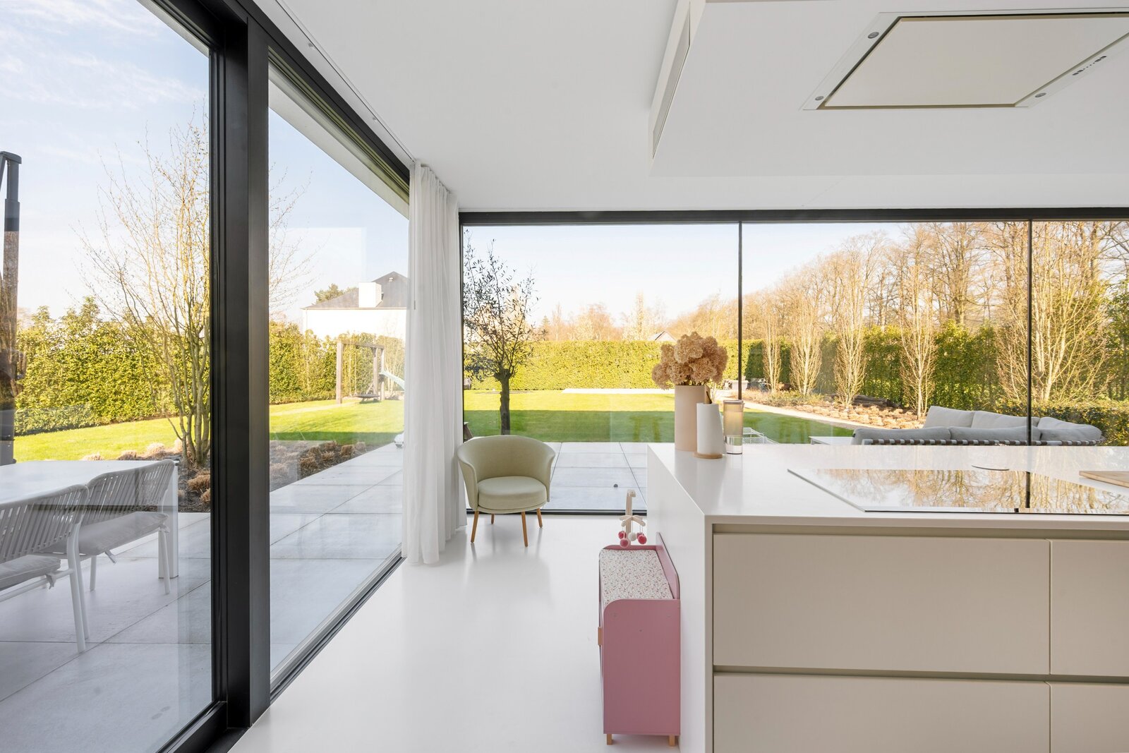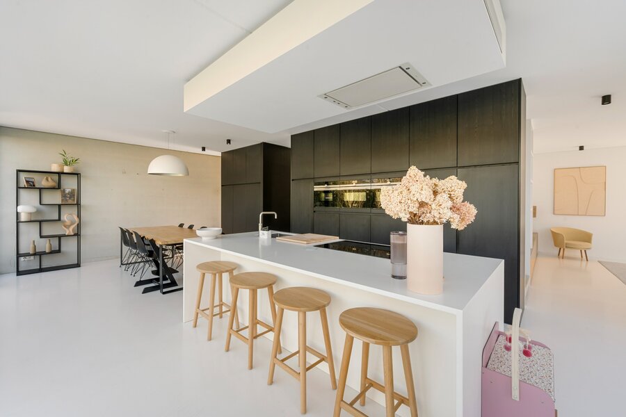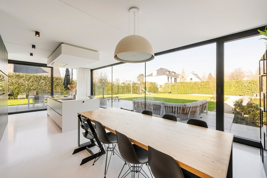 La cuisine ouverte est un véritable point de mire, avec un grand îlot de cuisine en Corian, un coin repas confortable et une belle vue sur le jardin. La cuisine est luxueusement finie et équipée de tous les appareils modernes, dont trois fours, une plaque à induction, un lave-vaisselle et un réfrigérateur.