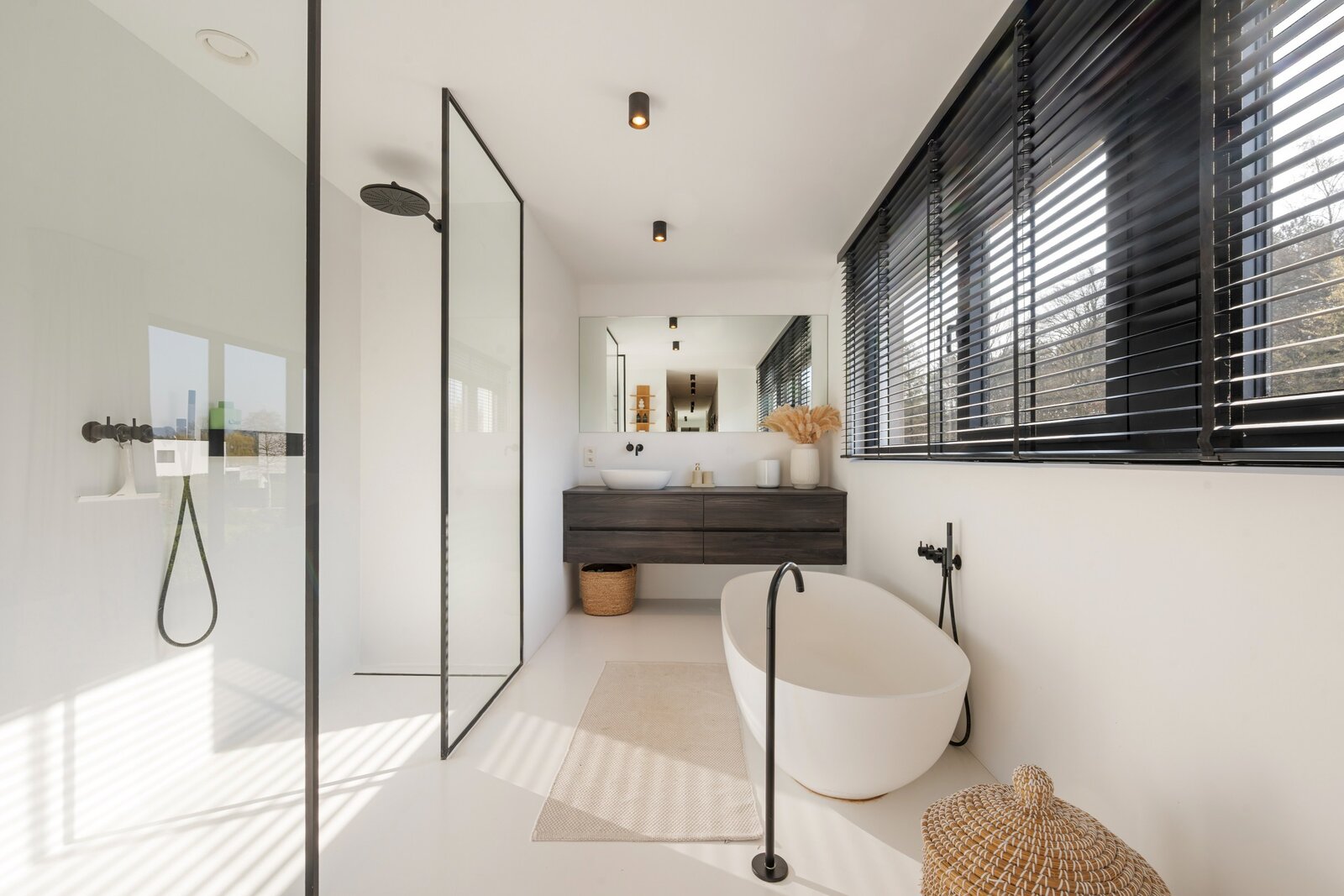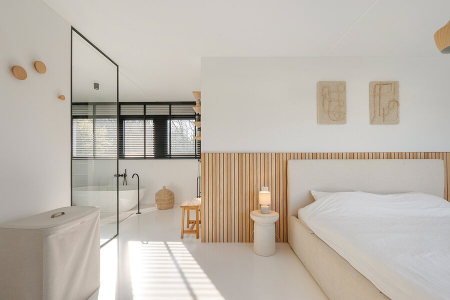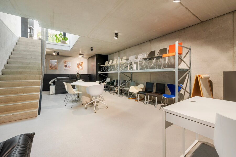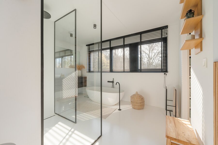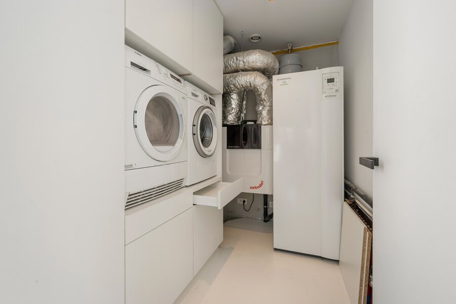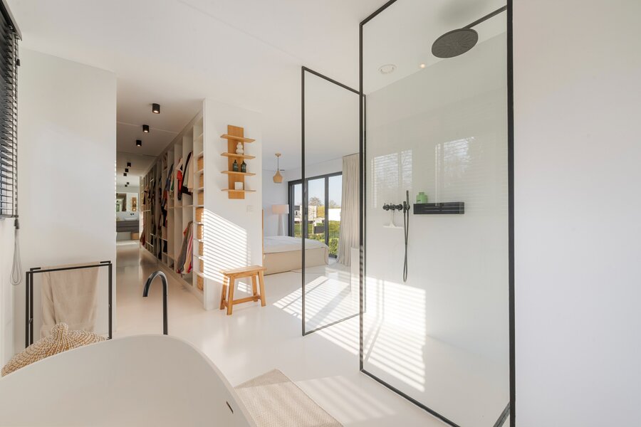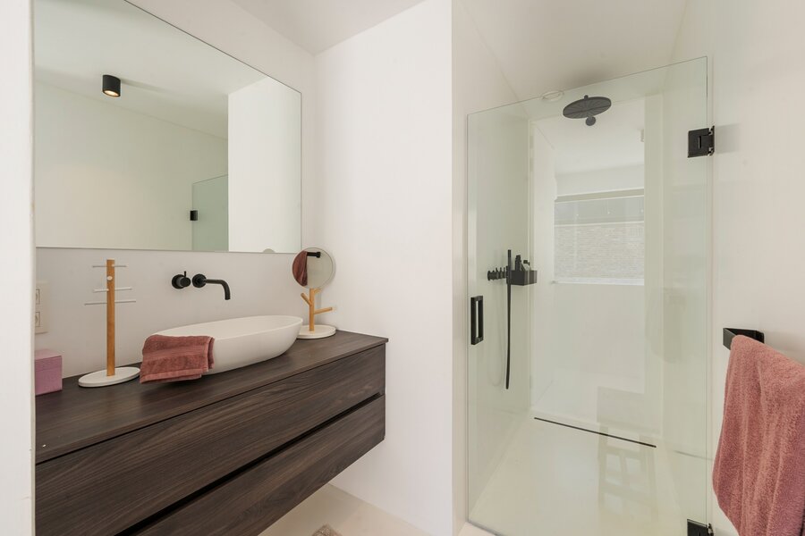 À l'étage, vous trouverez un grand palier avec espace bureau, deux chambres d'enfants, une élégante salle de douche avec lavabo et une grande douche à l'italienne, ainsi qu'une grande chambre principale avec dressing intégré et salle de bains ouverte. Cette salle de bains est équipée d'un meuble-lavabo élégant, d'une douche à l'italienne et d'une baignoire, finie avec des robinets Vola élégants. De plus, à cet étage, il y a des toilettes séparées et un débarras technique pratique.