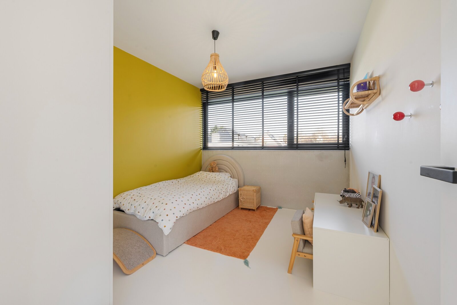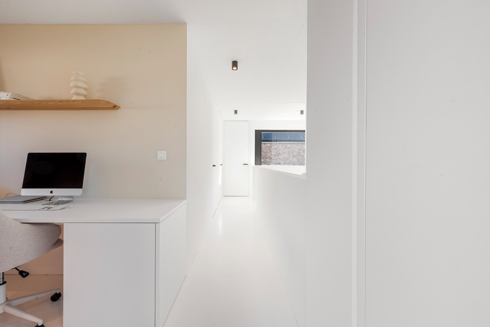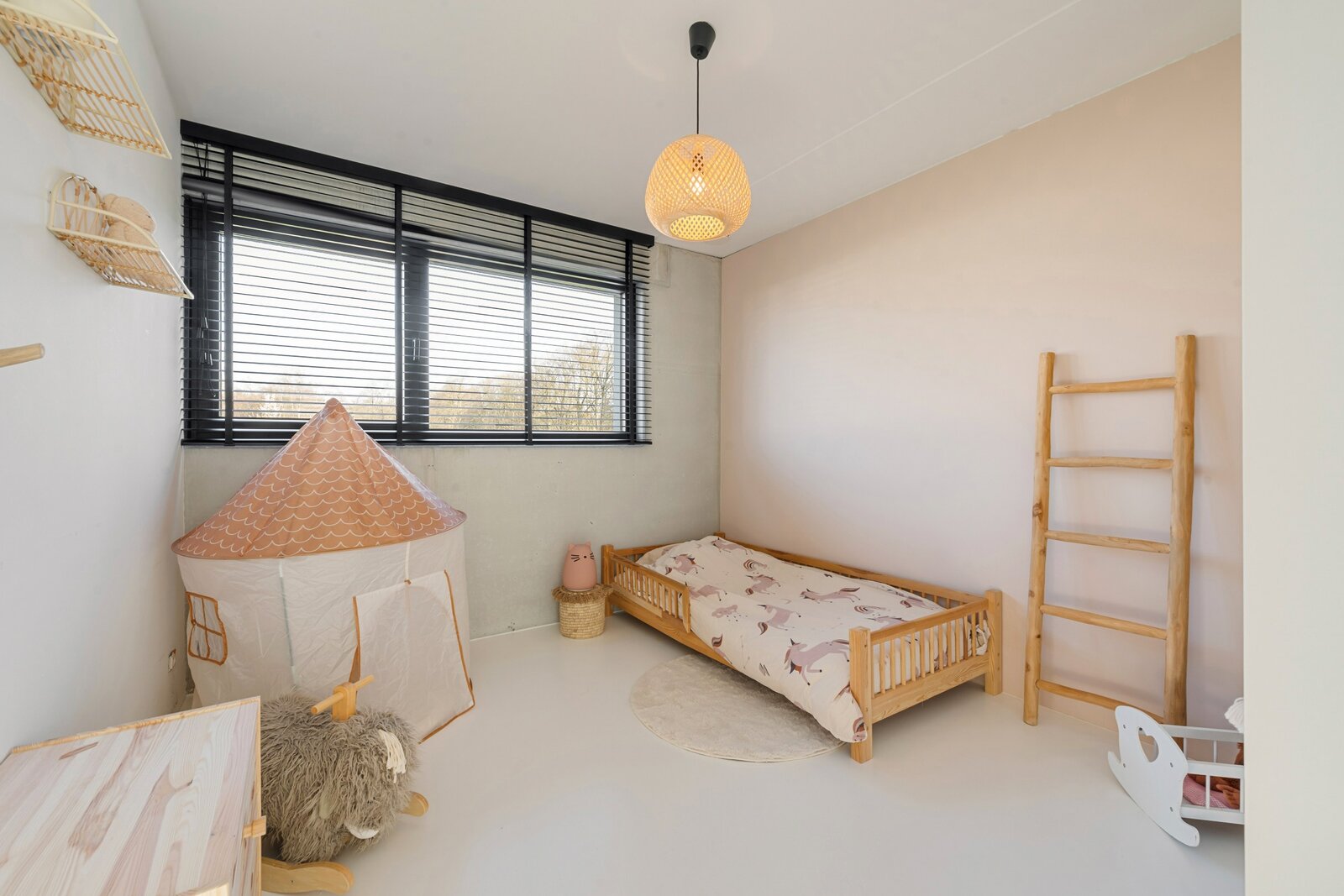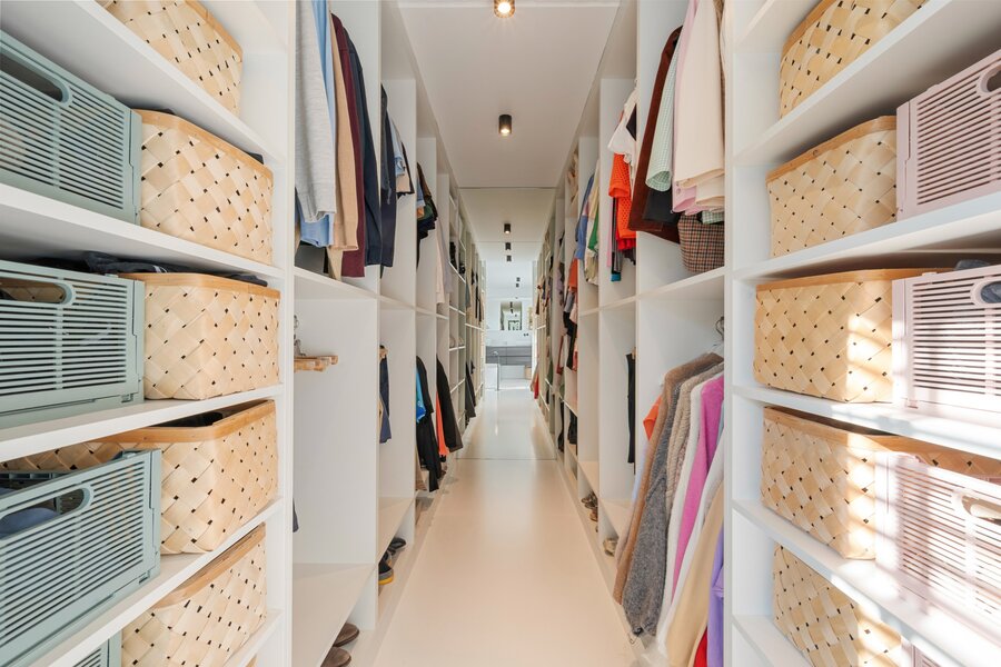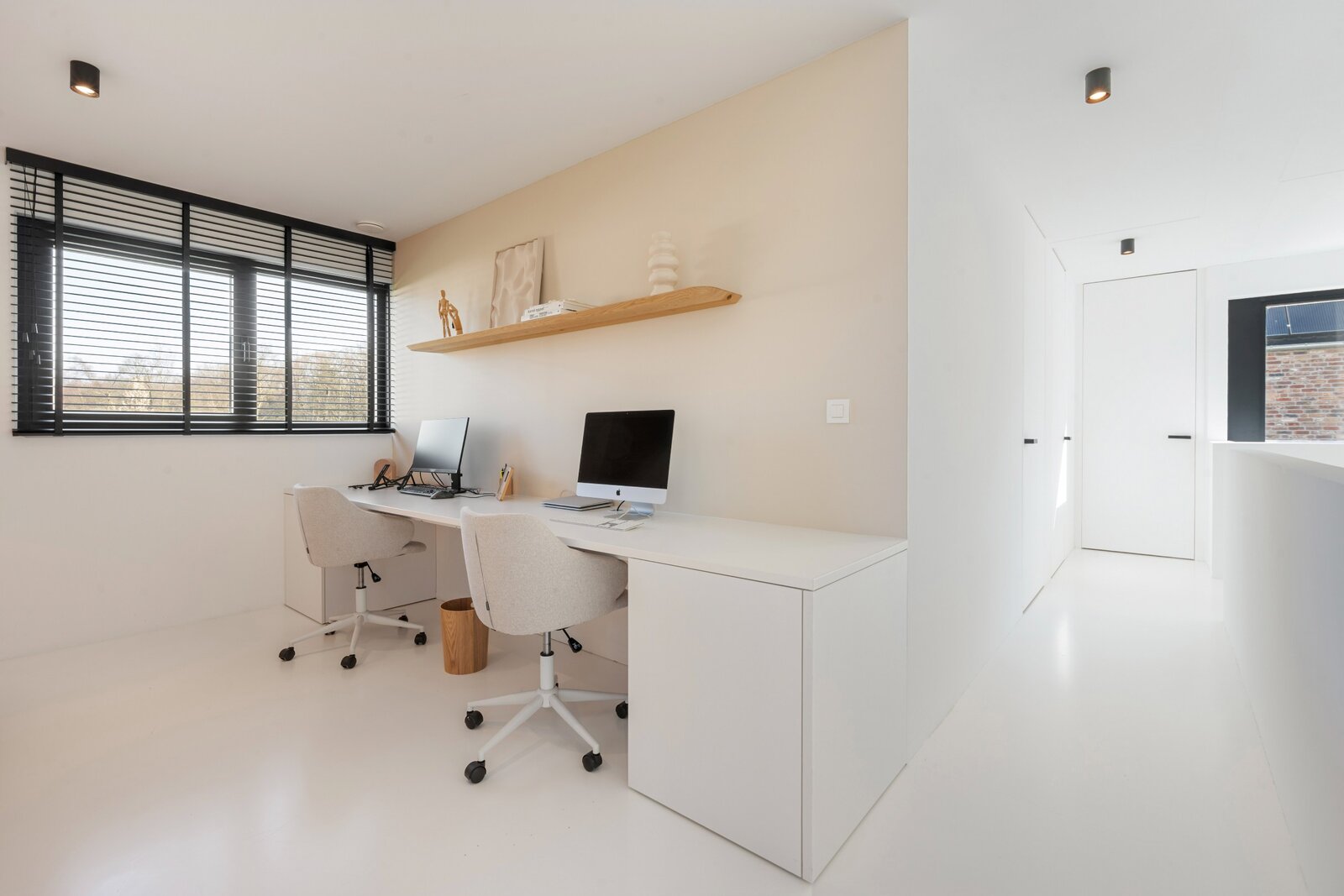 À l'étage, vous trouverez un grand palier avec espace bureau, deux chambres d'enfants, une élégante salle de douche avec lavabo et une grande douche à l'italienne, ainsi qu'une grande chambre principale avec dressing intégré et salle de bains ouverte. Cette salle de bains est équipée d'un meuble-lavabo élégant, d'une douche à l'italienne et d'une baignoire, finie avec des robinets Vola élégants. De plus, à cet étage, il y a des toilettes séparées et un débarras technique pratique.