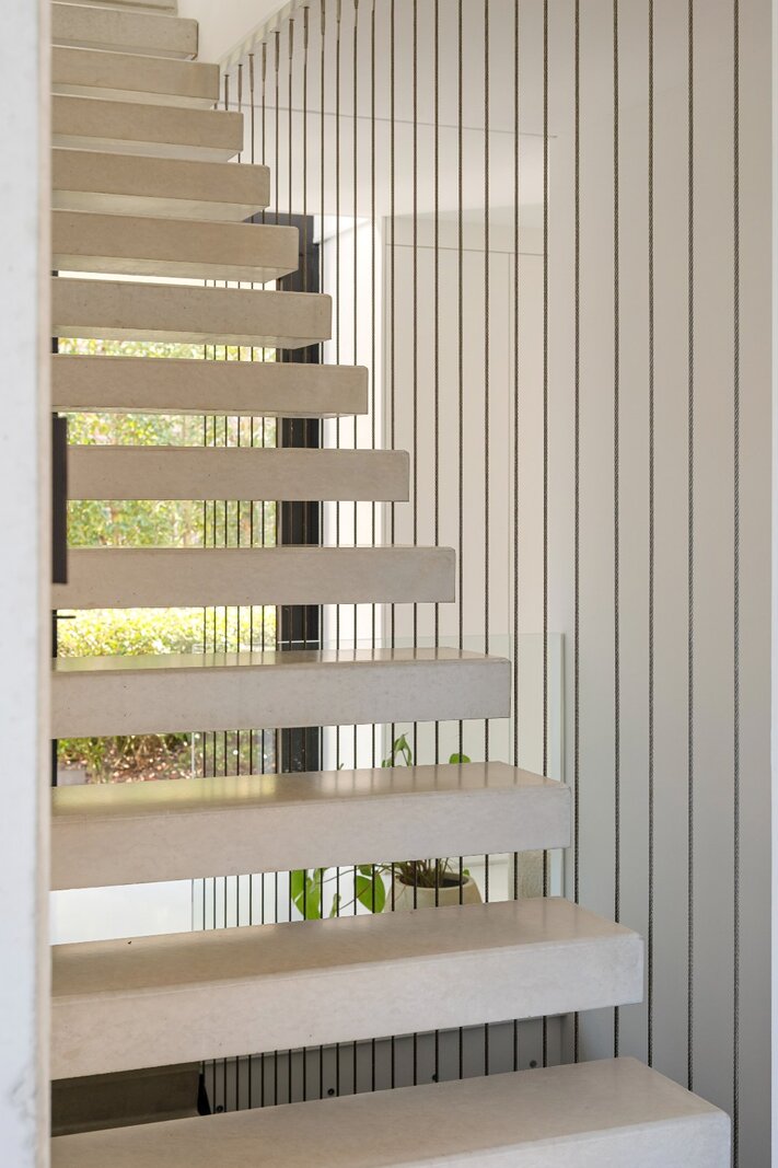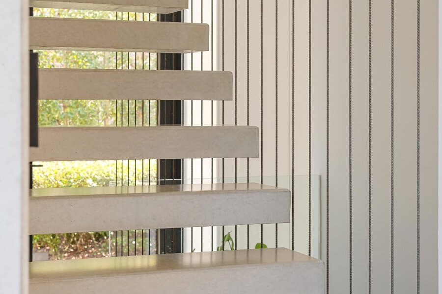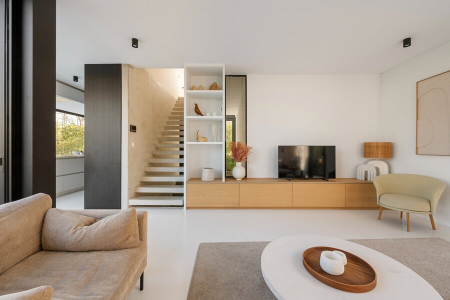 Adjacent se trouve le salon lumineux, où de grandes baies vitrées offrent une agréable connexion avec l'extérieur. L'escalier mène à l'étage supérieur depuis le salon.