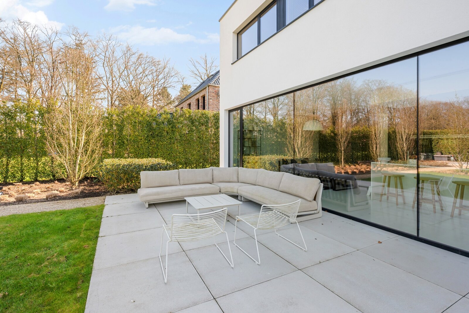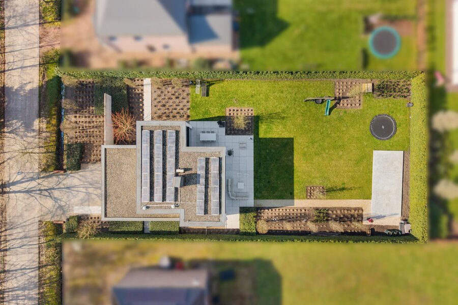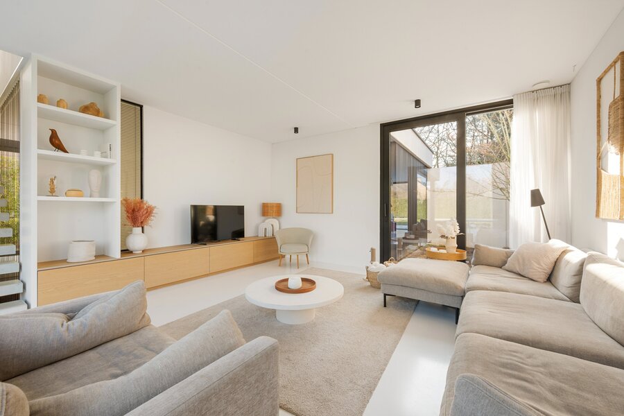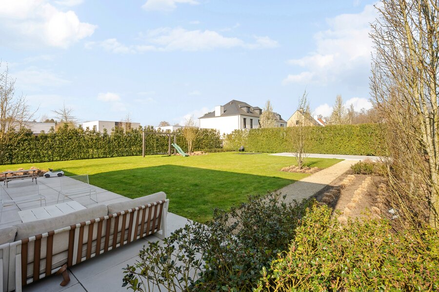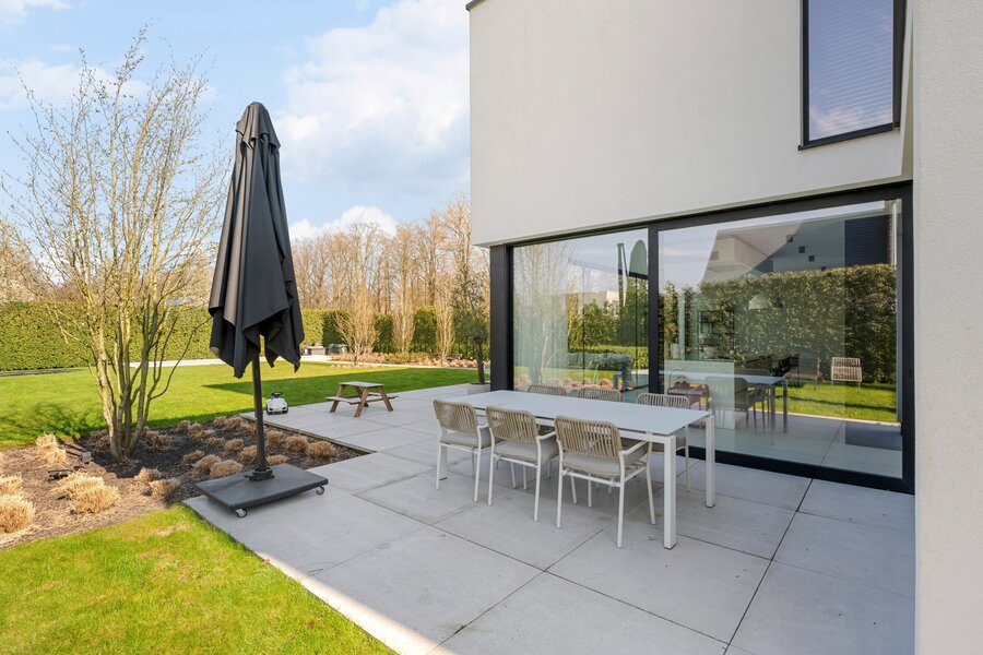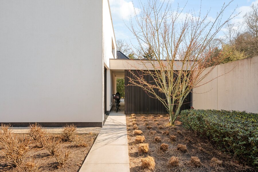 À travers les grandes baies vitrées du salon, vous accédez à la belle terrasse et au jardin, où vous pourrez profiter de la tranquillité de la verdure. À l'arrière de la parcelle se trouve également une dépendance d'environ 40 m², actuellement en construction. Abri pour 2 voitures et local à vélos à l'avant de la villa.
