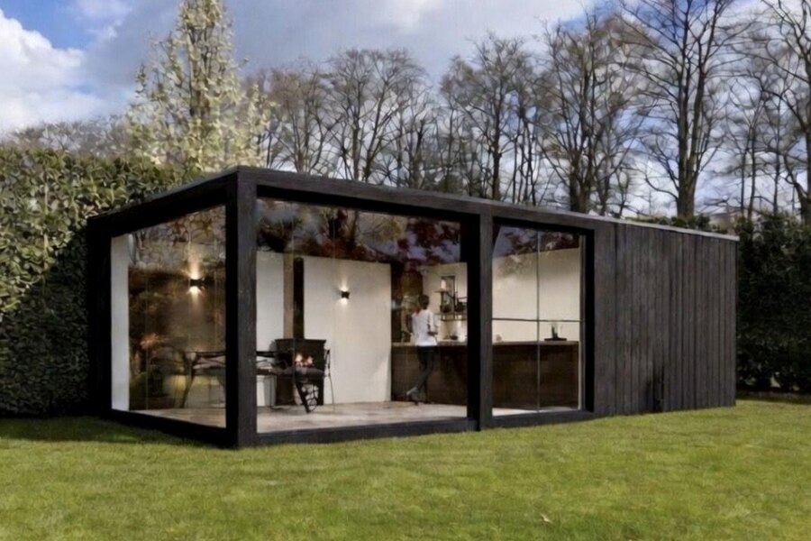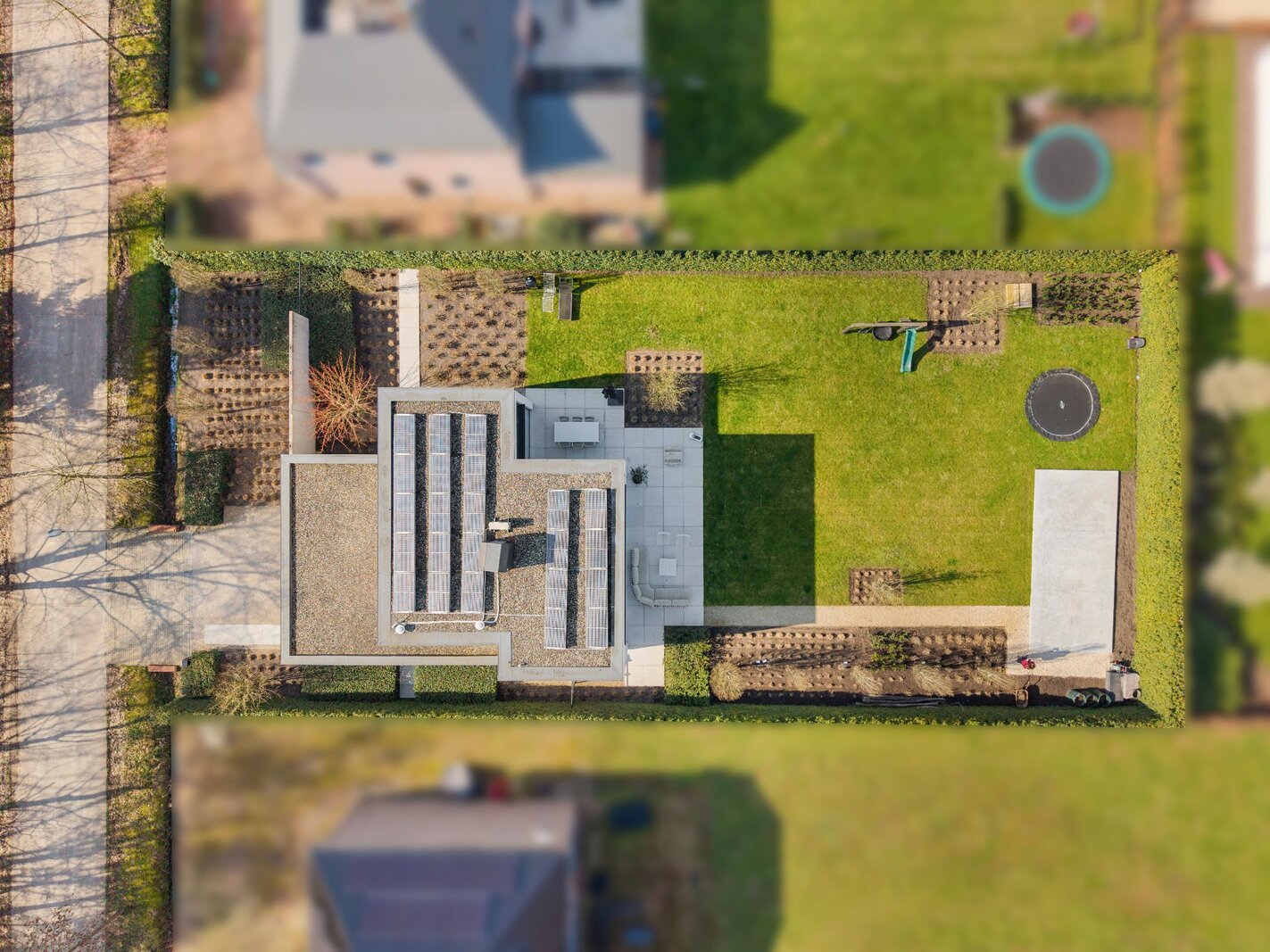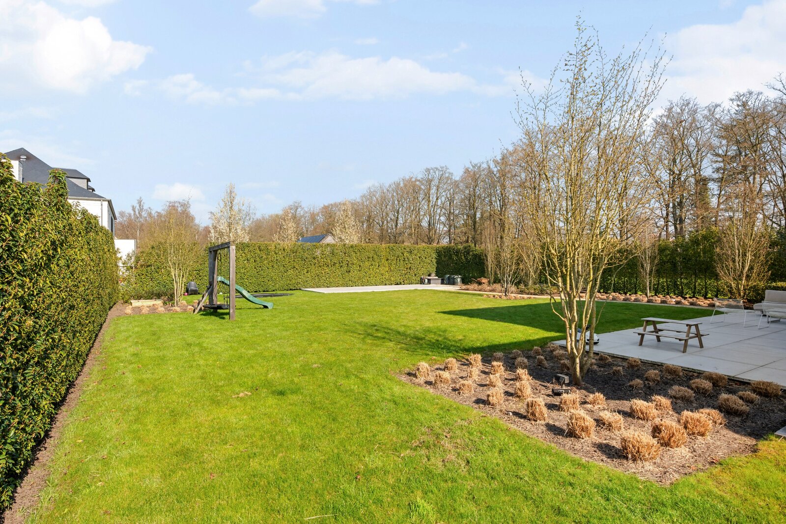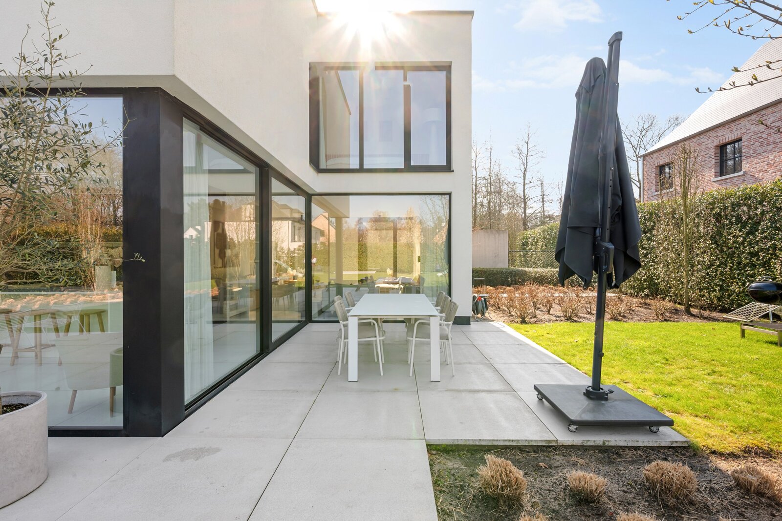 À travers les grandes baies vitrées du salon, vous accédez à la belle terrasse et au jardin, où vous pourrez profiter de la tranquillité de la verdure. À l'arrière de la parcelle se trouve également une dépendance d'environ 40 m², actuellement en construction. Abri pour 2 voitures et local à vélos à l'avant de la villa.