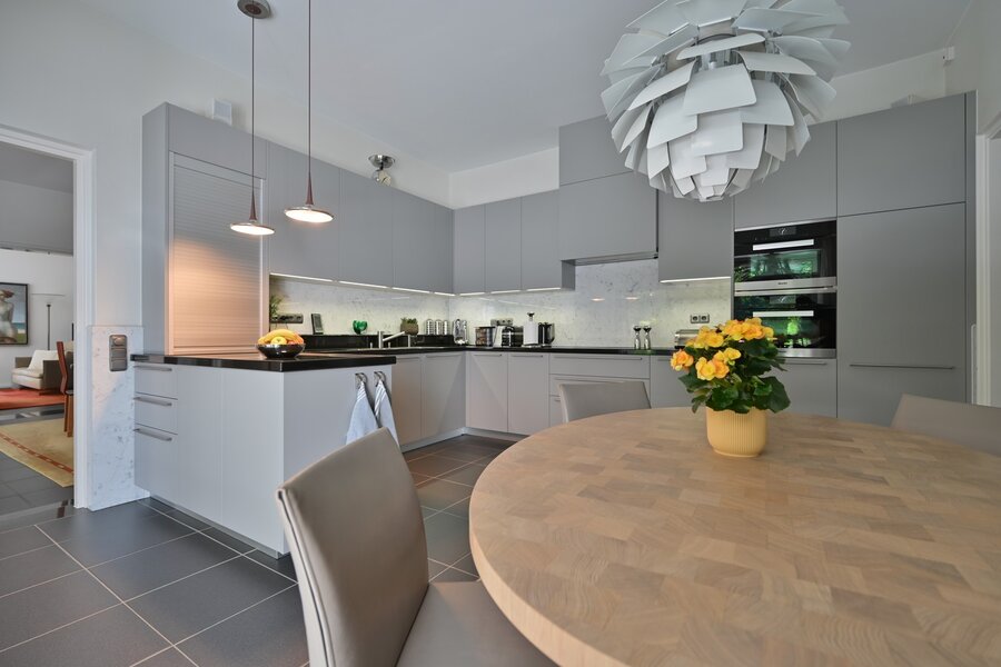 De maatwerk-leefkeuken met eetgedeelte sluit naadloos aan op de terrassen en biedt een schitterend zicht op de tuin. Vanuit hier bereikt u tevens de praktische berging en garages.