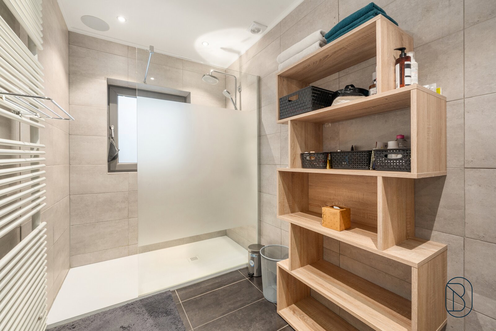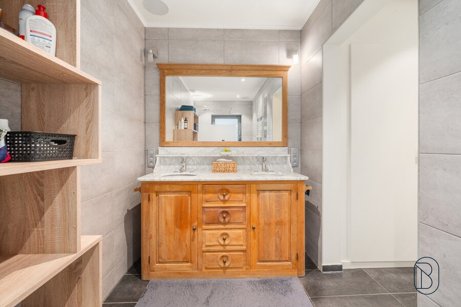 INDELING: inkomhal, apart toilet, ruime en lichtrijke leefruimte (44 m²) met open haard en mooi parket, volledig geïnstalleerde keuken met aparte eetplaats en groot terras (63 m²). Op de verdieping: overloop, badkamer met ligbad, douche en dubbele lavabo, en 4 ruime slaapkamers (28 m², 20 m², 15 m² en 12 m²). Verder is er een zeer grote kelder aanwezig (69 m²).