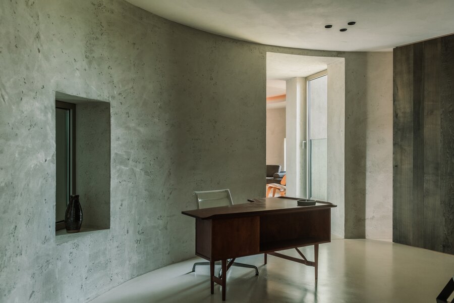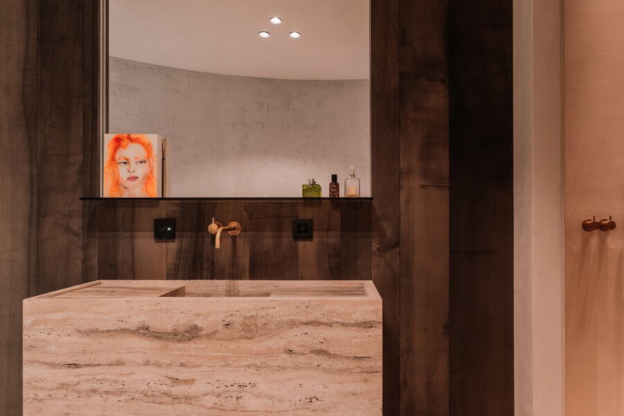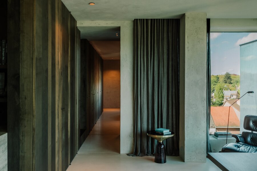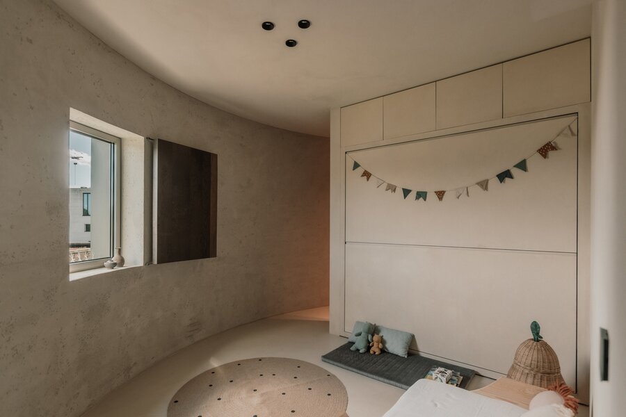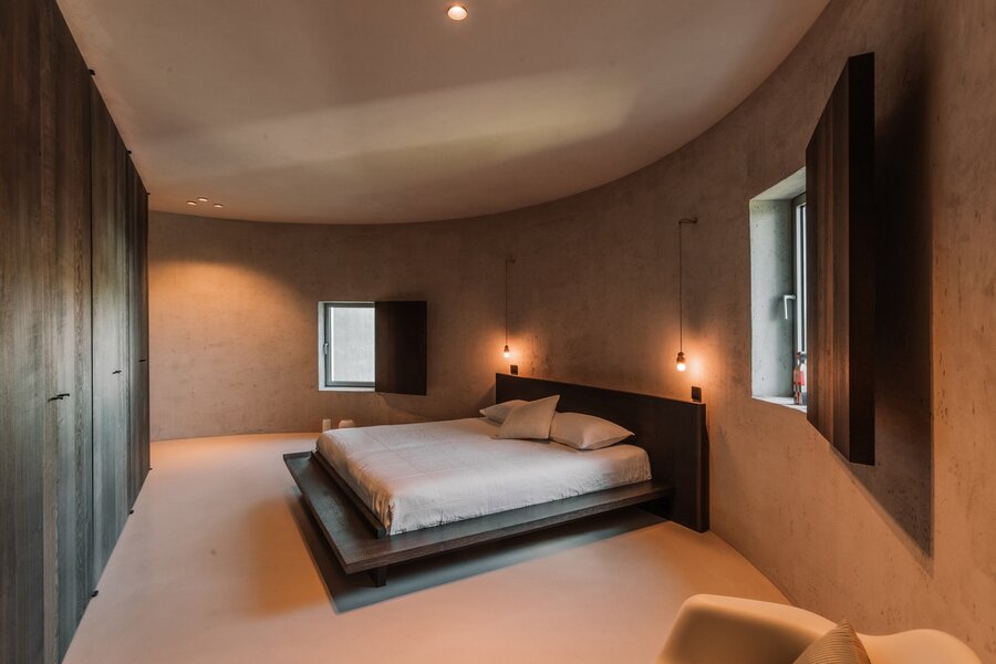 Arch. Stéphane Beel a transformé les silos historiques en résidences de luxe. L'arch. Arjaan De Feyter est responsable de la conception de ce loft à coque, dont les formes rondes attirent irrésistiblement le regard. Des armoires encastrées et des toilettes pour invités se trouvent derrière le mur en bois, tout comme la chambre des enfants, avec ses lits superposés et sa salle de bains super cool.
