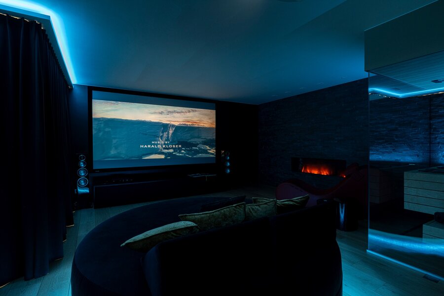 Cuisine ouverte équipée de placards encastrés, réfrigérateur, grand congélateur encastré séparé, four combiné, plaque de cuisson à induction avec hotte aspirante automatique à commande par panneau de commande. Local technique avec raccordements pour lave-linge et sèche-linge, ainsi qu'adoucisseur d'eau. Grand salon avec cheminée design électrique encastrée, home cinéma via projecteur et système audio haut de gamme où vous pourrez profiter d'une soirée cinéma relaxante avec votre partenaire, vos amis ou votre famille. Une première terrasse avec arrivée d'eau donnant sur le MAS. Toute la cuisine-séjour est équipée de banquettes aux fenêtres donnant sur le port de plaisance. Enfin, détendez-vous dans le sauna finlandais et le sauna infrarouge. Ce sauna sophistiqué propose des sessions d'arrosage automatiques où vous pouvez choisir entre trois arômes différents, un système audio intégré et un éclairage LED.