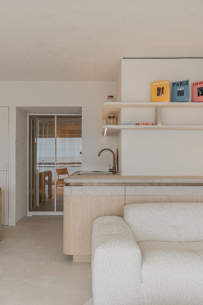 Cet appartement clé en main dispose d'un hall d'entrée avec toilettes invités séparées et un vestiaire encastré. Le salon spacieux et lumineux avec coin salon confortable offre une vue frontale imprenable sur la mer et donne accès à une agréable terrasse.