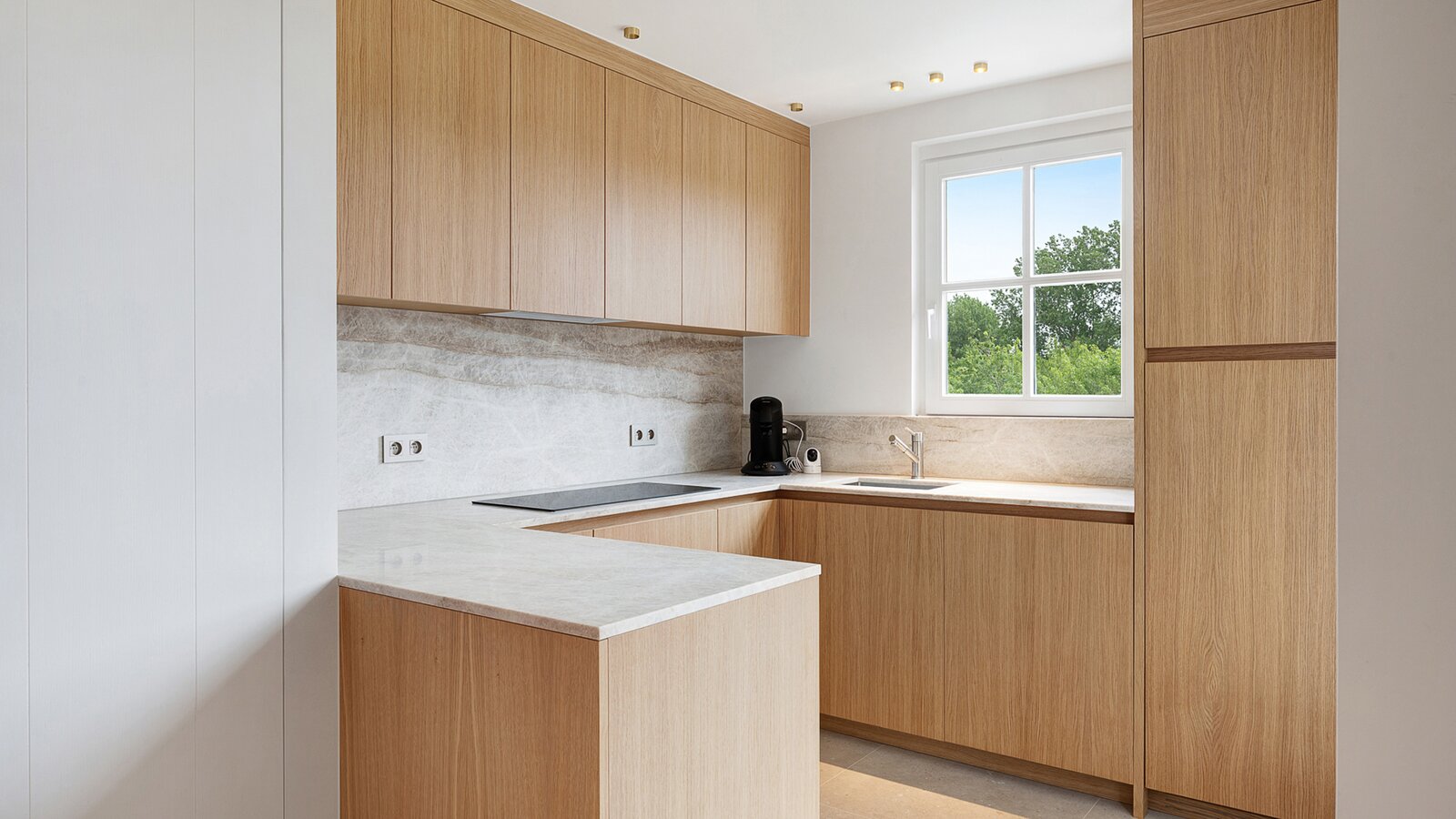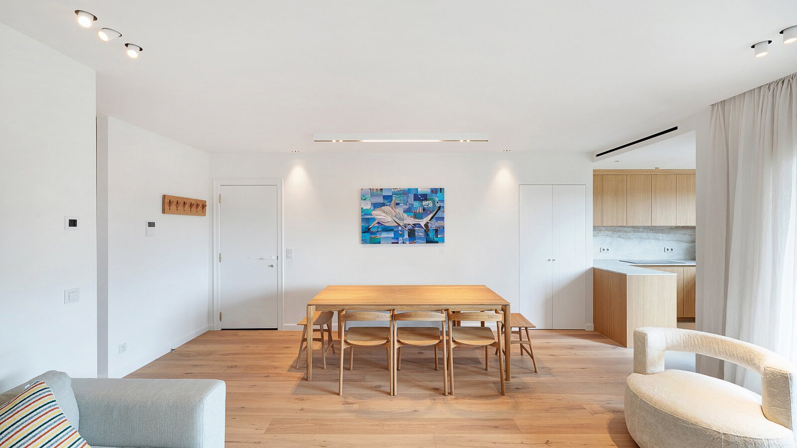 La cuisine ouverte entièrement équipée se connecte parfaitement au salon et est dotée de tout le confort contemporain.