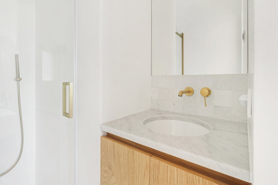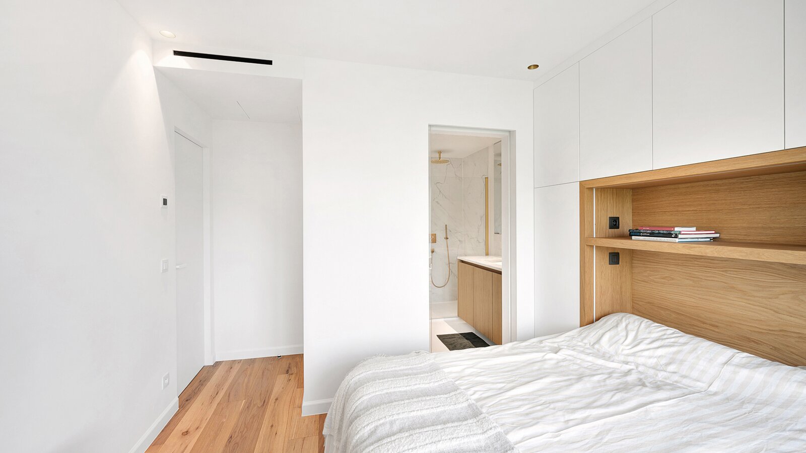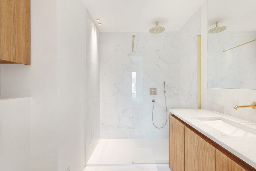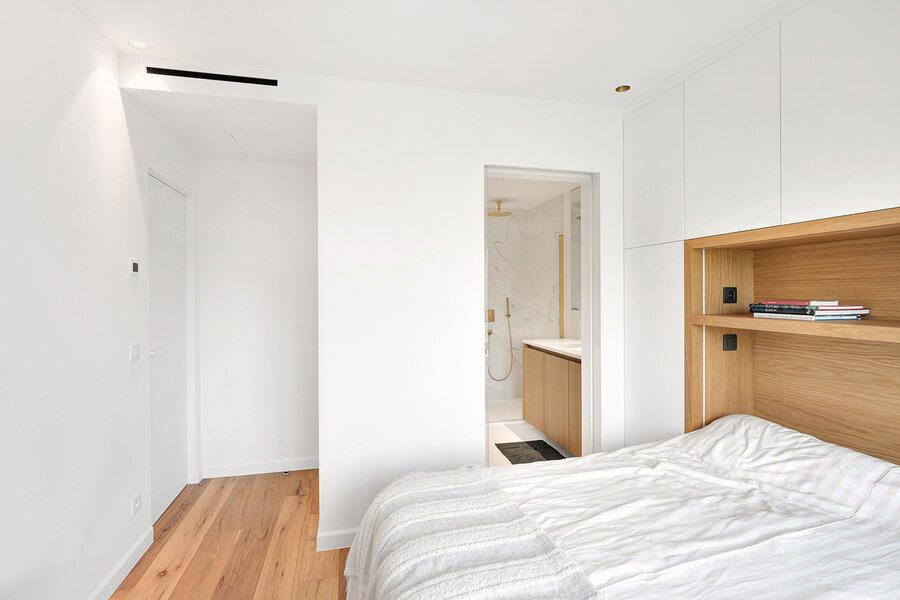 La chambre principale dispose d'armoires encastrées, d'une salle de bains attenante avec douche à l'italienne, lavabo et toilettes, ainsi que d'une terrasse privée. La deuxième chambre est également équipée d'armoires encastrées et dispose d'une salle de douche séparée.