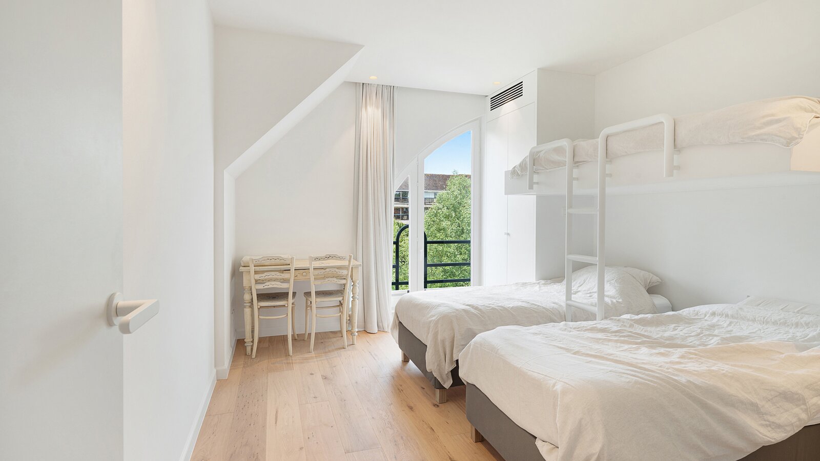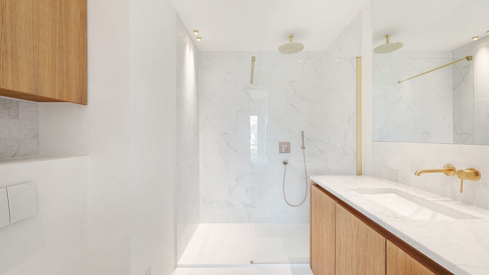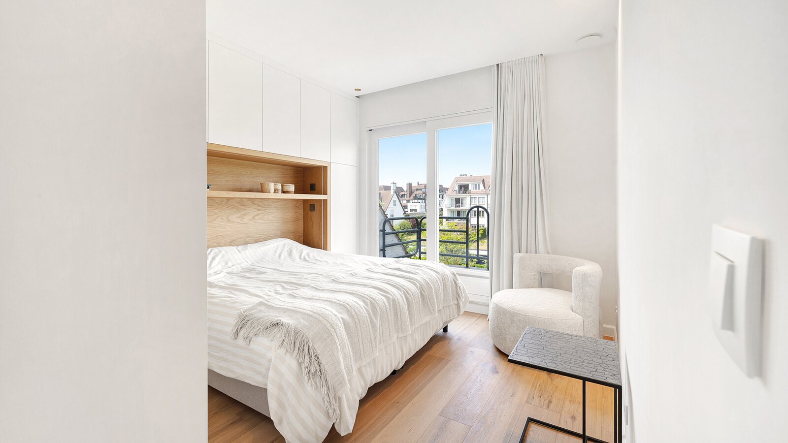 La chambre principale dispose d'armoires encastrées, d'une salle de bains attenante avec douche à l'italienne, lavabo et toilettes, ainsi que d'une terrasse privée. La deuxième chambre est également équipée d'armoires encastrées et dispose d'une salle de douche séparée.