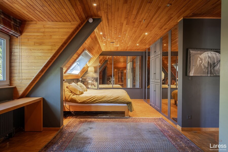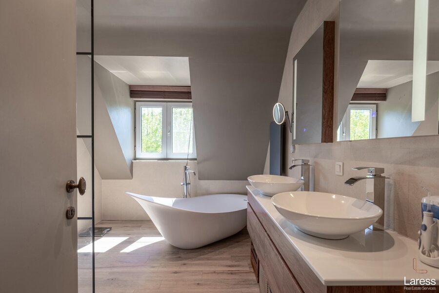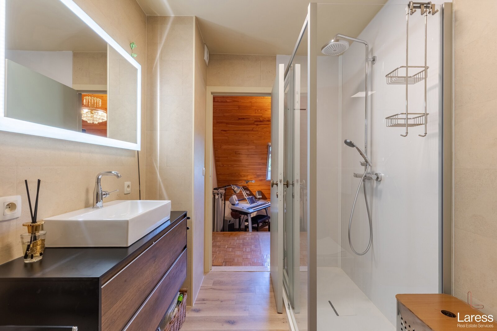 Via de traphal bereik je de ruime overloop en vier volwaardige slaapkamers op de eerste verdieping, allemaal voorzien van mozaïek parket. De masterbedroom is royaal en beschikt over een en-suite badkamer met vrijstaand bad, ruime inloopdouche, infraroodsauna en veel kastruimte. De overige slaapkamers delen een aparte badkamer met douche.