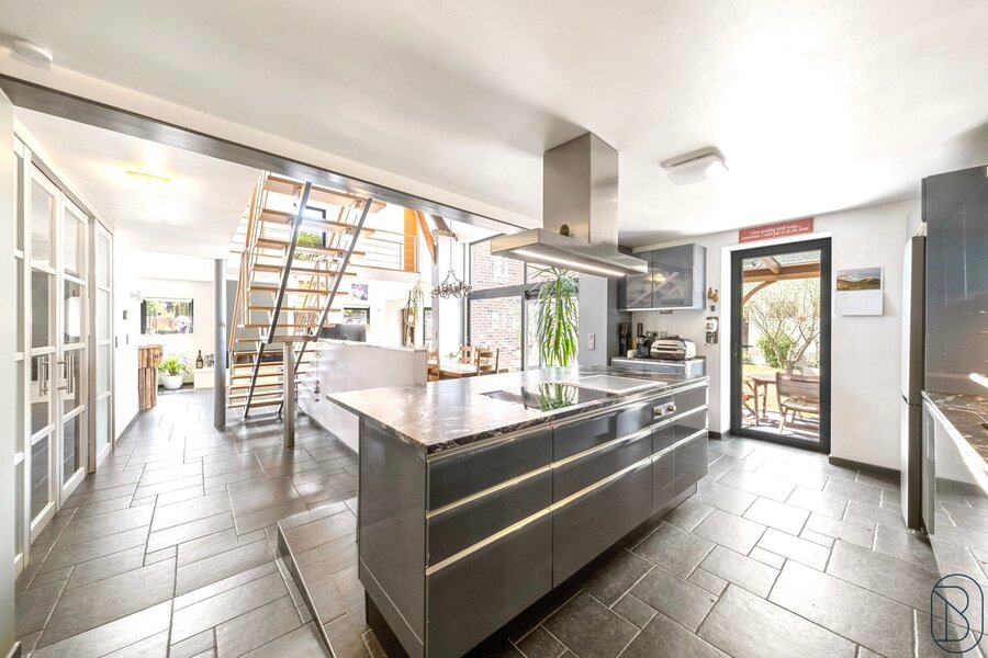Rez-de-chaussée : Un beau hall d’entrée avec vestiaire et WC séparé donnant sur un vaste living de 100 m² avec feu ouvert comprenant, une cuisine full équipée ouverte sur une salle à manger et un lumineux salon.