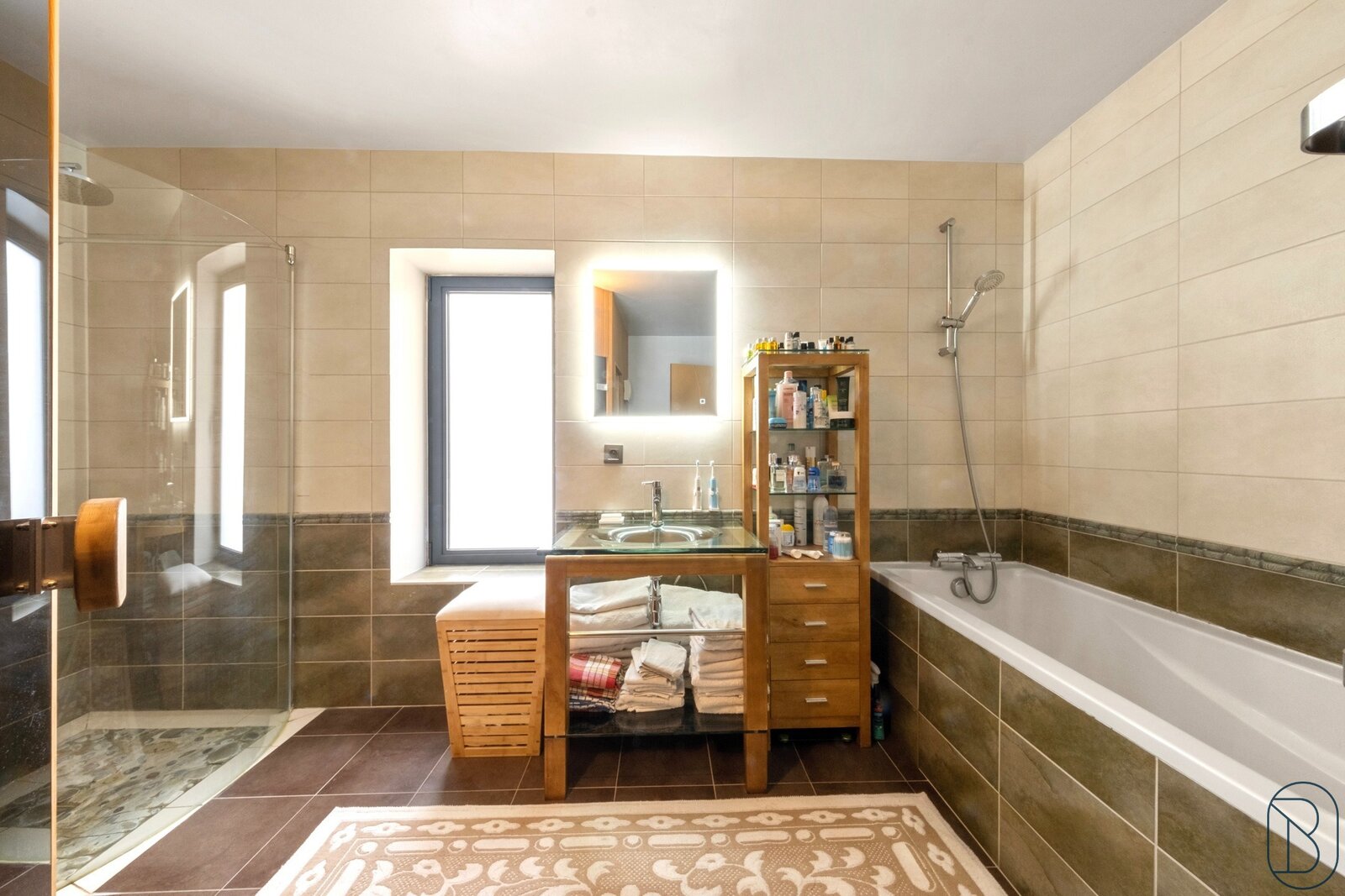 Une grande chambre complétée par une salle de bain moderne avec baignoire, sauna et douche à l'italienne. Idéale pour une suite parentale