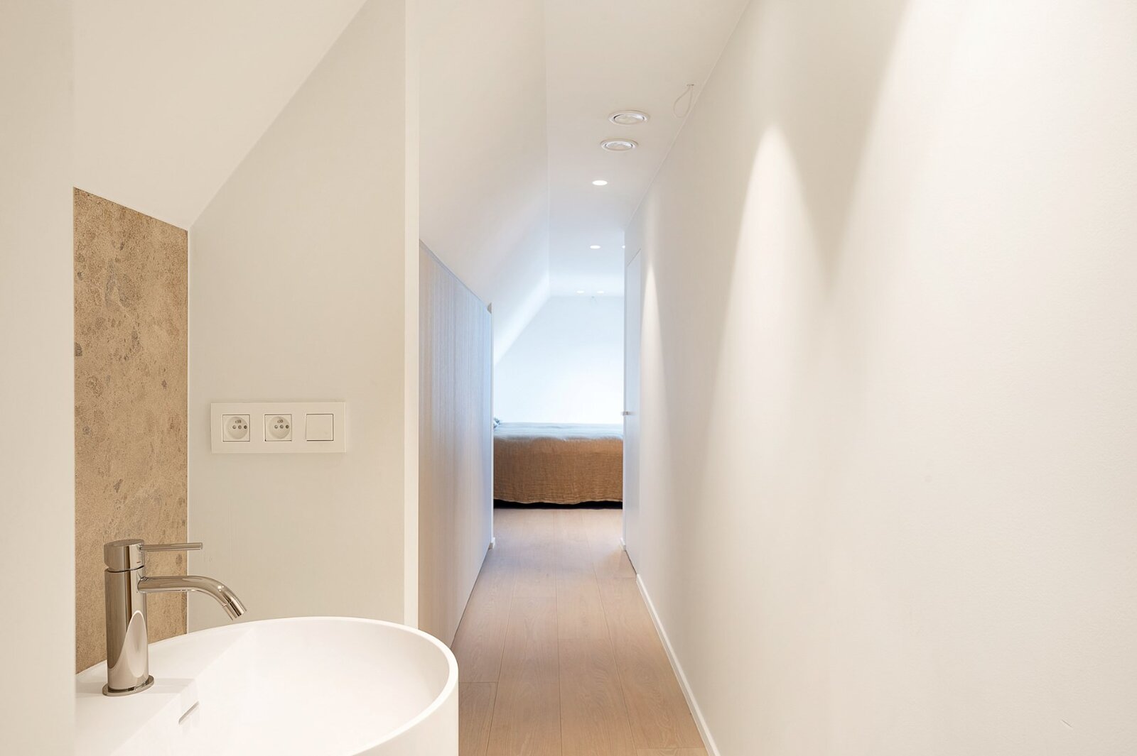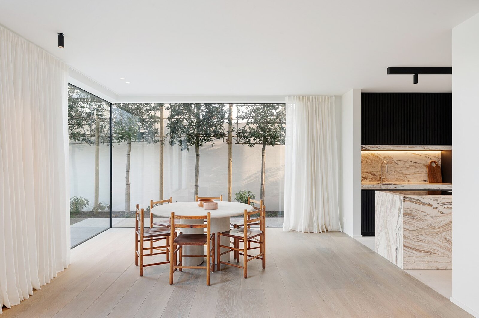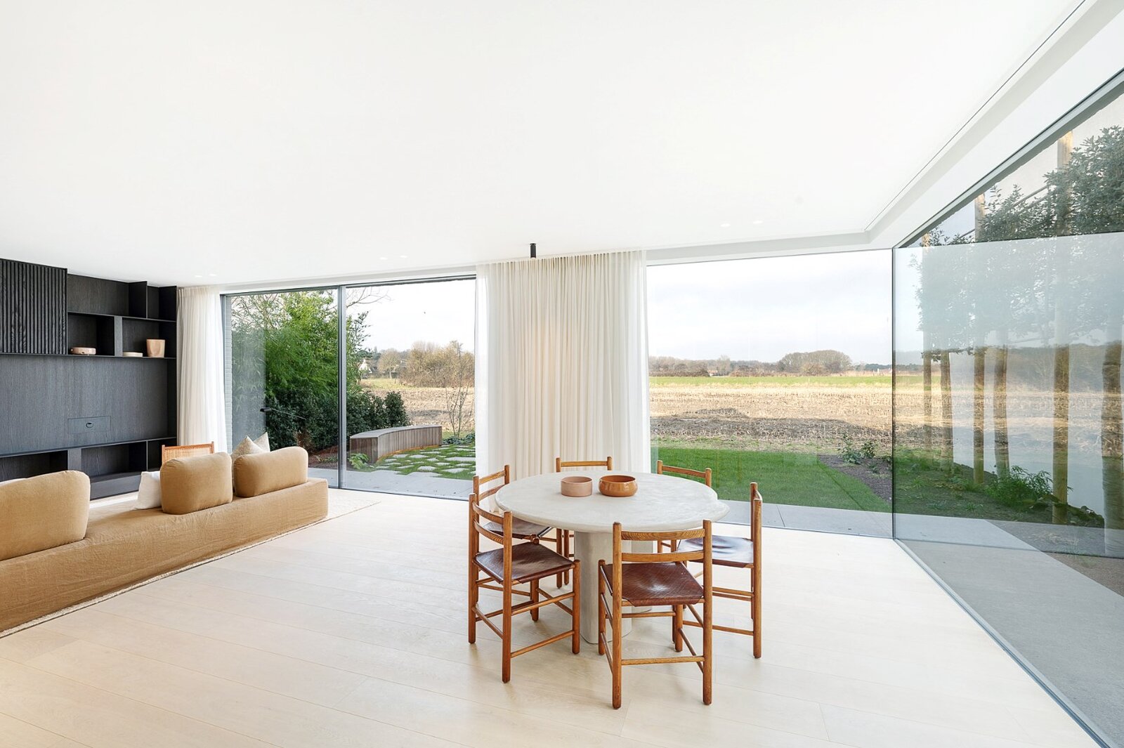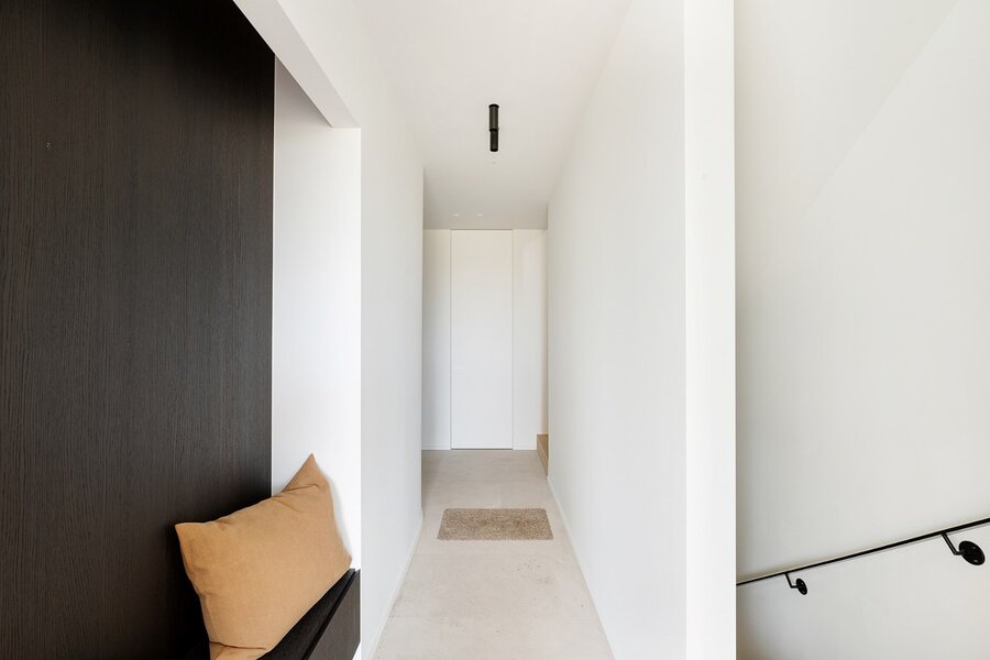Hall d'entrée spacieux avec vestiaire et toilettes invités. Espace de vie lumineux avec salon et salle à manger bénéficiant de minimal windows et d'une belle hauteur de plafond offrant des vues uniques sur les polders. Luxueuse cuisine ouverte avec coin petit-déjeuner.