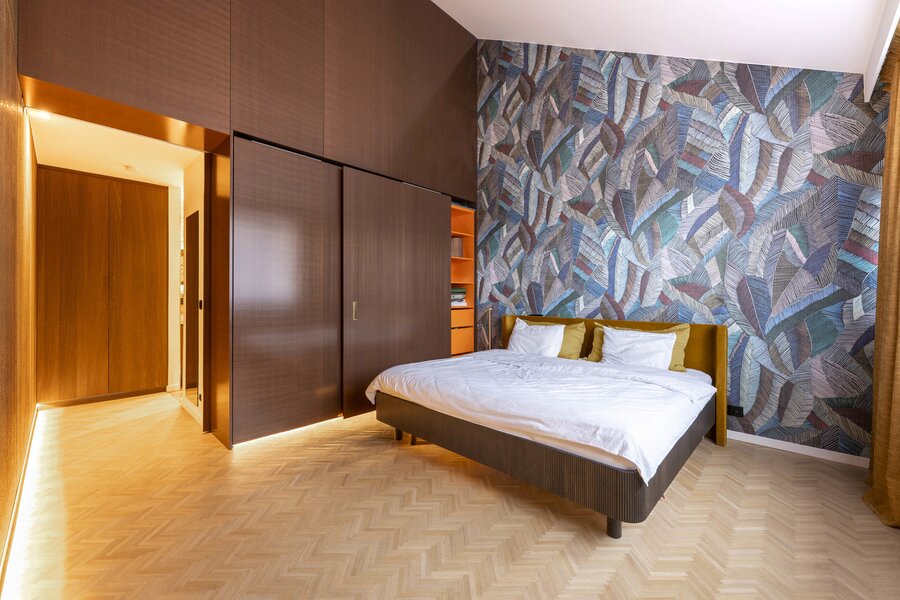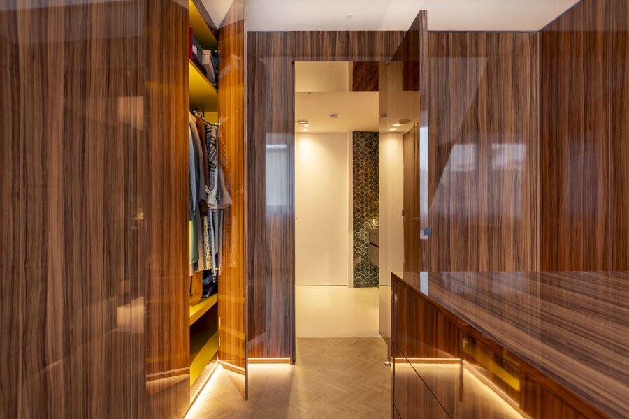 Ruime master met ingemaakt kastenwerk in walnootfineer. Ensuite badkamer met wastafel, toilet en ruime inloopdouch. De dressing is uitgevoerd in gelakte palisander.
