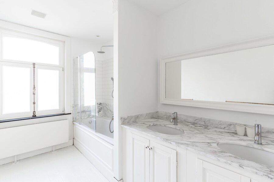 * Salle de bains +/- 4,3 m² (bains et meuble lavabo) (plancher)
