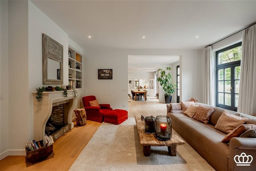 Royale inkomhal met gastentoilet leidt naar de lichte leefruimtes, met uitzicht op de tuin en het zwembad. De leefkamer bestaat uit twee gedeelten: een eet- en zitkamer met open haard, aangevuld met een knusse orangerie die baadt in het licht. Verder is er ook een tv- of bureaukamer, bereikbaar vanuit zowel de inkomhal als de woonkamer.